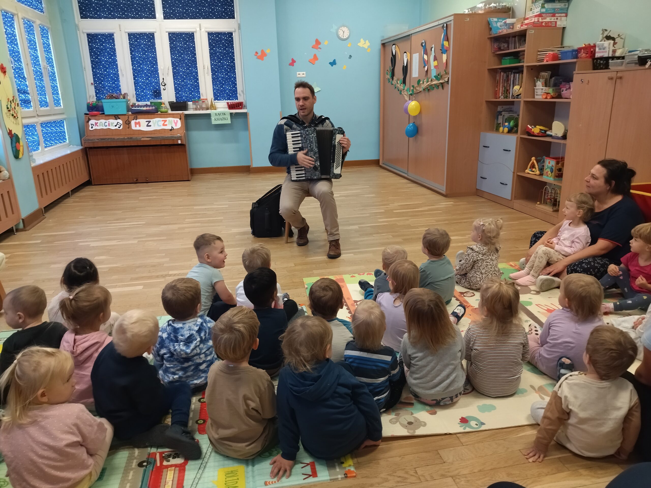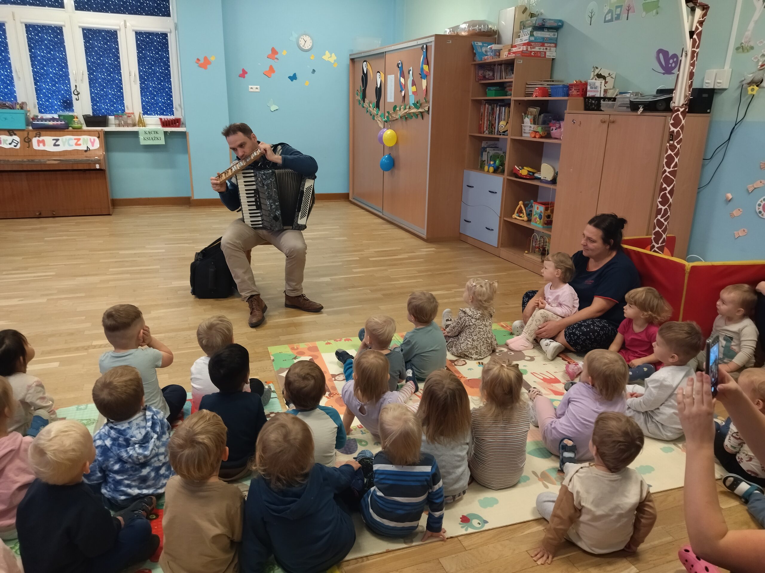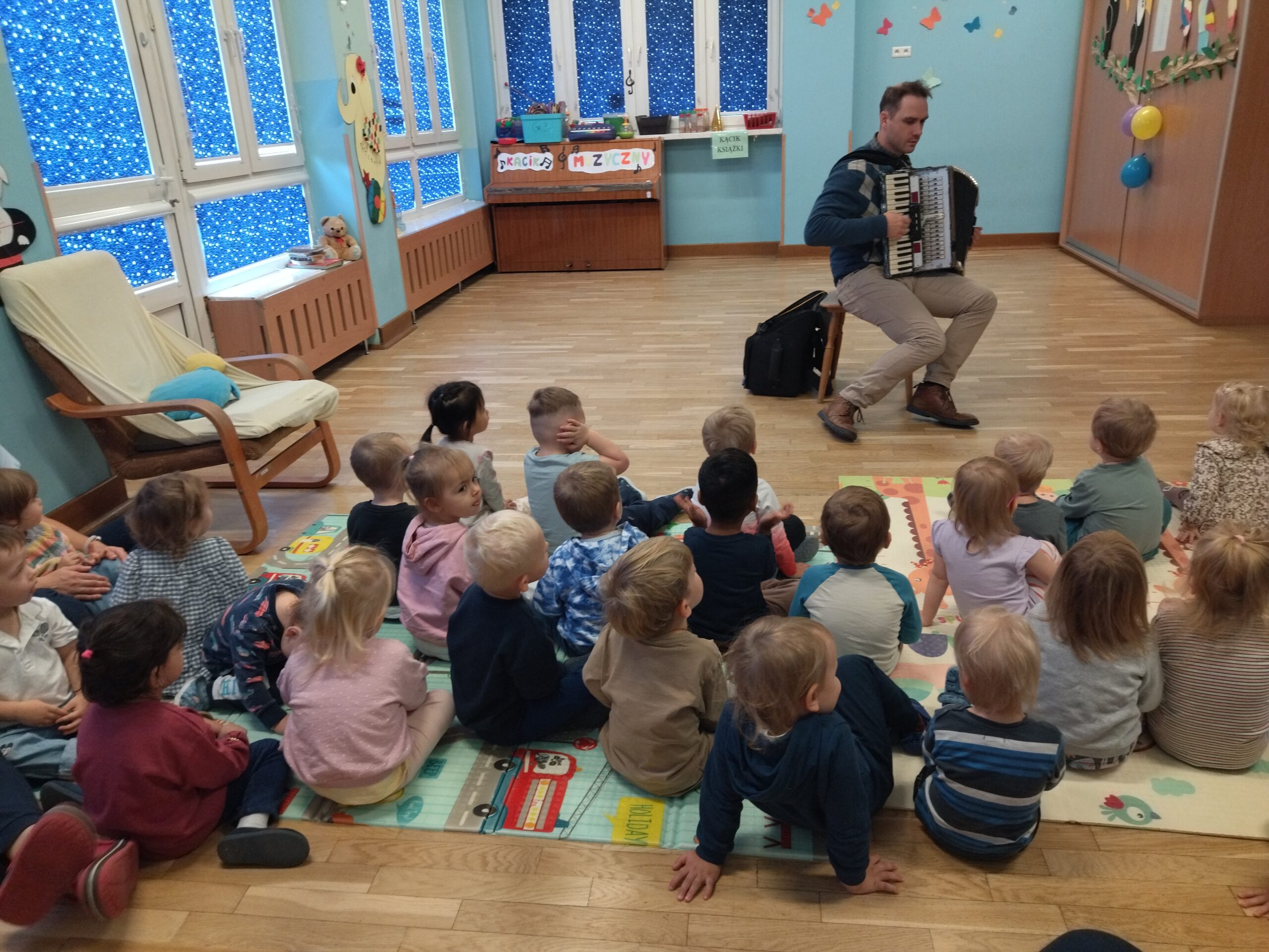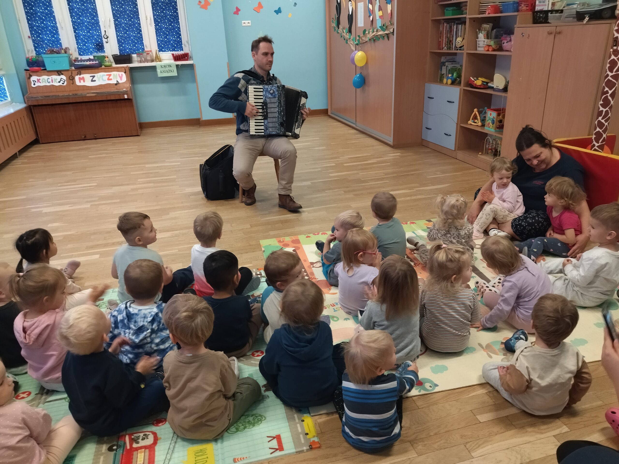 Dzieci z wszystkich grup świetnie się bawiły podczas zajęć muzycznych z wykorzystaniem akordeonu, prowadzonych przez profesjonalnego muzyka.