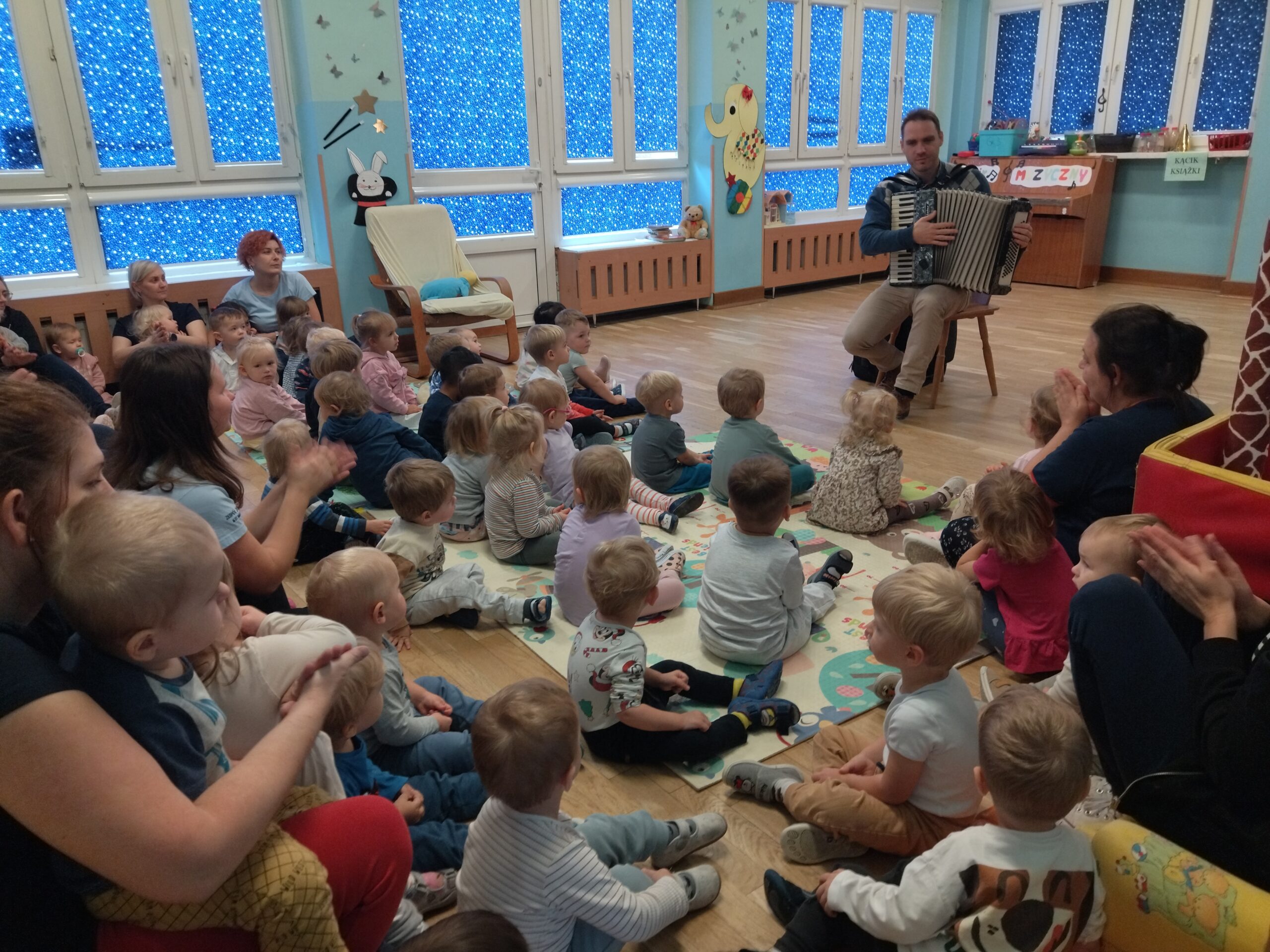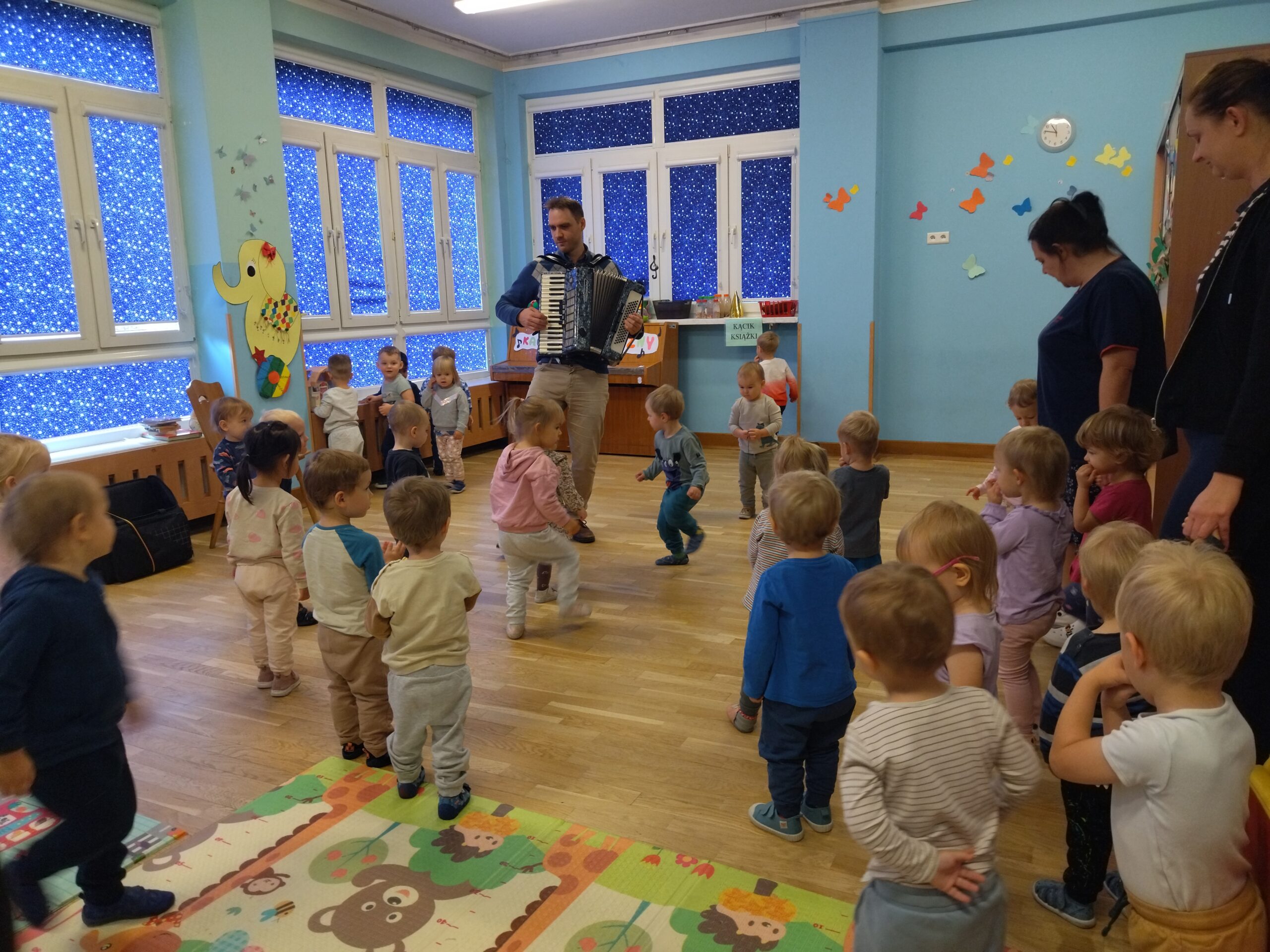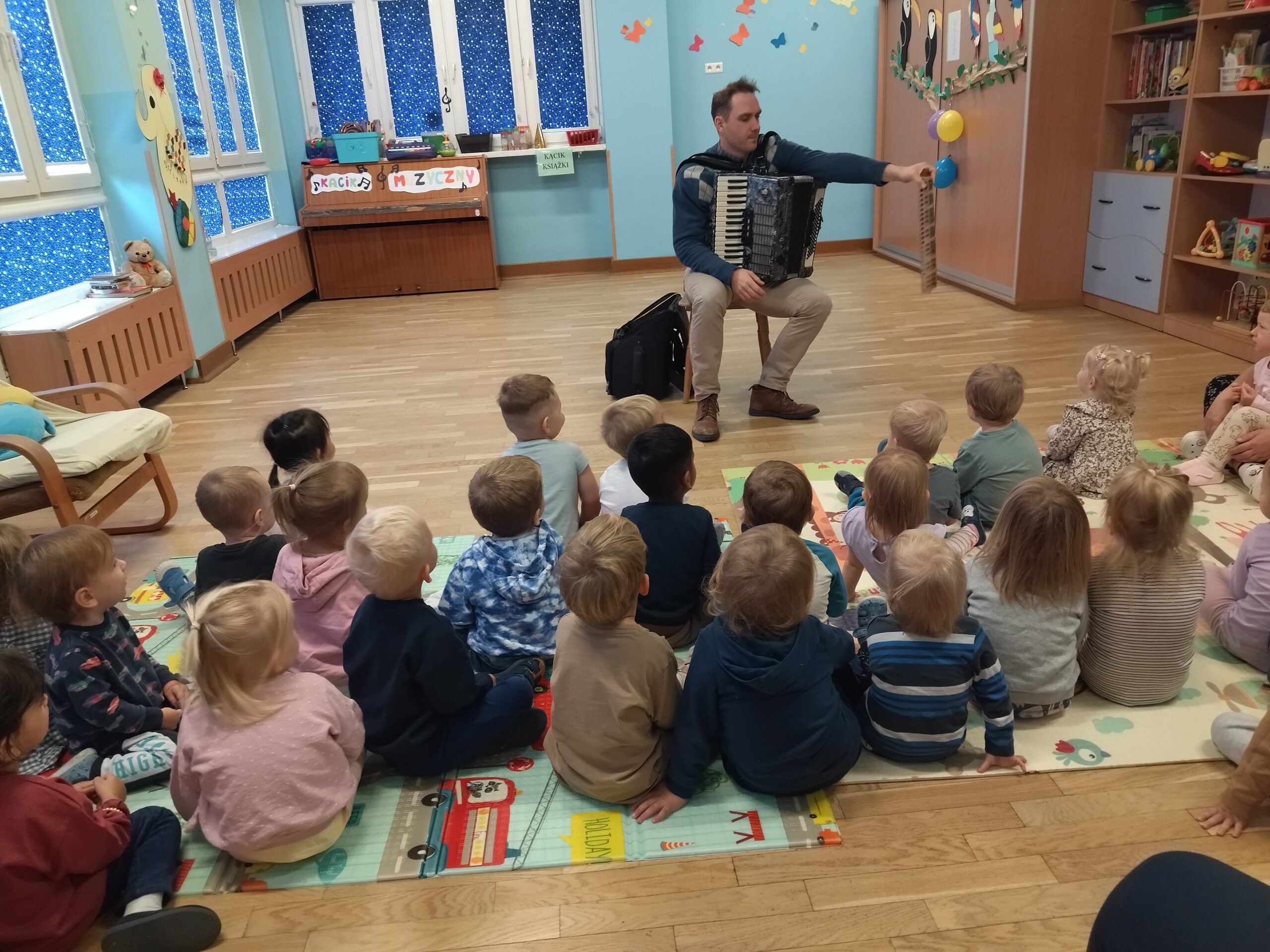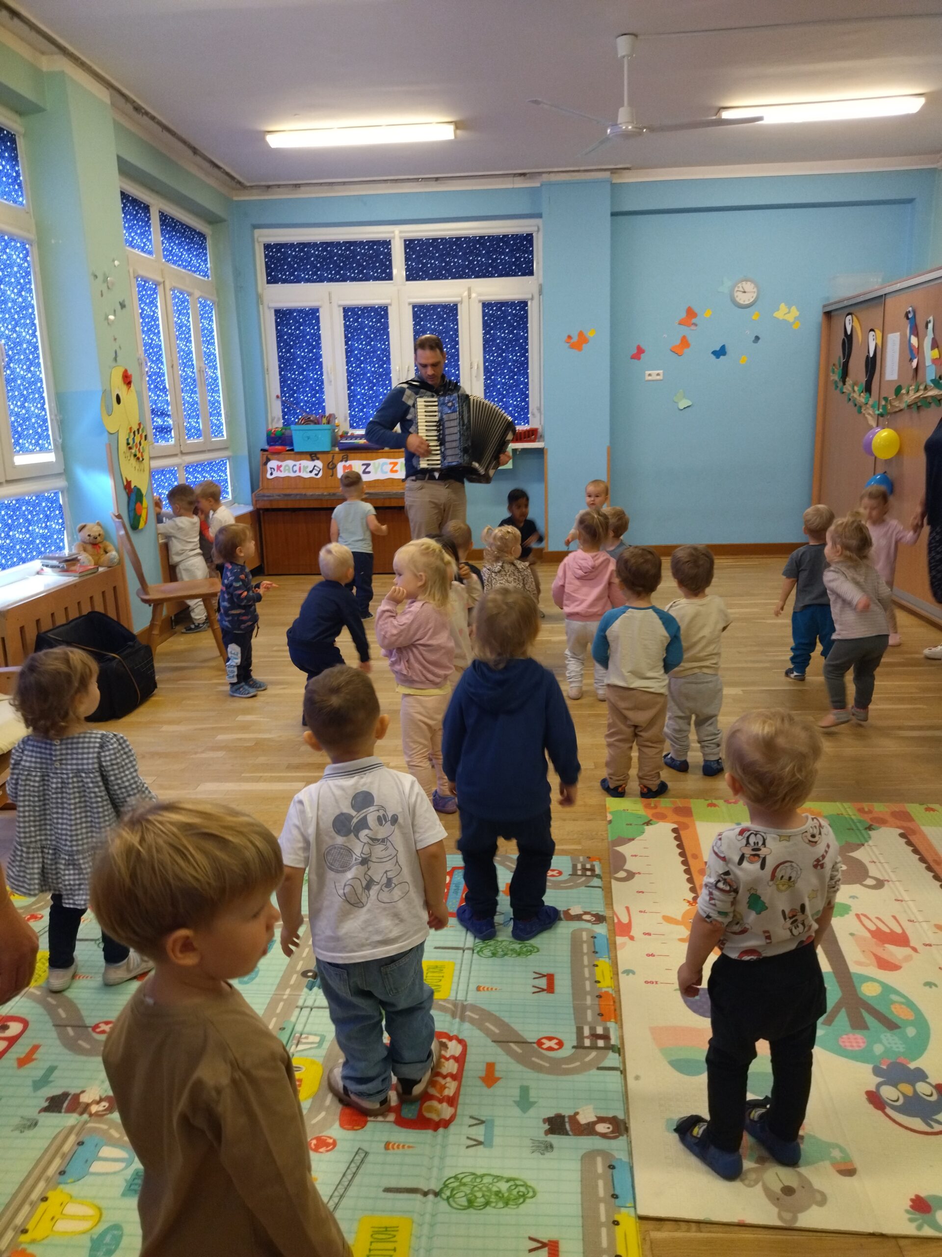 Dzieci z wszystkich grup świetnie się bawiły podczas zajęć muzycznych z wykorzystaniem akordeonu, prowadzonych przez profesjonalnego muzyka.