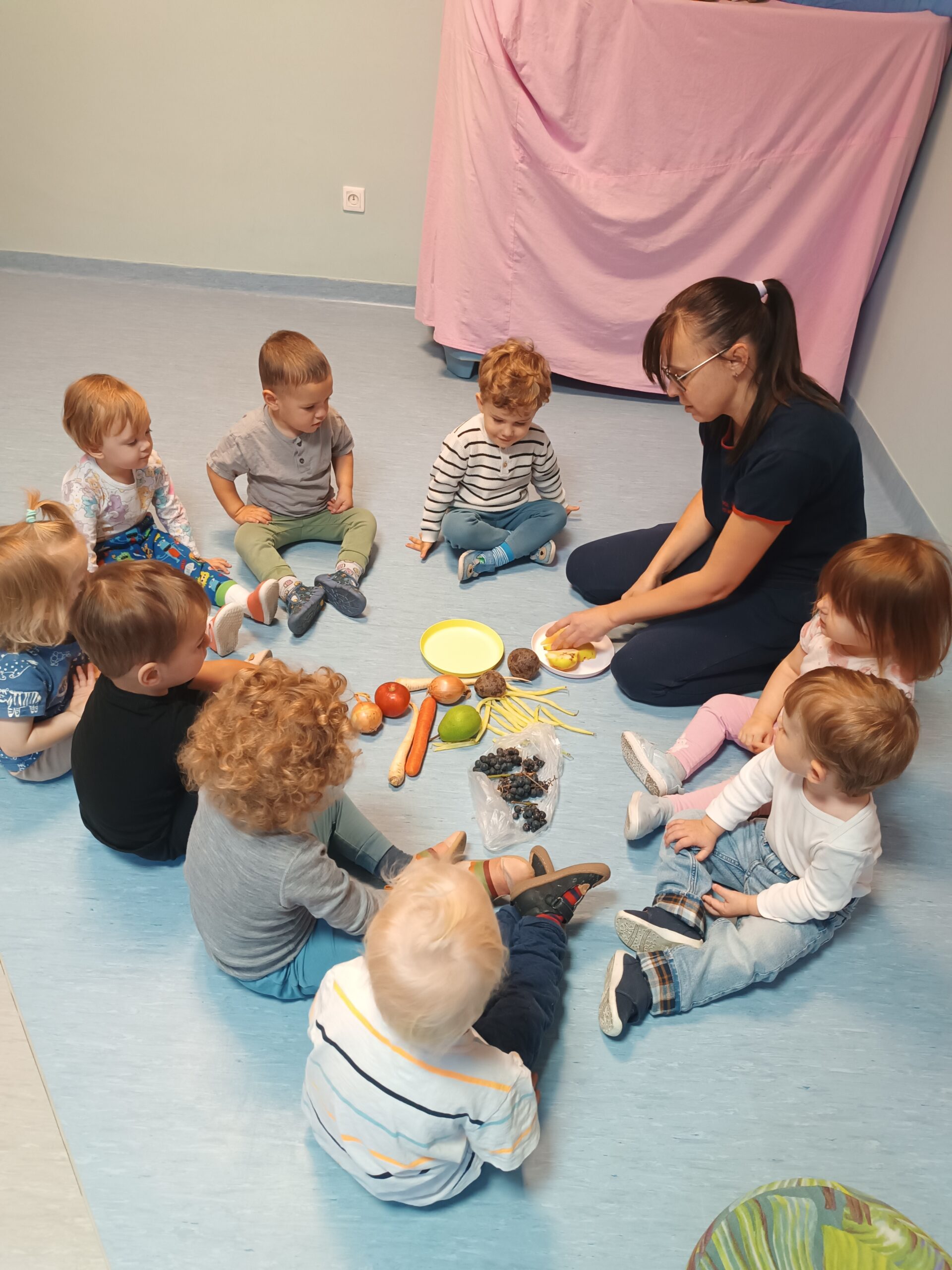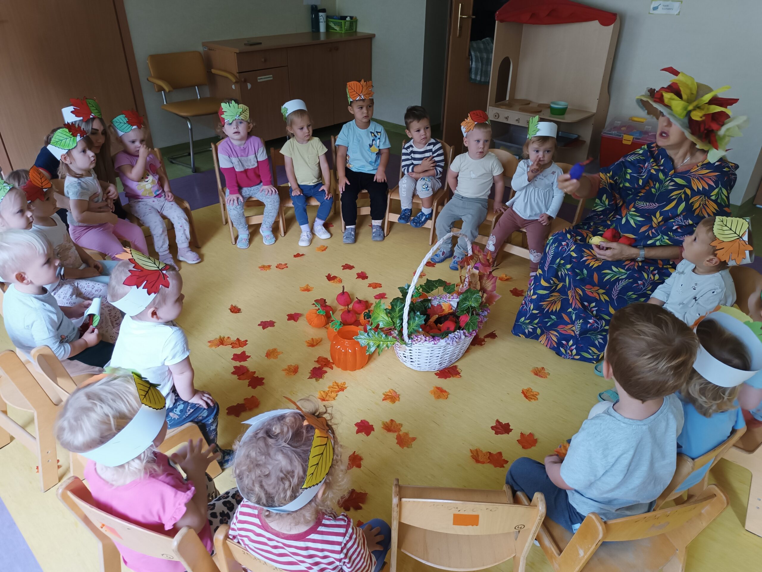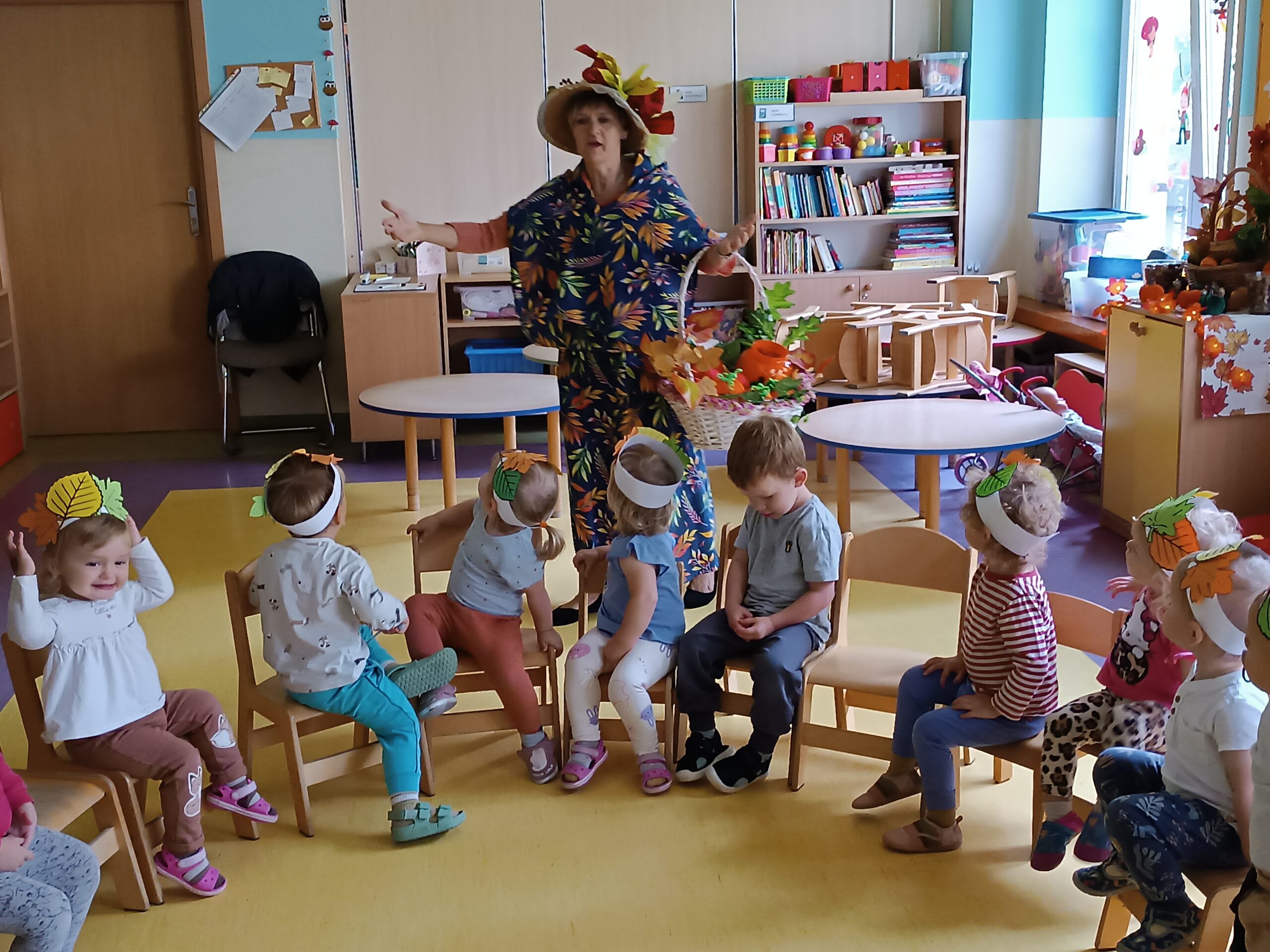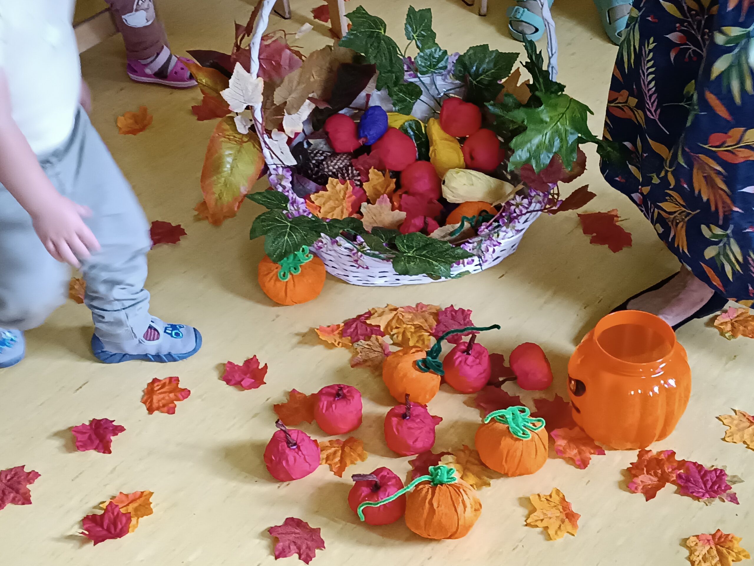 - Odwiedziła nas Pani Jesień, która przyniosła ze sobą wiele darów: kolorowe liście, kasztany, żołędzie. Pani Jesień zaprosiła dzieci do zabawy i tańców.