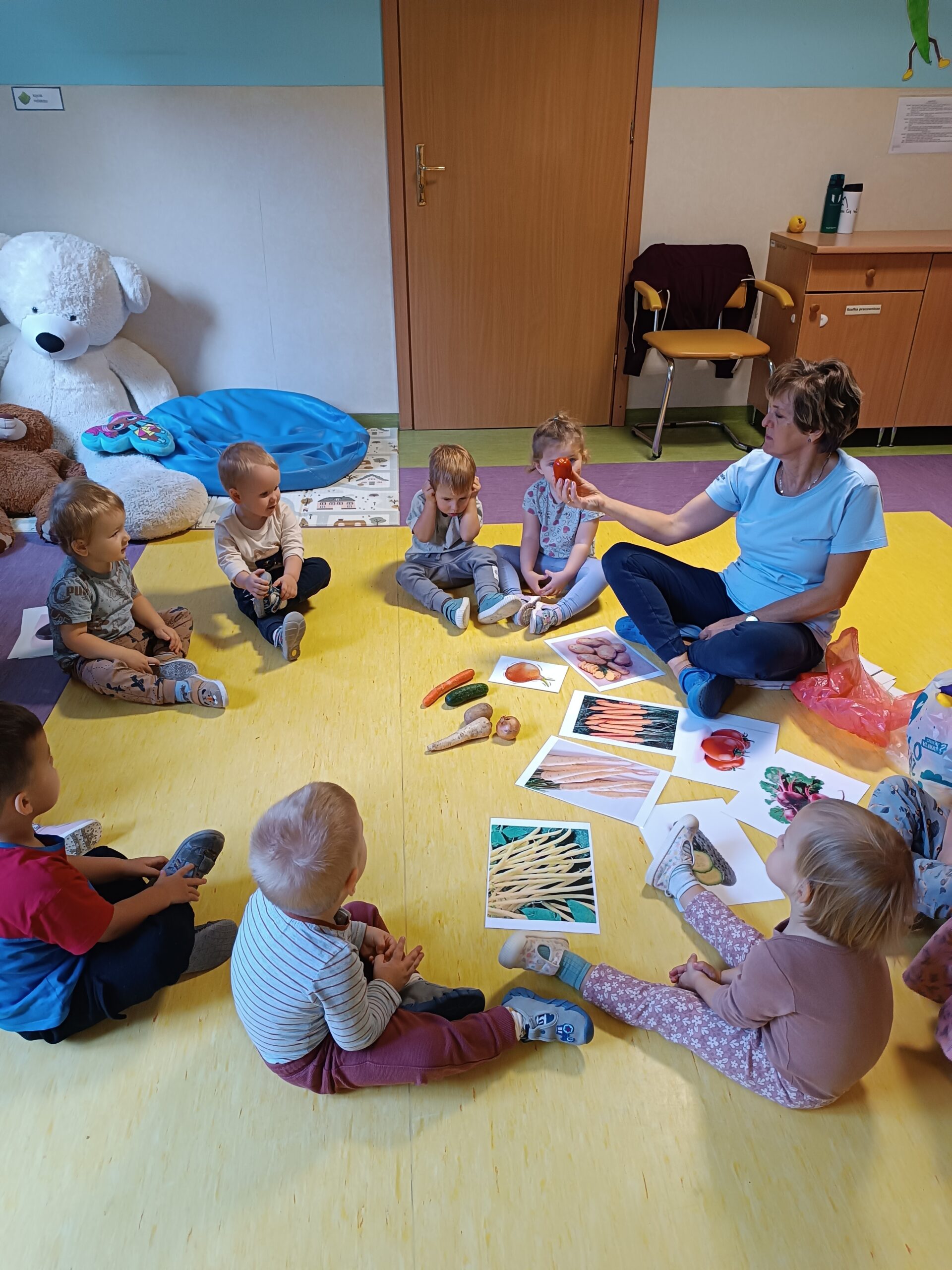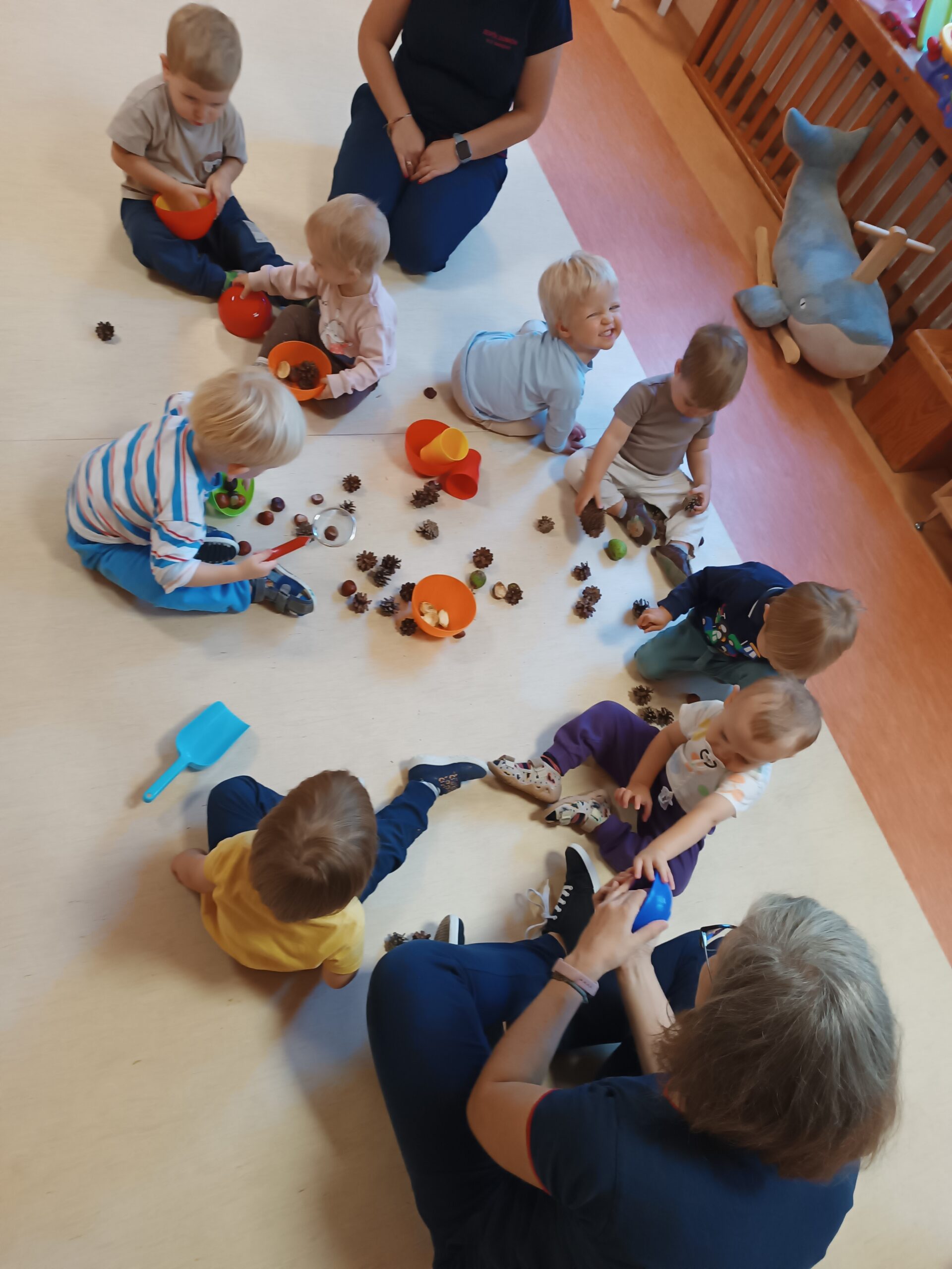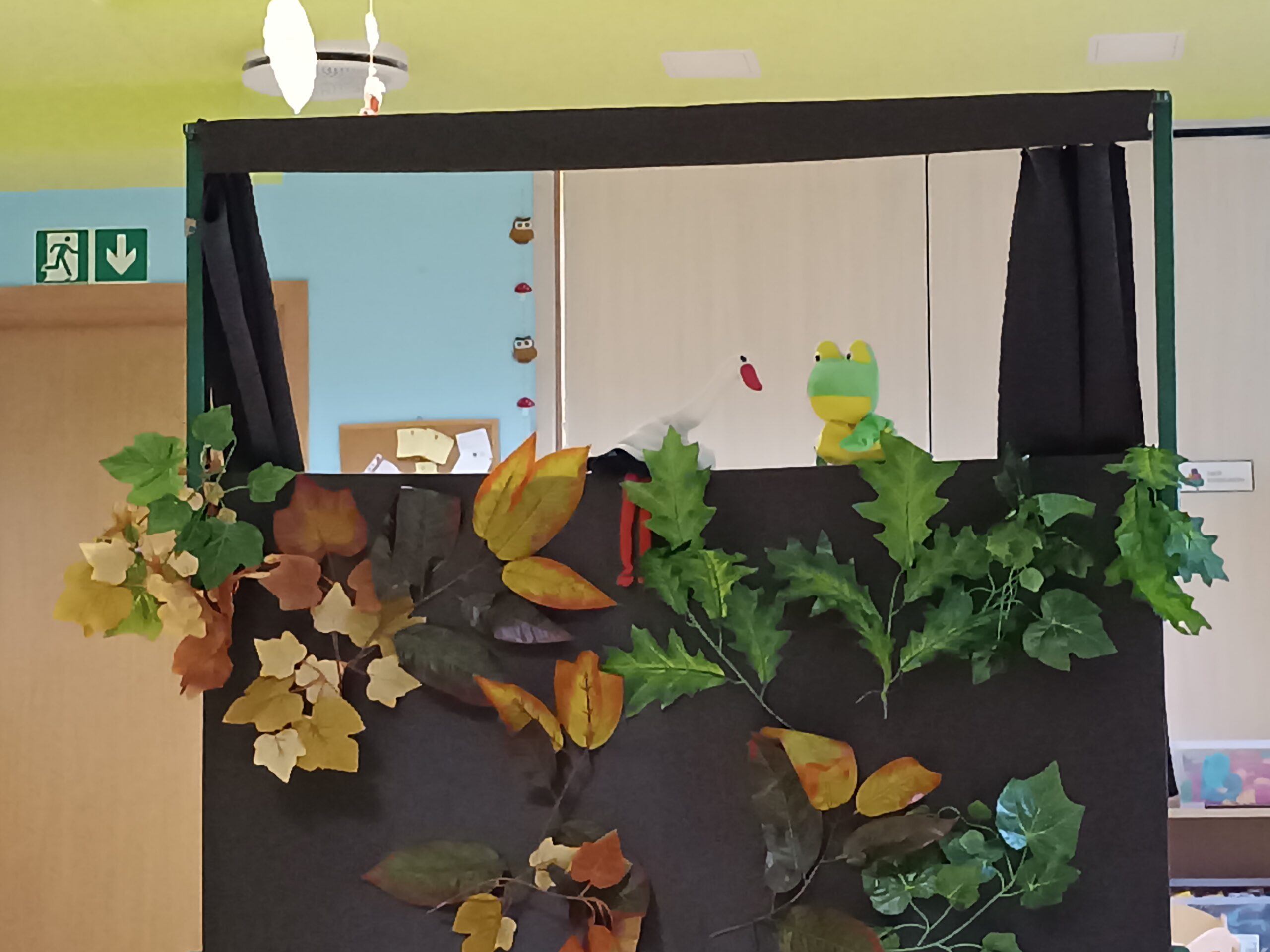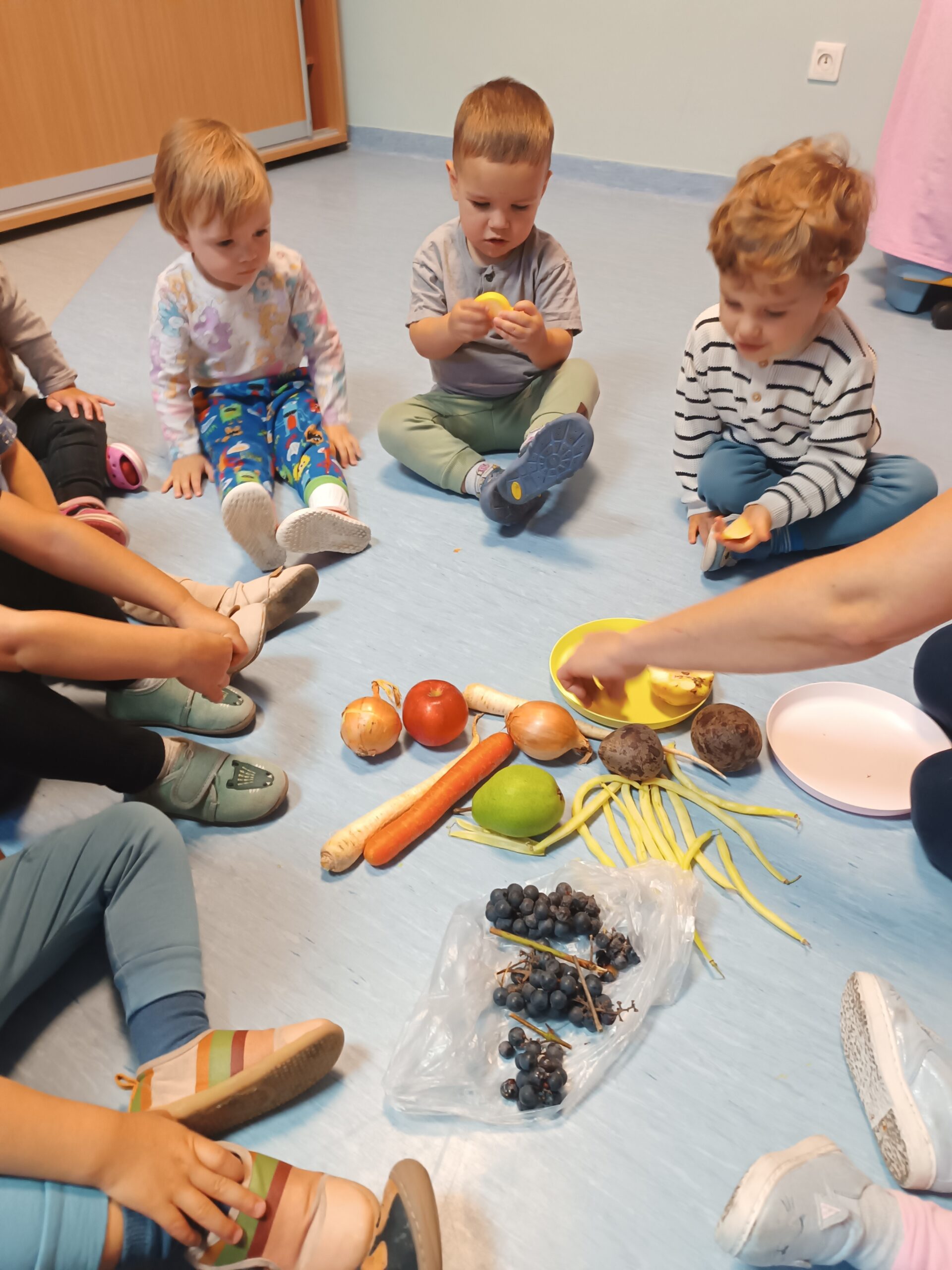 - Odwiedziła nas Pani Jesień, która przyniosła ze sobą wiele darów: kolorowe liście, kasztany, żołędzie. Pani Jesień zaprosiła dzieci do zabawy i tańców.