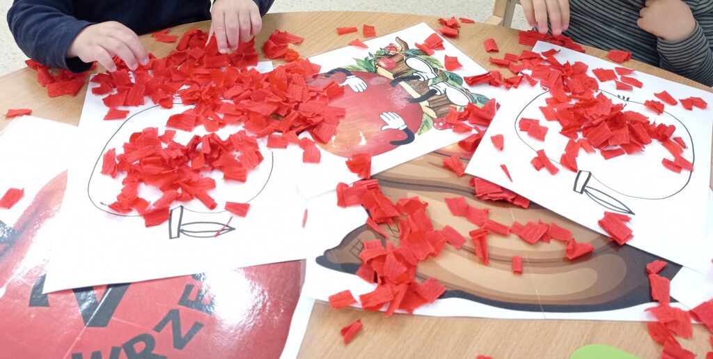 Ten wyjątkowy czas adaptacji, to dla wielu maluszków pierwszy krok w stronę żłobkowej przygody. Z radością obserwowaliśmy, jak dzieci z każdym dniem czują się coraz pewniej, poznają siebie nawzajem, a także otaczający je świat. Dzieci brały udział w licznych zajęciach artystycznych, tworząc prace plastyczne, obchodziły Dzień Jabłka, uczestniczyły w wykopkach oraz świętowały Dzień Kropki i przygotowywały się na odwiedziny Pani Jesieni. Był to czas budowania relacji, rozwijania zmysłów i pierwszych wspólnych żłobkowych przeżyć.
