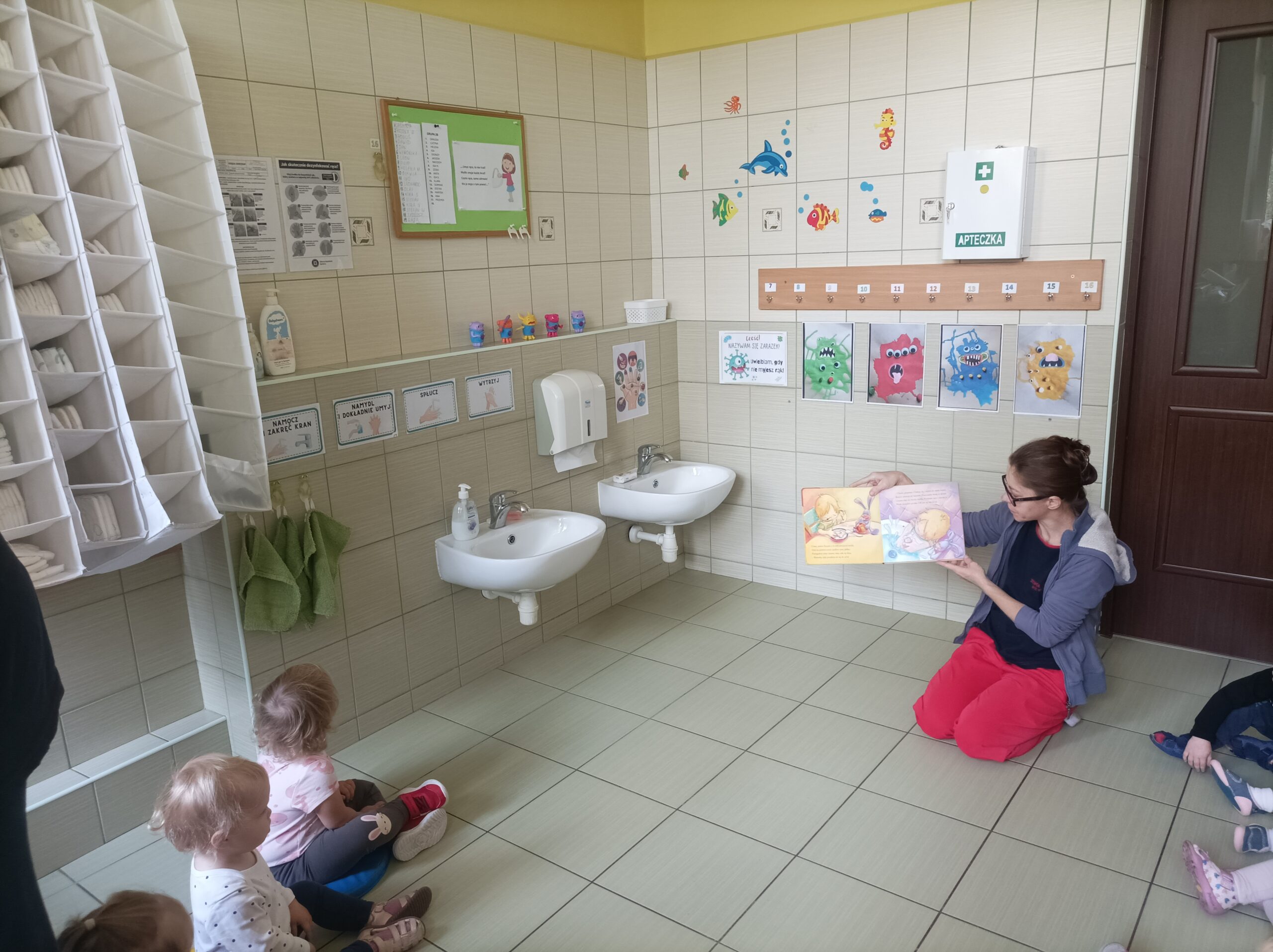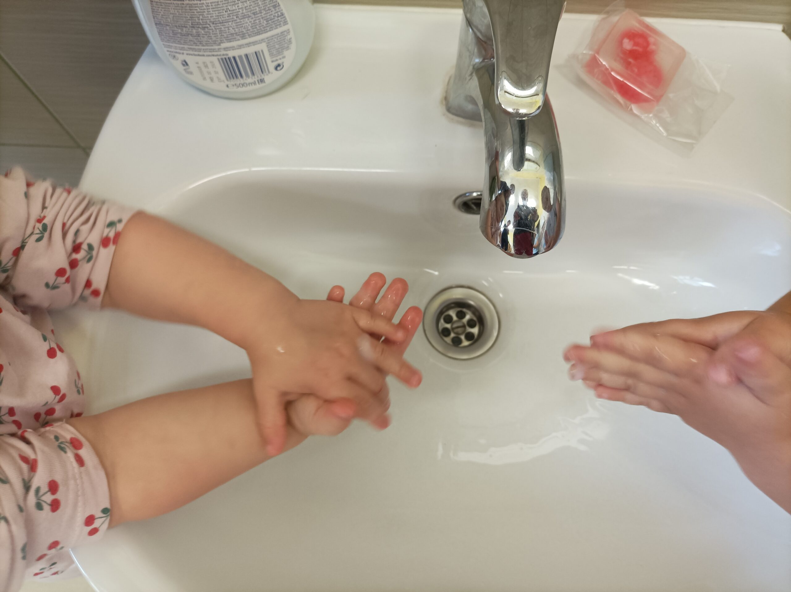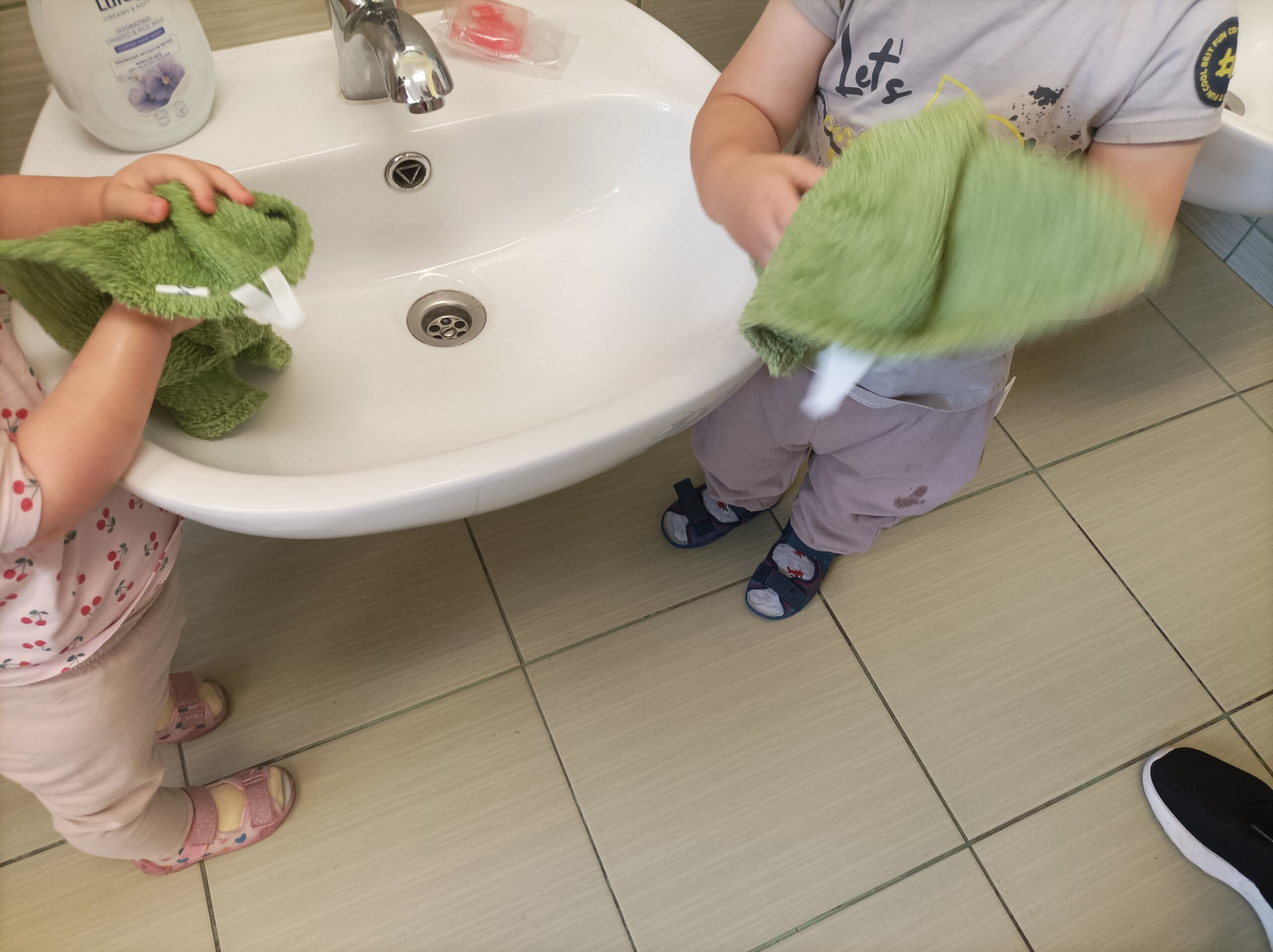 Uczymy się również samodzielności (w zależności od grupy) np. zdejmowania i zakładania kapci, schodzenia i wchodzenia po schodach, korzystania z nocniczka lub sedesu, przysuwania krzesełka do stoliczka po skończonym posiłku lub zabawie. 15 X obchodzimy Światowy Dzień Mycia Rąk. Poznajemy przedmioty o różnych fakturach – gładkie, szorstkie, miękkie itp. np. mech, kolce kasztanów, listki.
