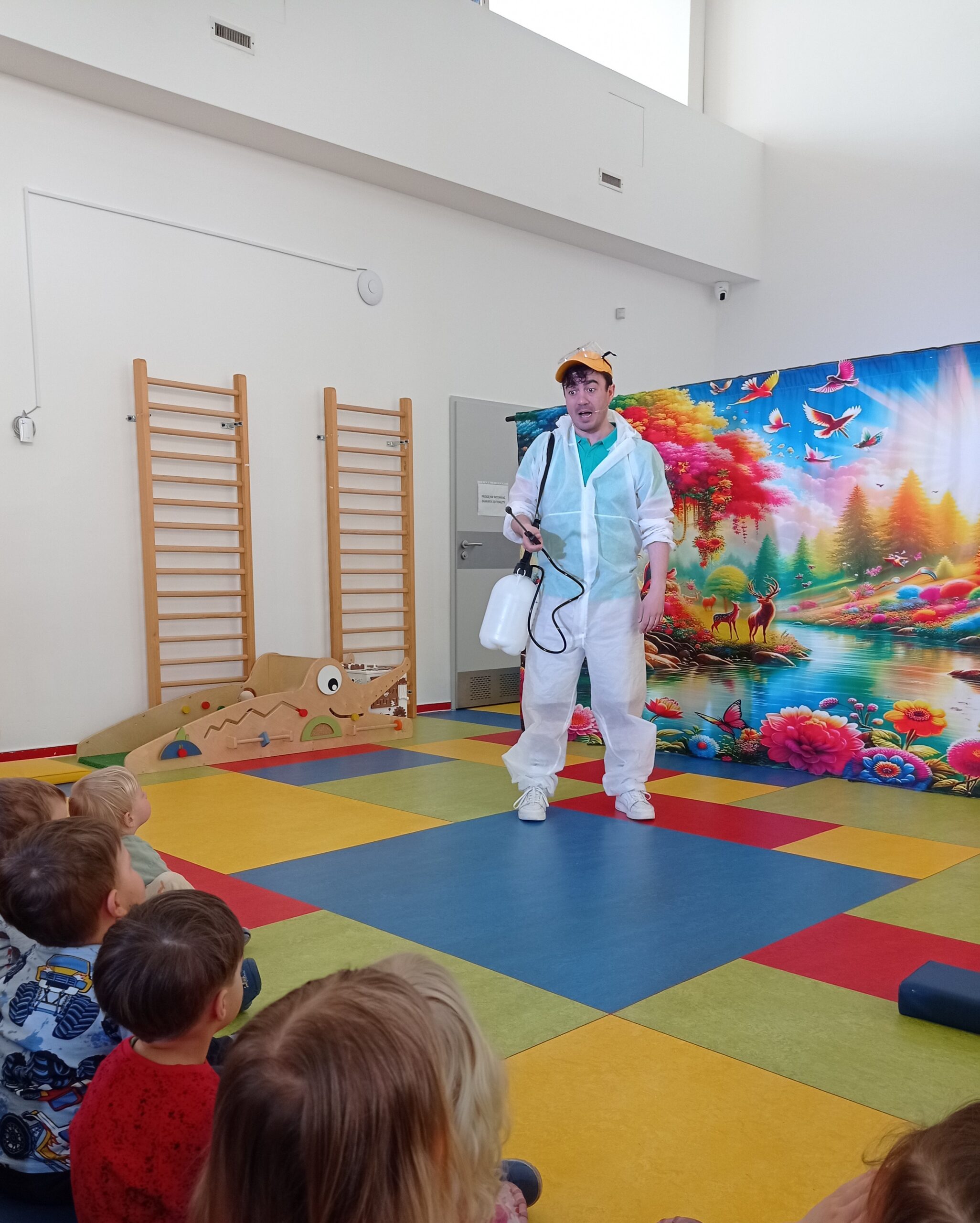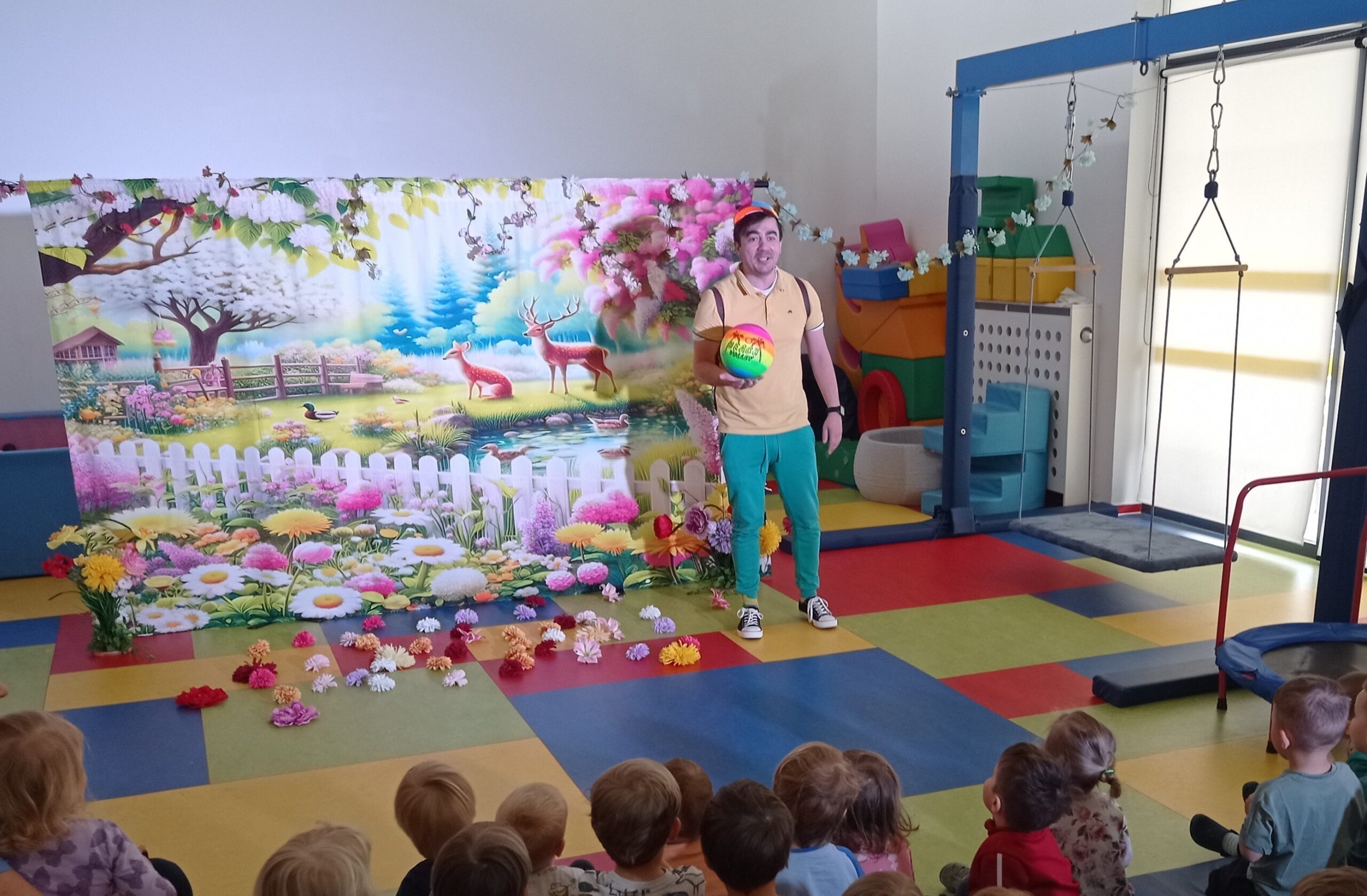 Dużo naszych aktywności związanych było z tematem wiosny. Dzieci skakały jak żabki, stawały jak bociany oraz „latały” jak pszczółki. Wykonywały wiosenne prace plastyczne, które umożliwiły im oswoić się z poruszanymi tematami: jakie są kolory tęczy, co się dzieje na majowej łączce czy jak dzielnie pracują pszczółki.