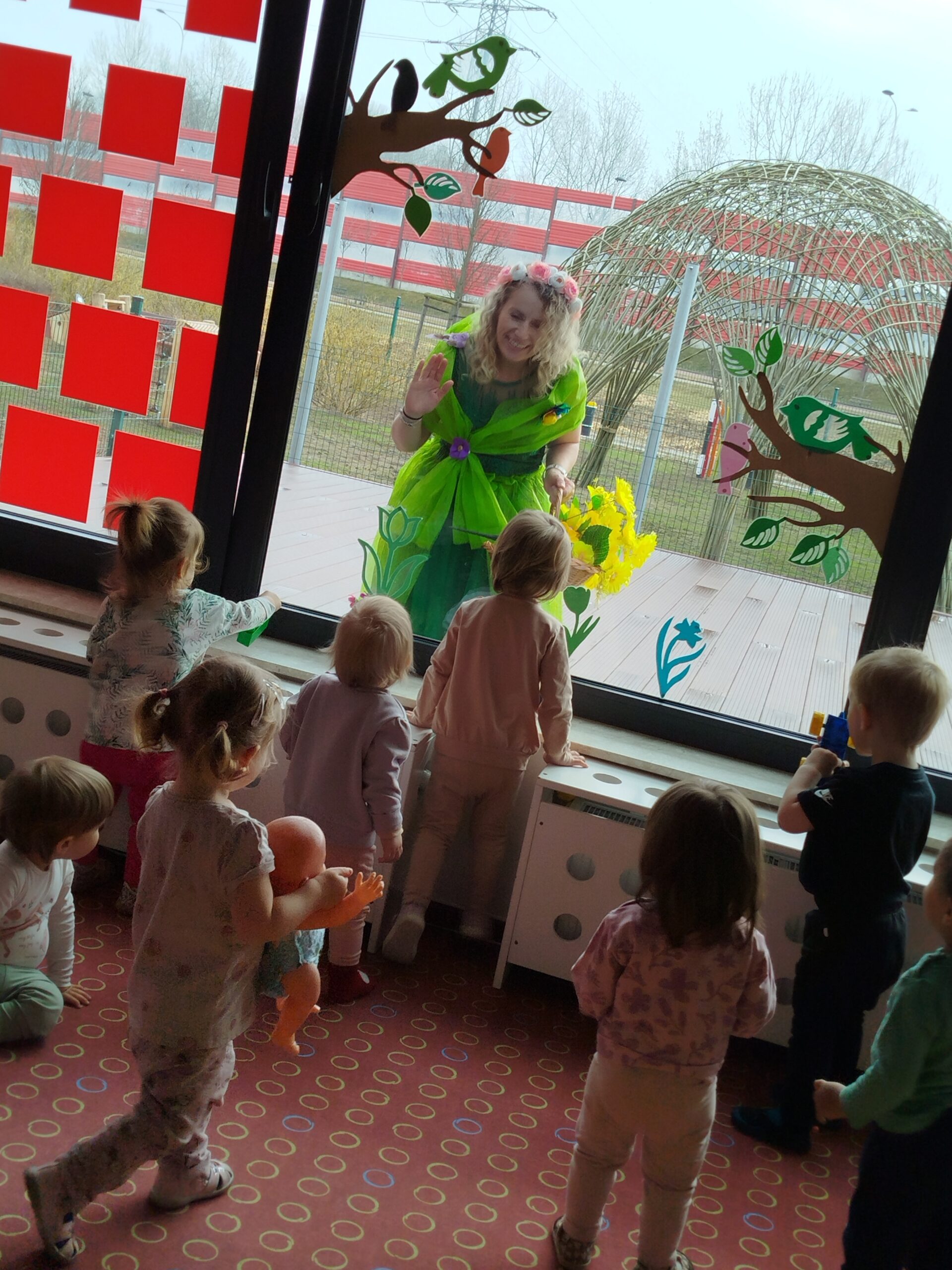 Wkrótce odwiedziła nas także Pani Wiosna. W tę wyjątkową postać wcieliła się opiekunka Kasia z grupy żółtej, która przyszła do każdej grupy przebrana i przyniosła ze sobą kolorowe kwiaty oraz śpiewające ptaszki. Spotkanie sprawiło naszym wychowankom wiele radości i było okazją do wspólnych rozmów o wiośnie.