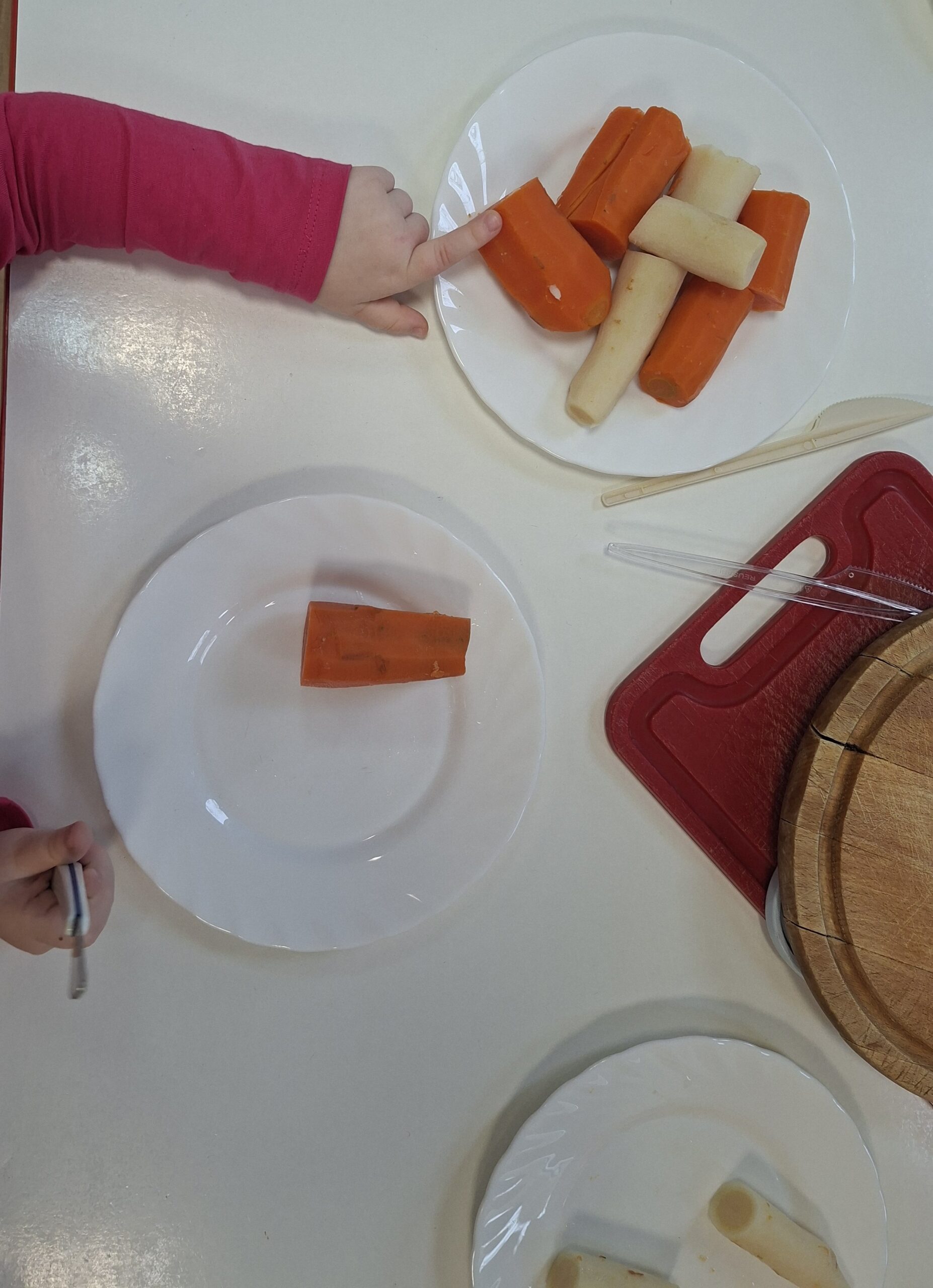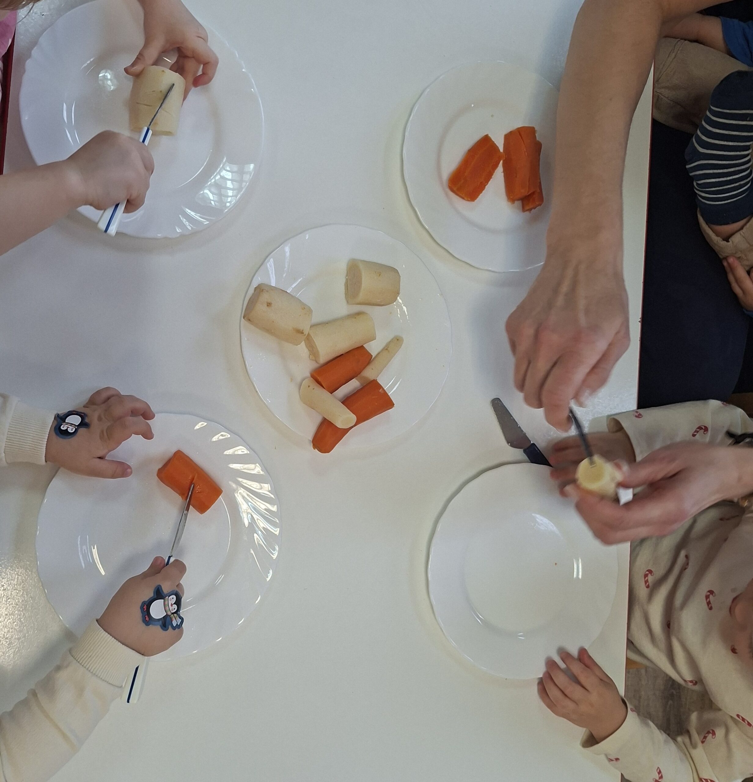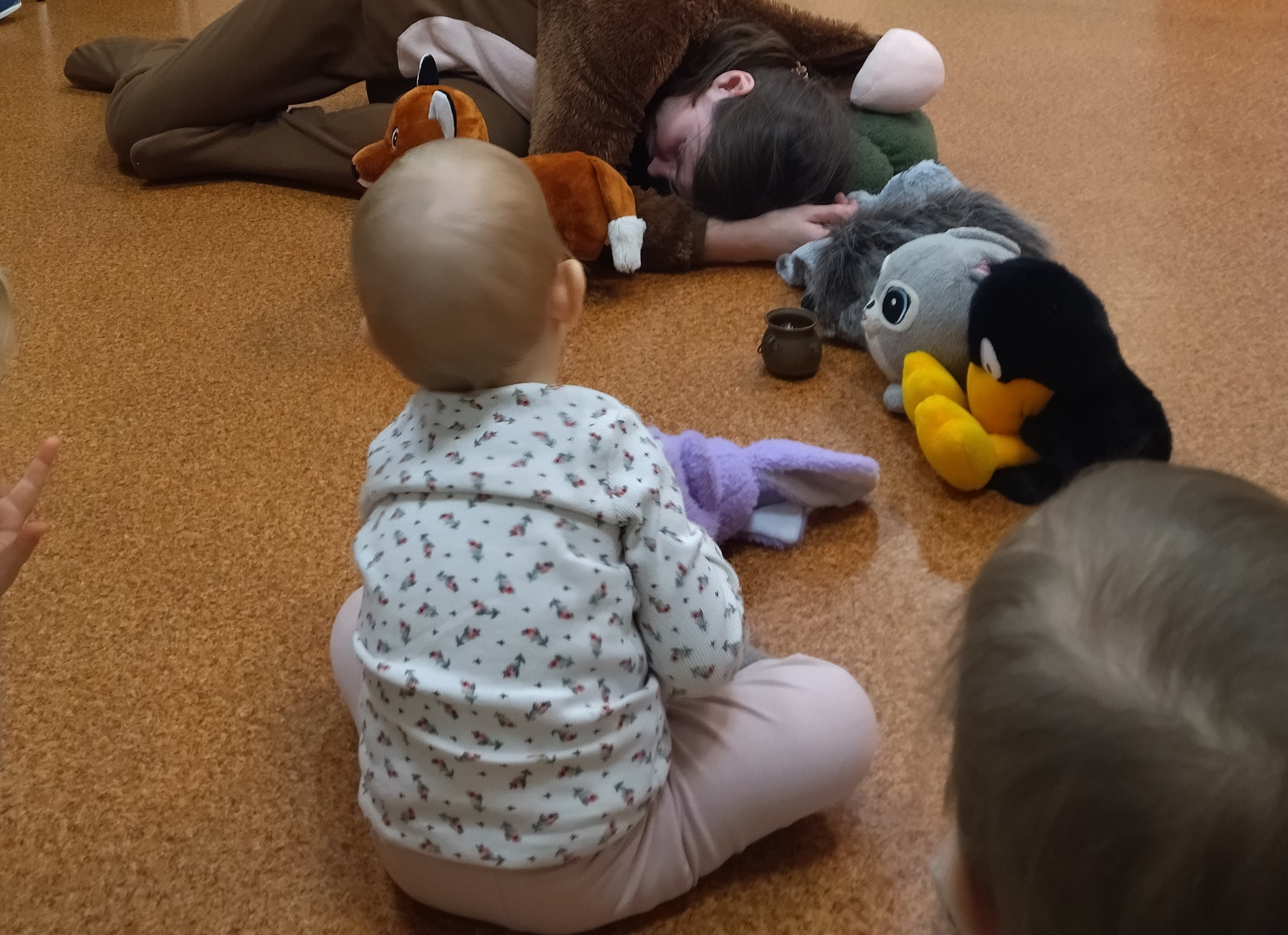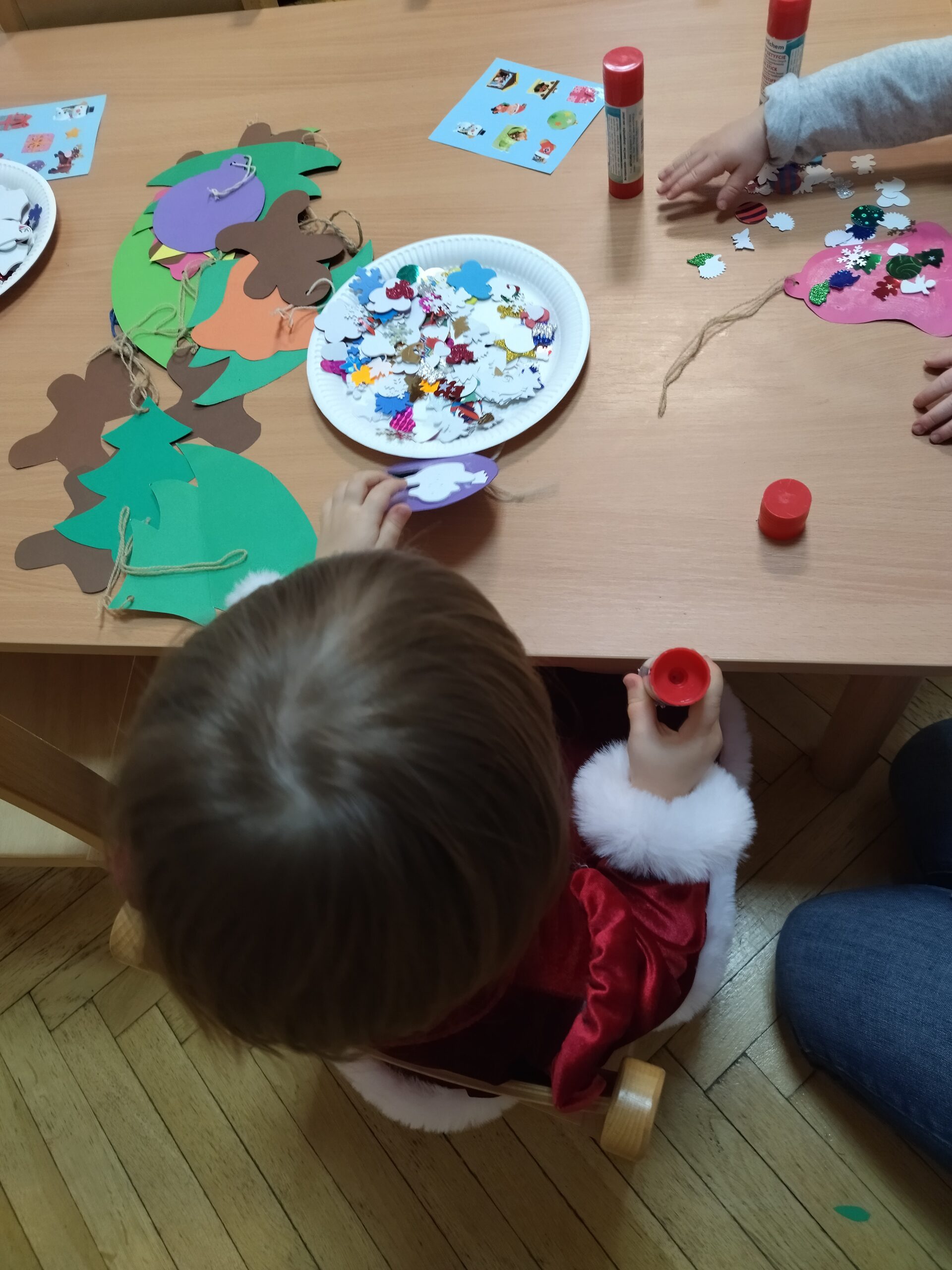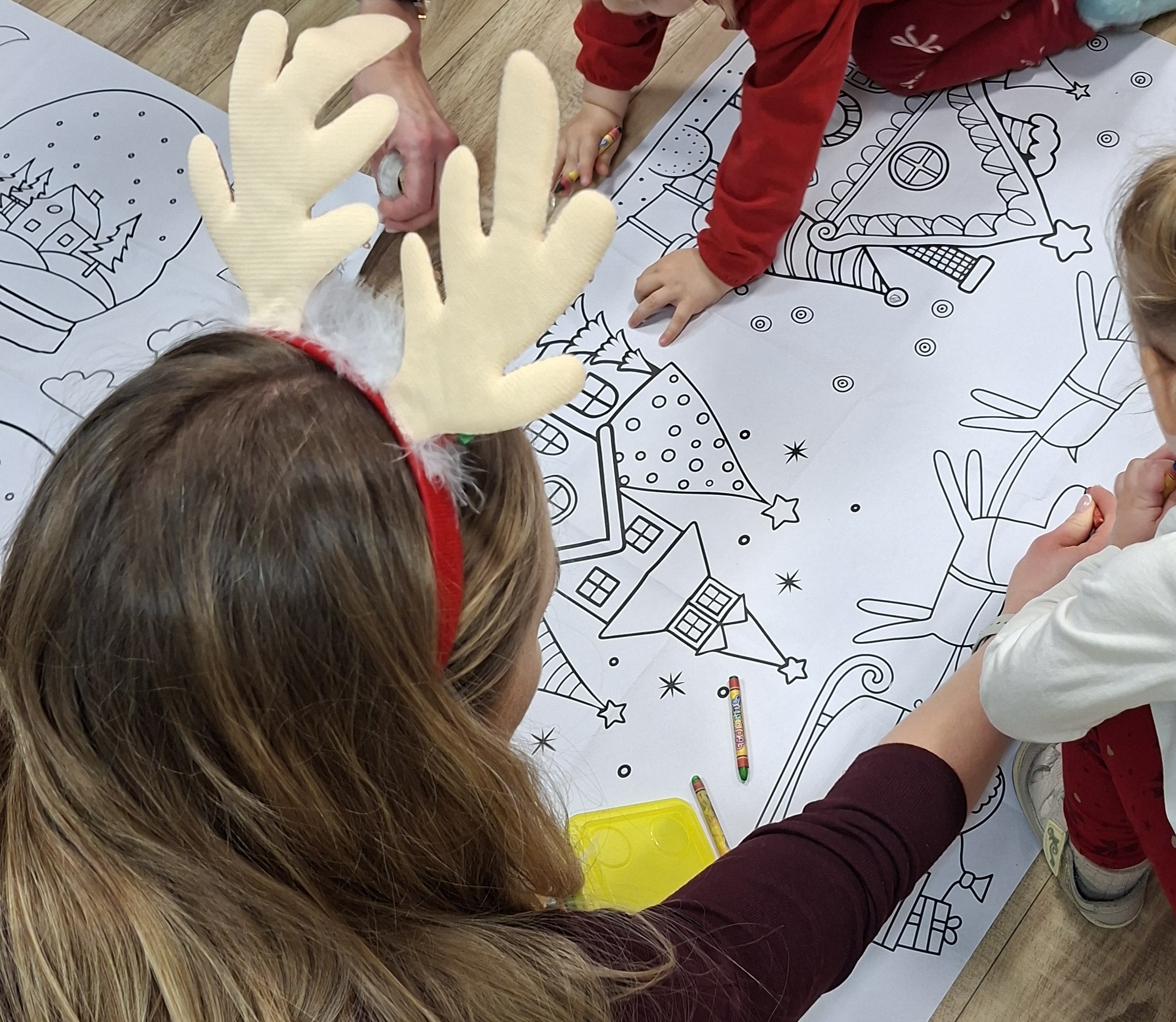 Nie zabrakło zabaw ruchowych i muzycznych. Dzieci chętnie brały udział w zabawie „Stary niedźwiedź”, zamieniały się w lodowe posągi przy dźwiękach muzyki oraz tworzyły własną żłobkową orkiestrę, grając na instrumentach i ciesząc się wspólnym muzykowaniem. W salach często rozbrzmiewały świąteczne piosenki: m.n. „Choinka piękna jak las”, „Siedem reniferów” oraz „Pada śnieg”.