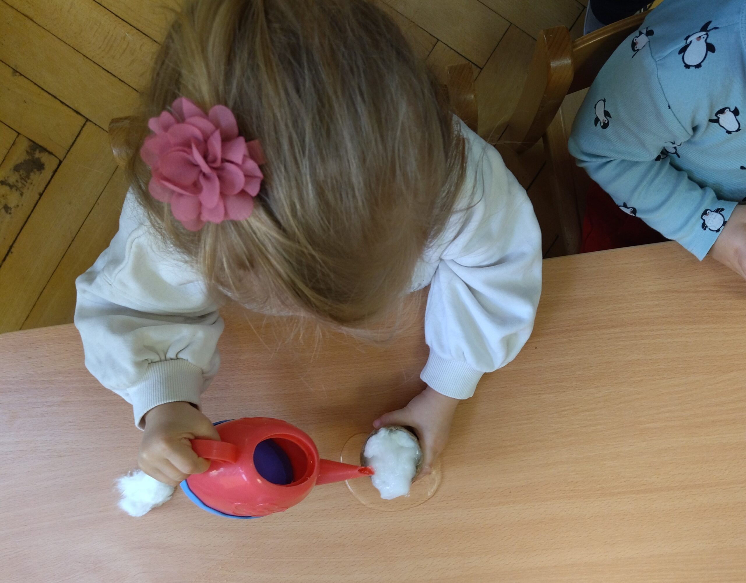 W trakcie zajęć dzieci poznawały także zjawiska pogodowe, a wiersz „W marcu jak w garncu” pomógł im zrozumieć zmienność marcowej aury. Dużym zainteresowaniem cieszyła się deszczowa zabawa sensoryczna z wykorzystaniem koralików, wody, piórek i sitka, która dostarczyła wielu bodźców dotykowych i wzrokowych.