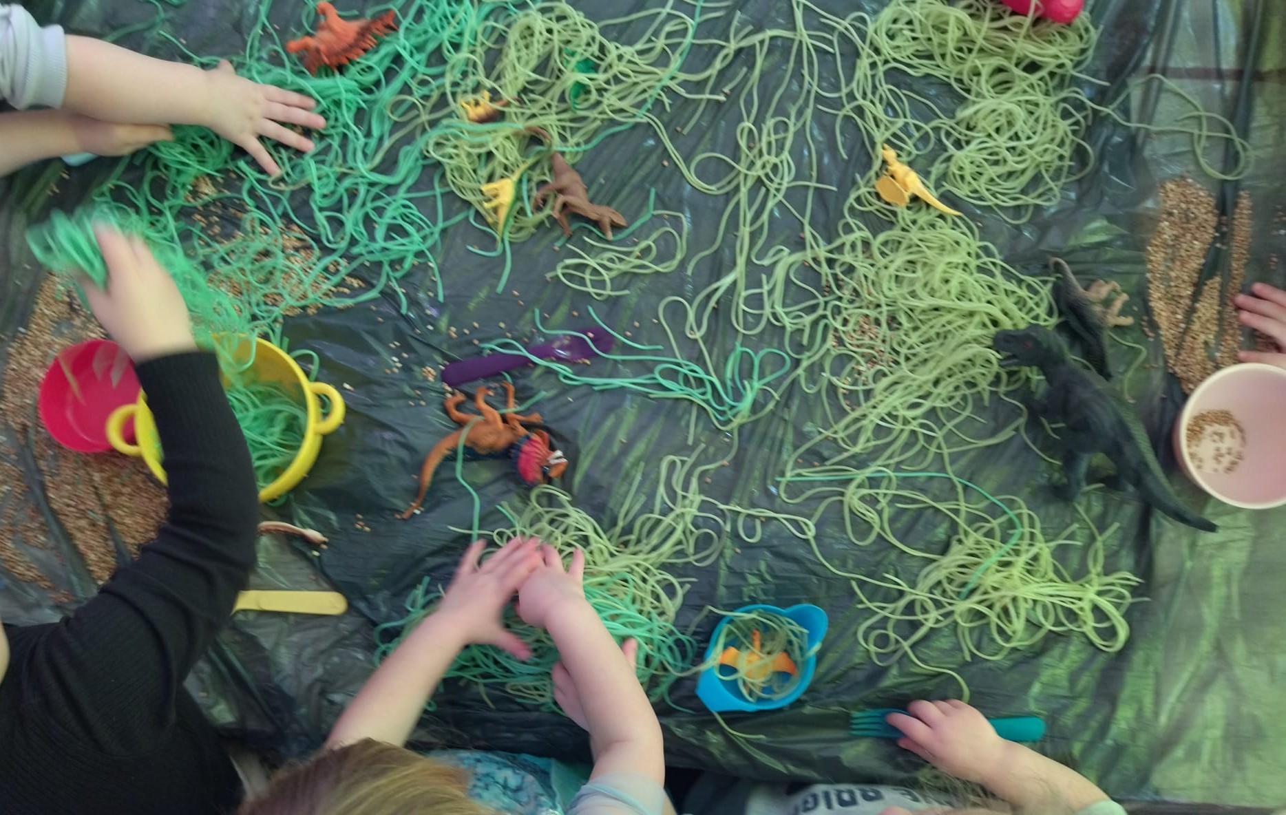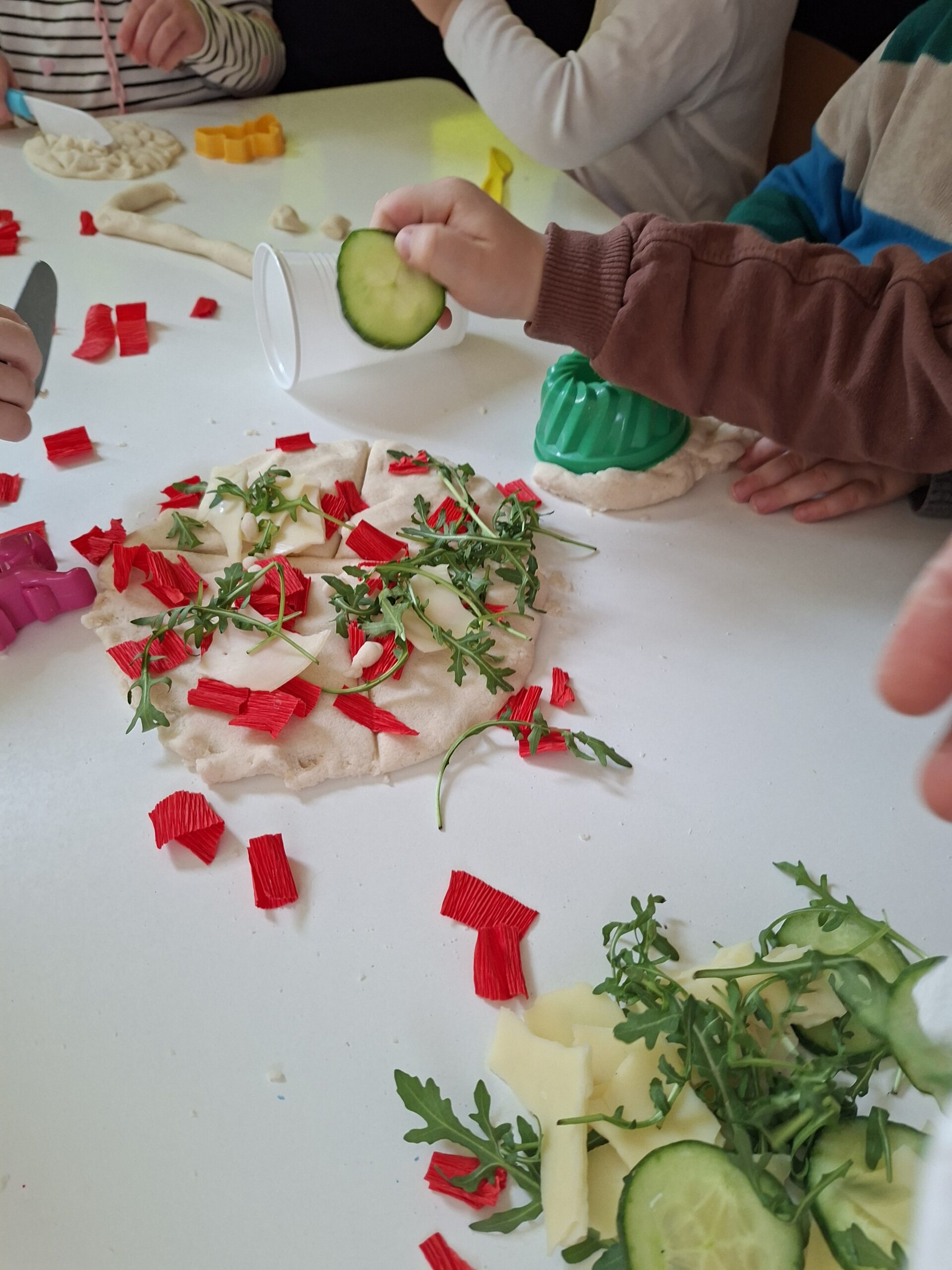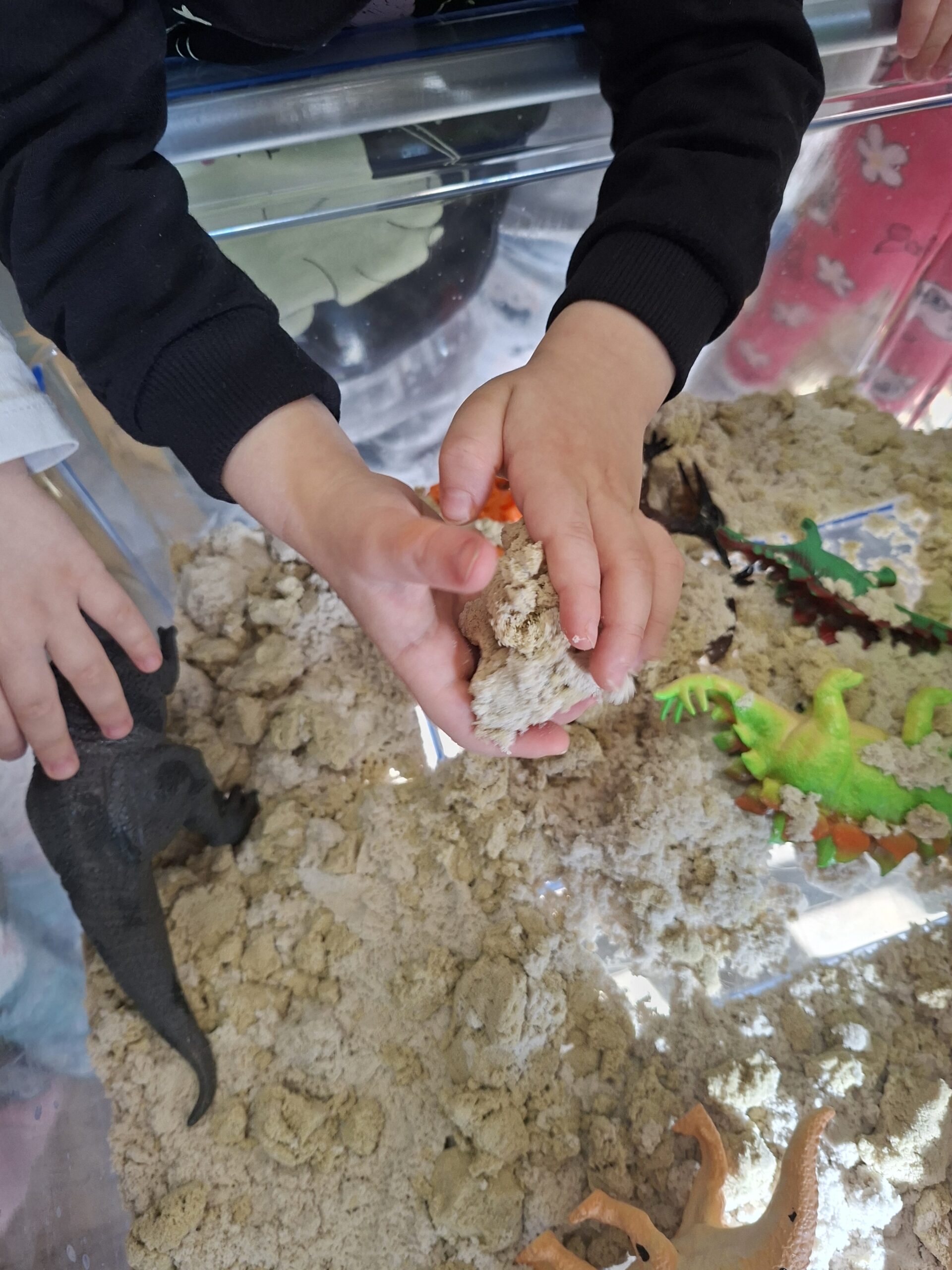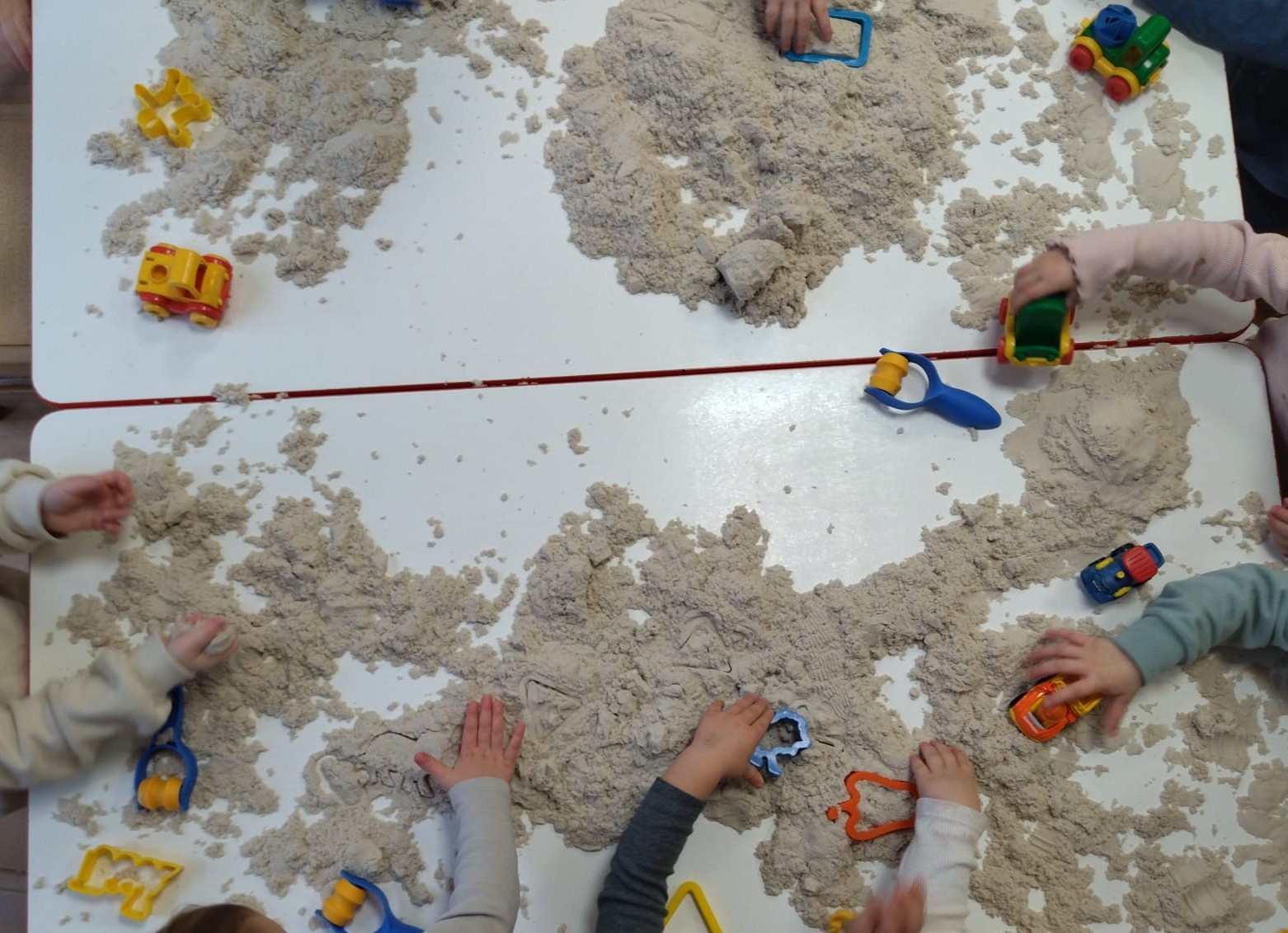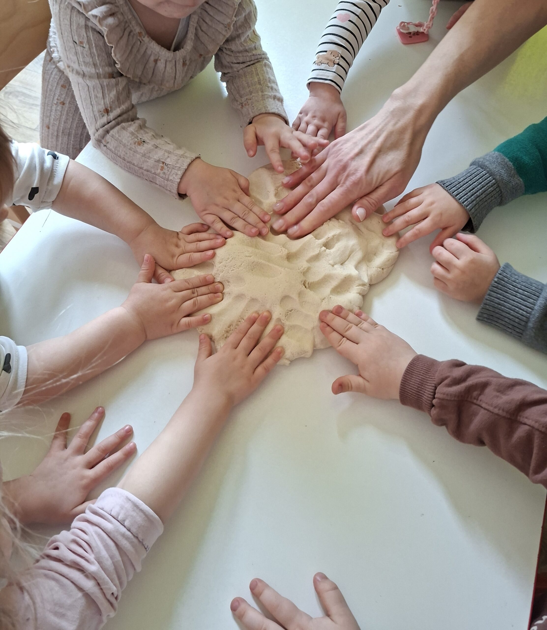 Nie zabrakło także zabaw sensorycznych, takich jak swobodna zabawa masą z kaszy manny, które wspierały rozwój zmysłów i motoryki małej.