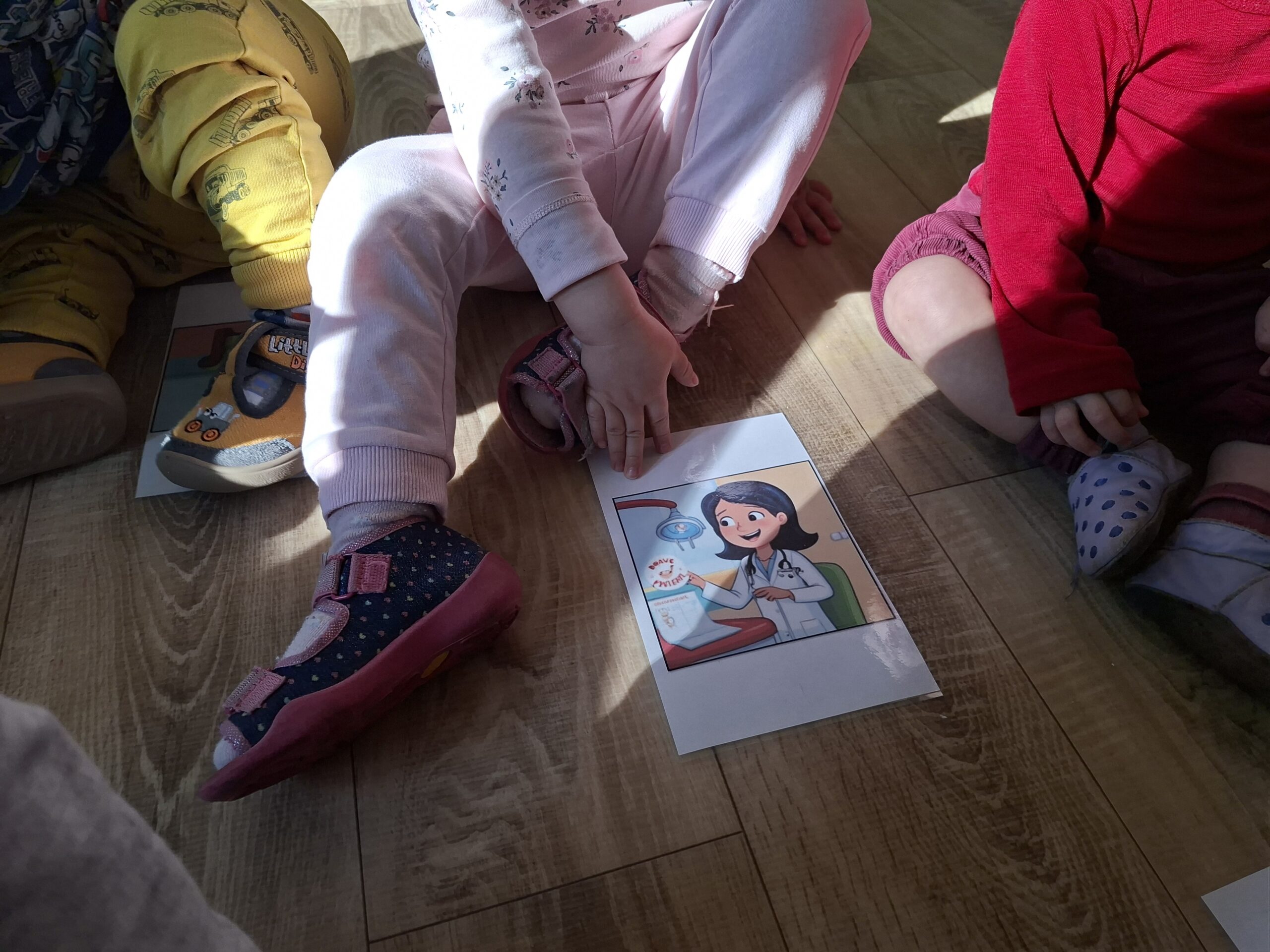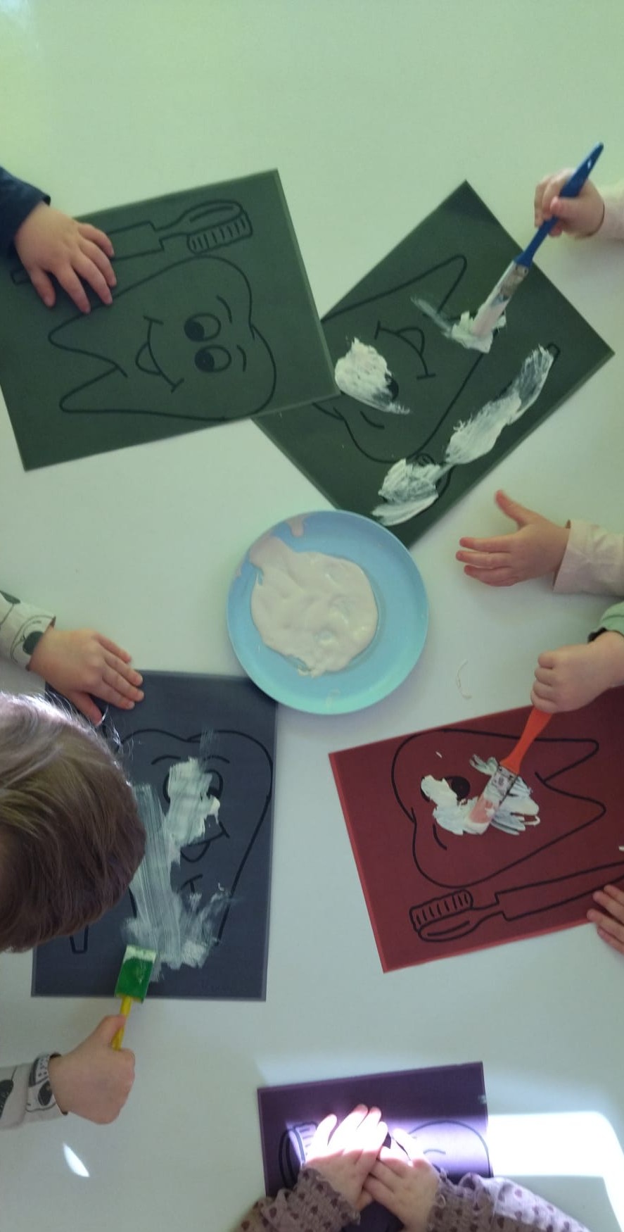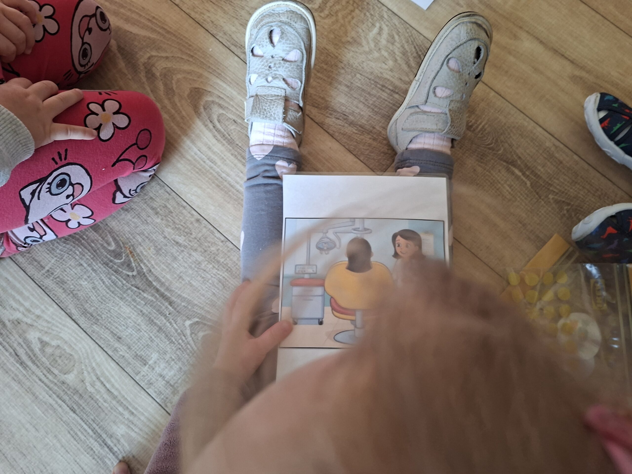 Nie zabrakło również zabaw tematycznych – dzieci wcielały się w rolę stomatologa, poznając podstawy dbania o higienę jamy ustnej, a także słuchały książki „Dentysta”. Aktywności muzyczno-ruchowe, takie jak zabawy z choreografią „Tupaj maluszku” czy swobodne tańce przy piosence „Kle, kle boćku”, pozwoliły na rozwój koordynacji i ekspresji ruchowej.