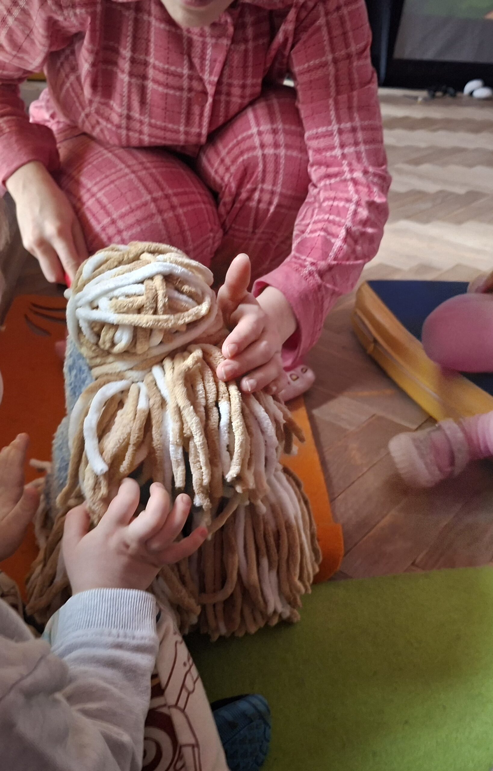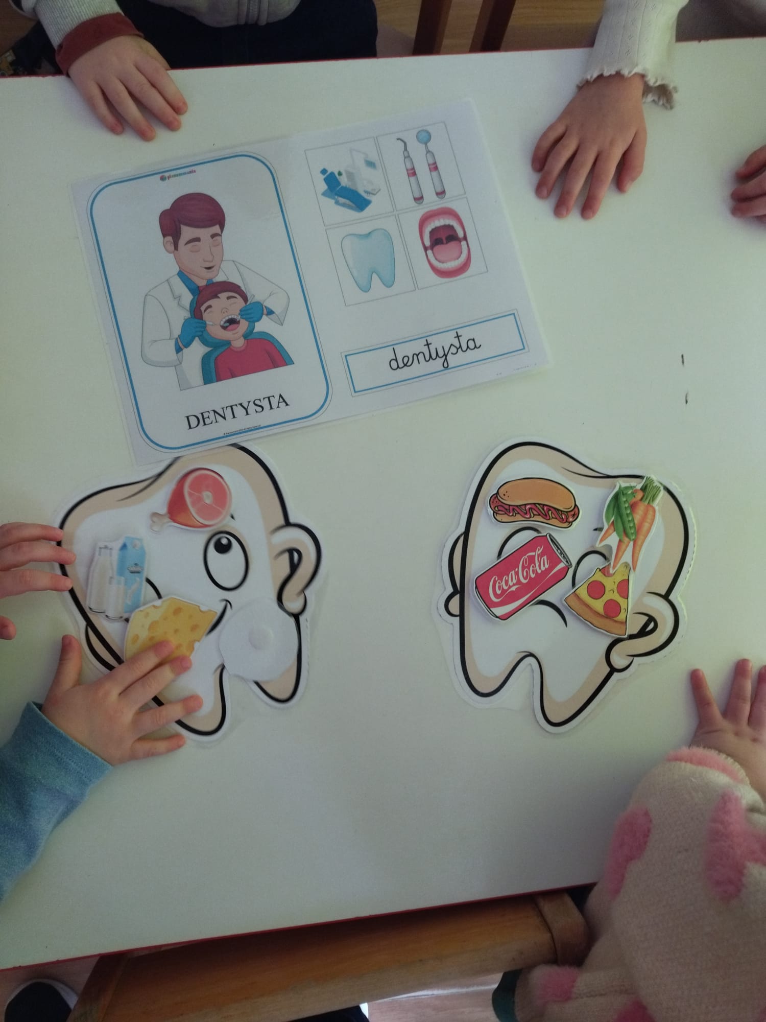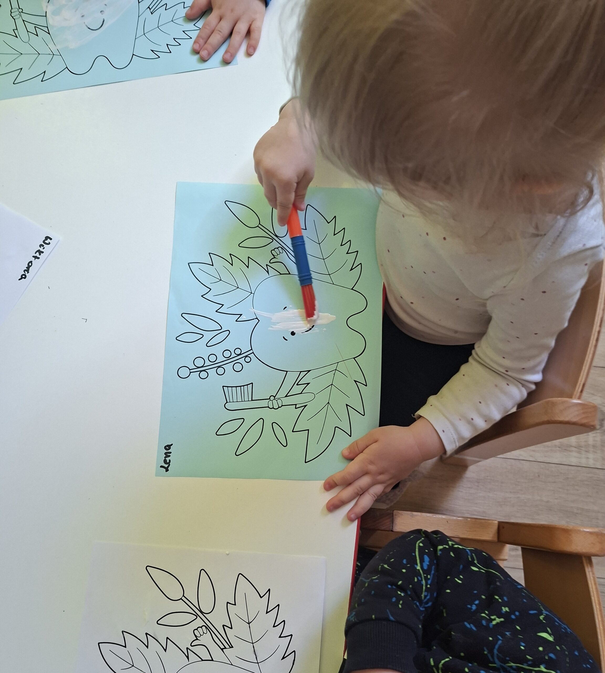 Nie zabrakło również zabaw tematycznych – dzieci wcielały się w rolę stomatologa, poznając podstawy dbania o higienę jamy ustnej, a także słuchały książki „Dentysta”. Aktywności muzyczno-ruchowe, takie jak zabawy z choreografią „Tupaj maluszku” czy swobodne tańce przy piosence „Kle, kle boćku”, pozwoliły na rozwój koordynacji i ekspresji ruchowej.