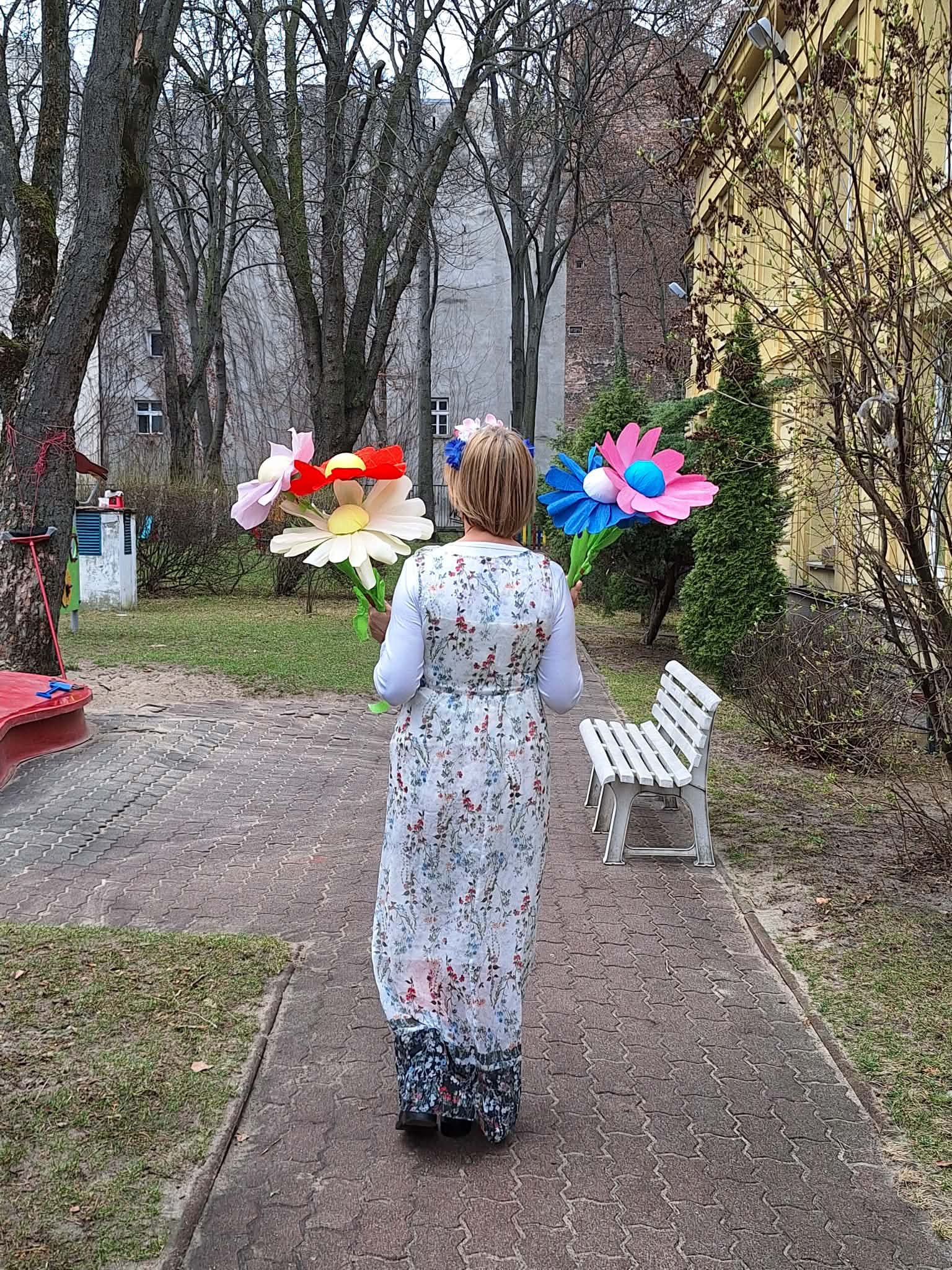 Tematyka wiosenna znalazła również odzwierciedlenie w pracach plastycznych – dzieci wykonały „pierwsze wiosenne kwiaty” oraz ozdabiały suknię Pani Wiosny, rozwijając swoją kreatywność i zdolności manualne.