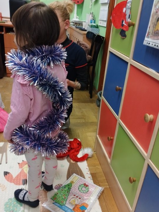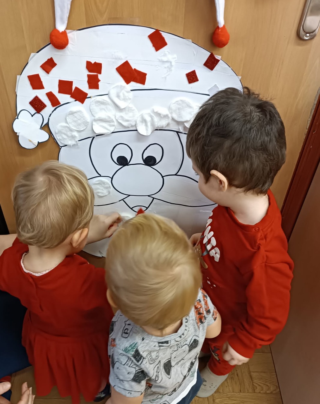 - zajęcia plastyczne, wyklejanie postaci Mikołaja oraz dekorowanie choinki pomponami