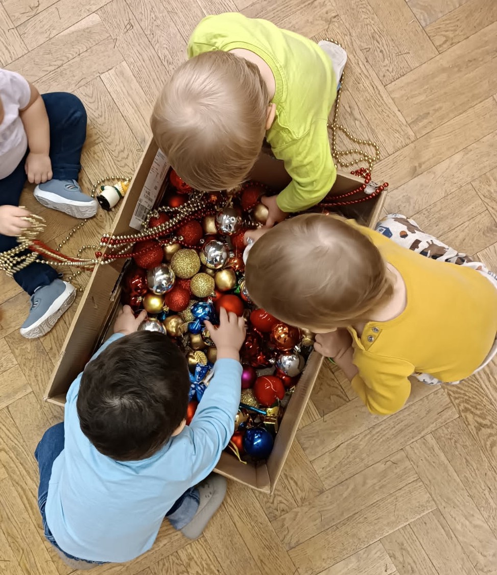 - zapoznanie dzieci z ozdobami choinkowymi, oglądanie świątecznych ozdób oraz strojenie dużej choinki
