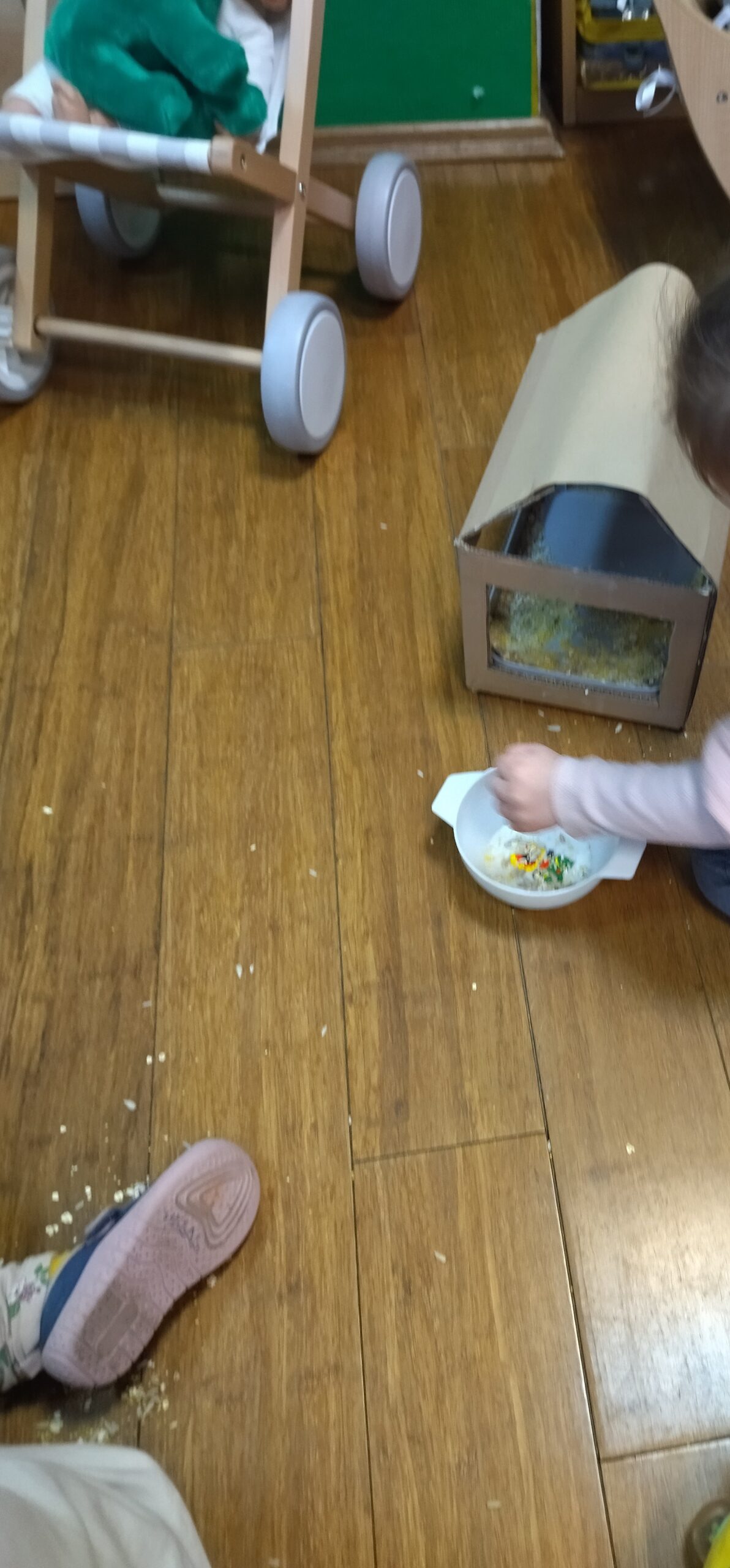 Aktywność – na świeżym powietrzu – dzięki możliwości wyjścia do ogrodu i na taras żłobkowy, dzieci mogą korzystać ze świeżego powietrza i obserwować zmiany w przyrodzie . Jeśli warunki atmosferyczne sprzyjają , dzieci korzystają z rowerków biegowych a także mogą odpoczywać na krzesełkach lub materacu przeglądają książeczki i bawiąc się dostępnymi zabawkami