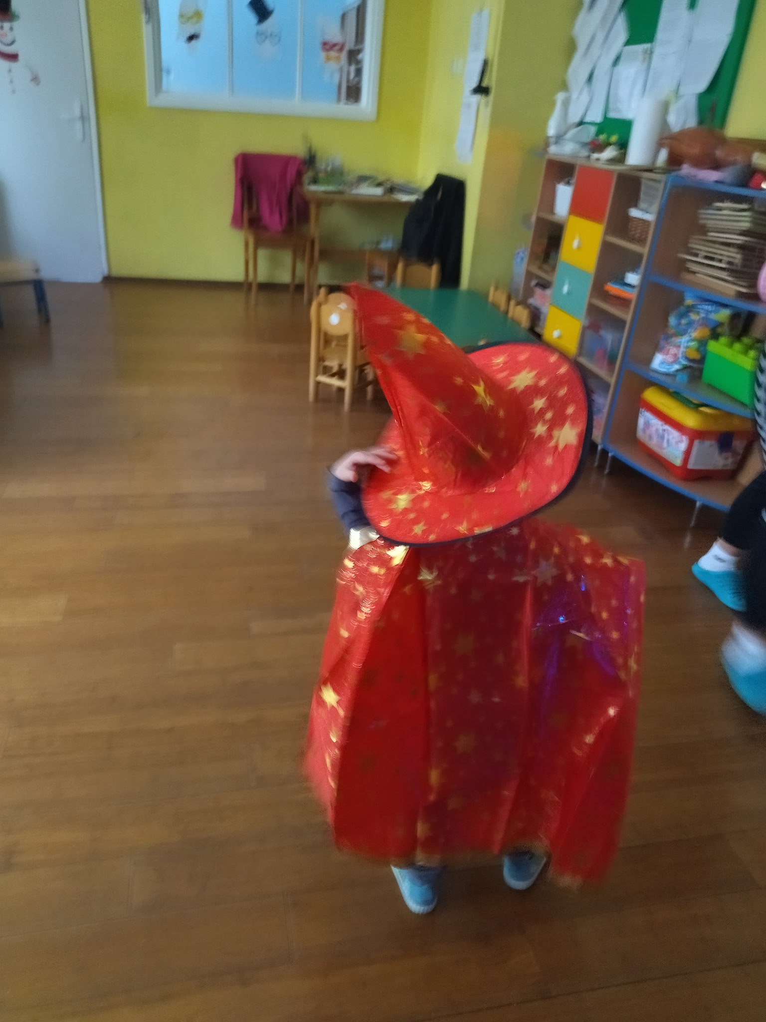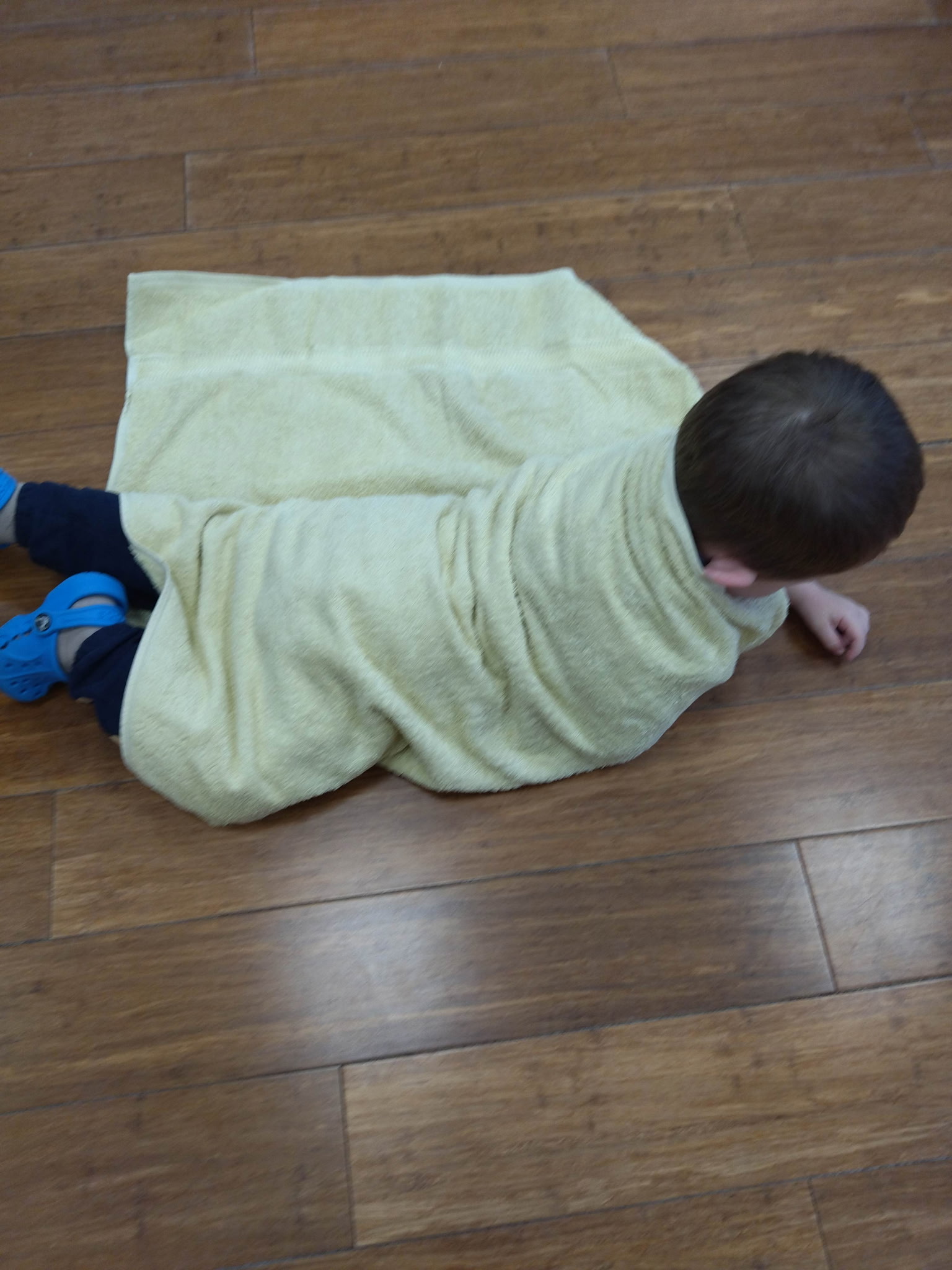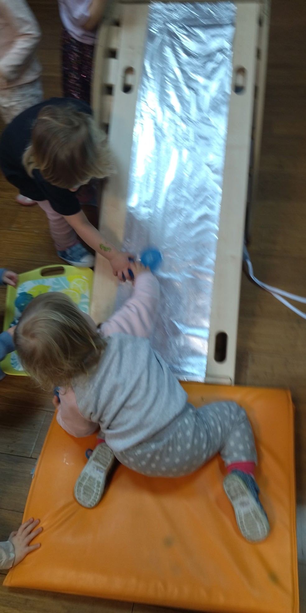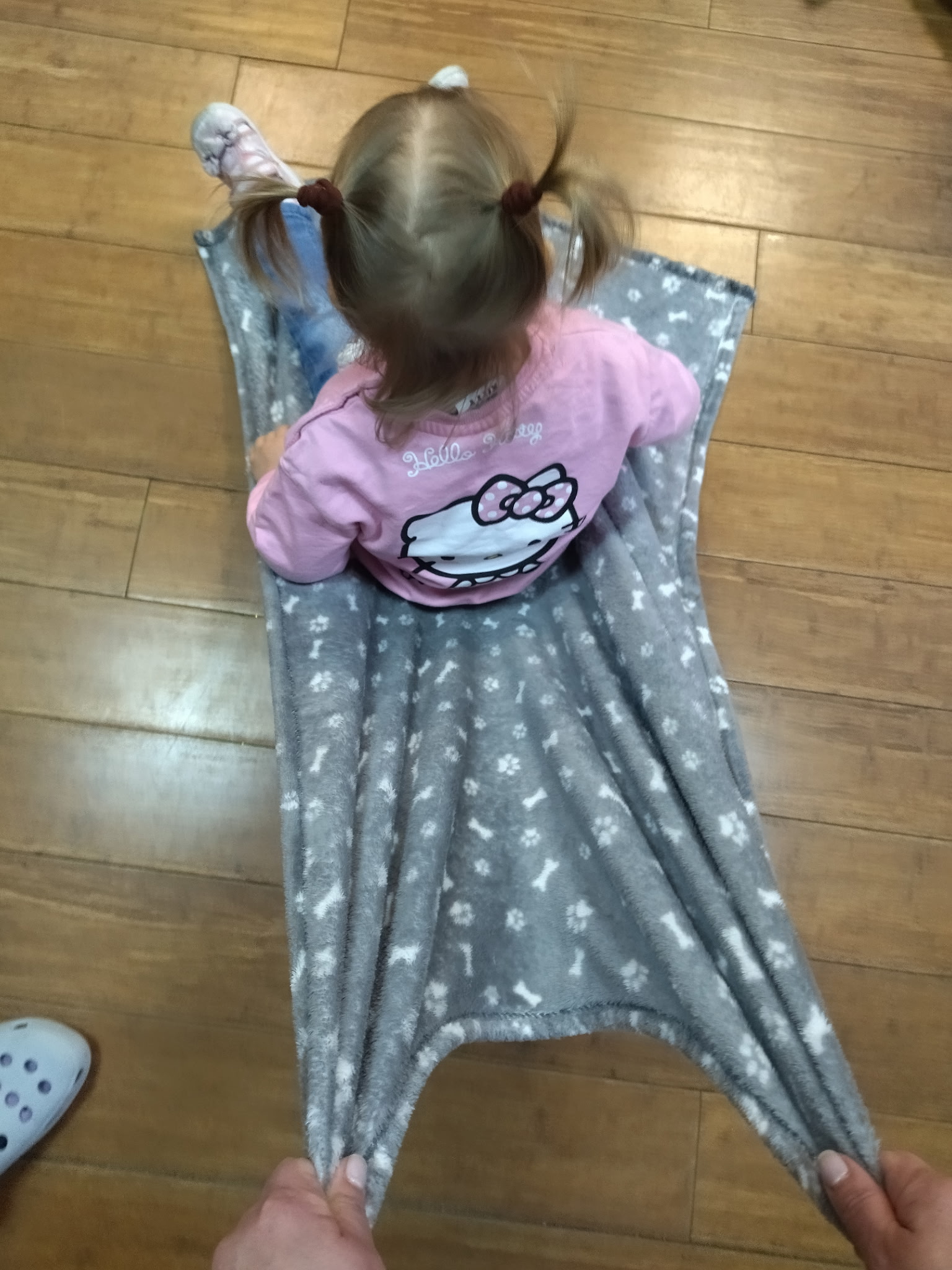 – Zabawy z kocem – ,,Naleśnik’’ zawijanie i odwijanie maskotek w koc lub duży ręcznik – dziecko samo próbuje się odwinąć