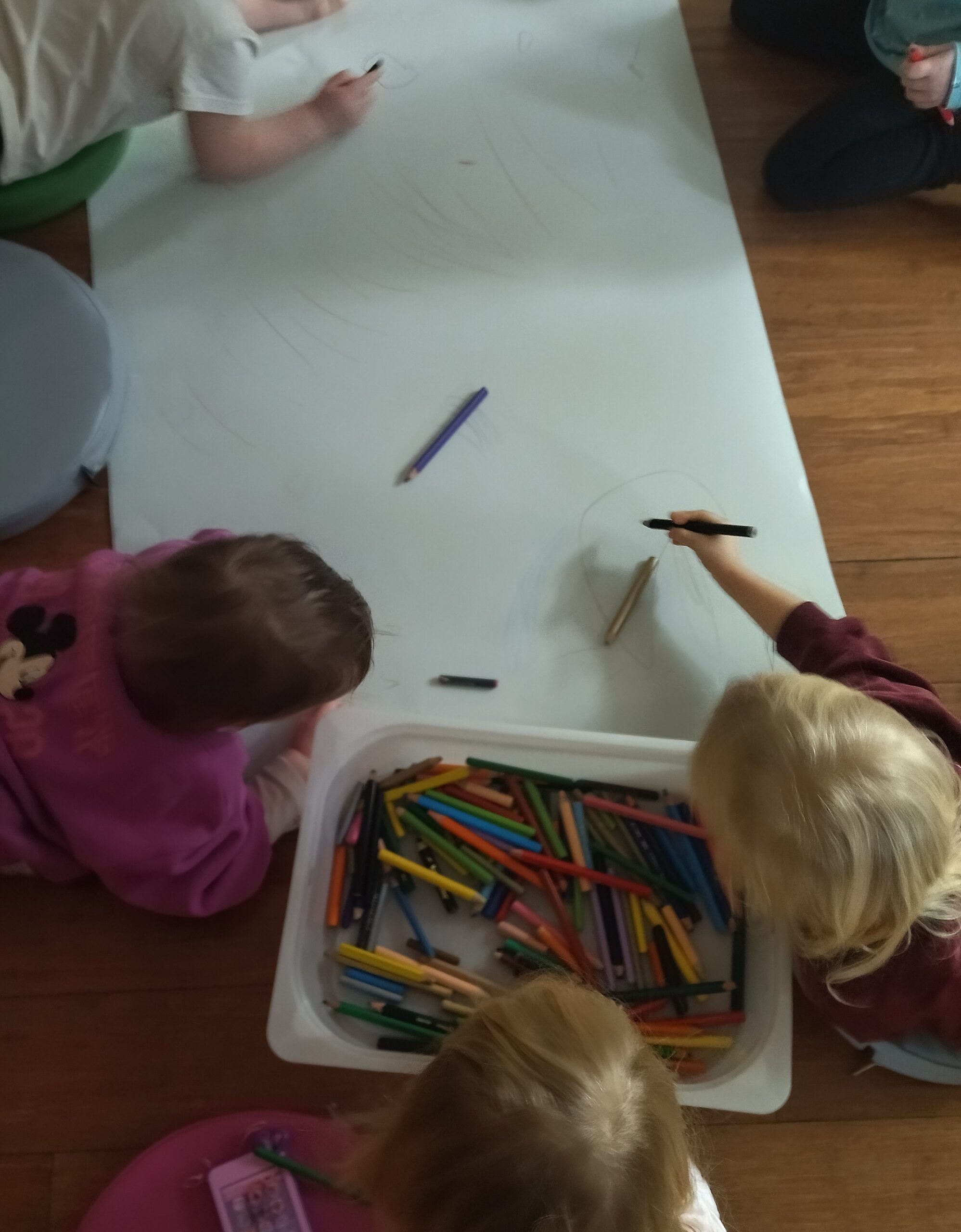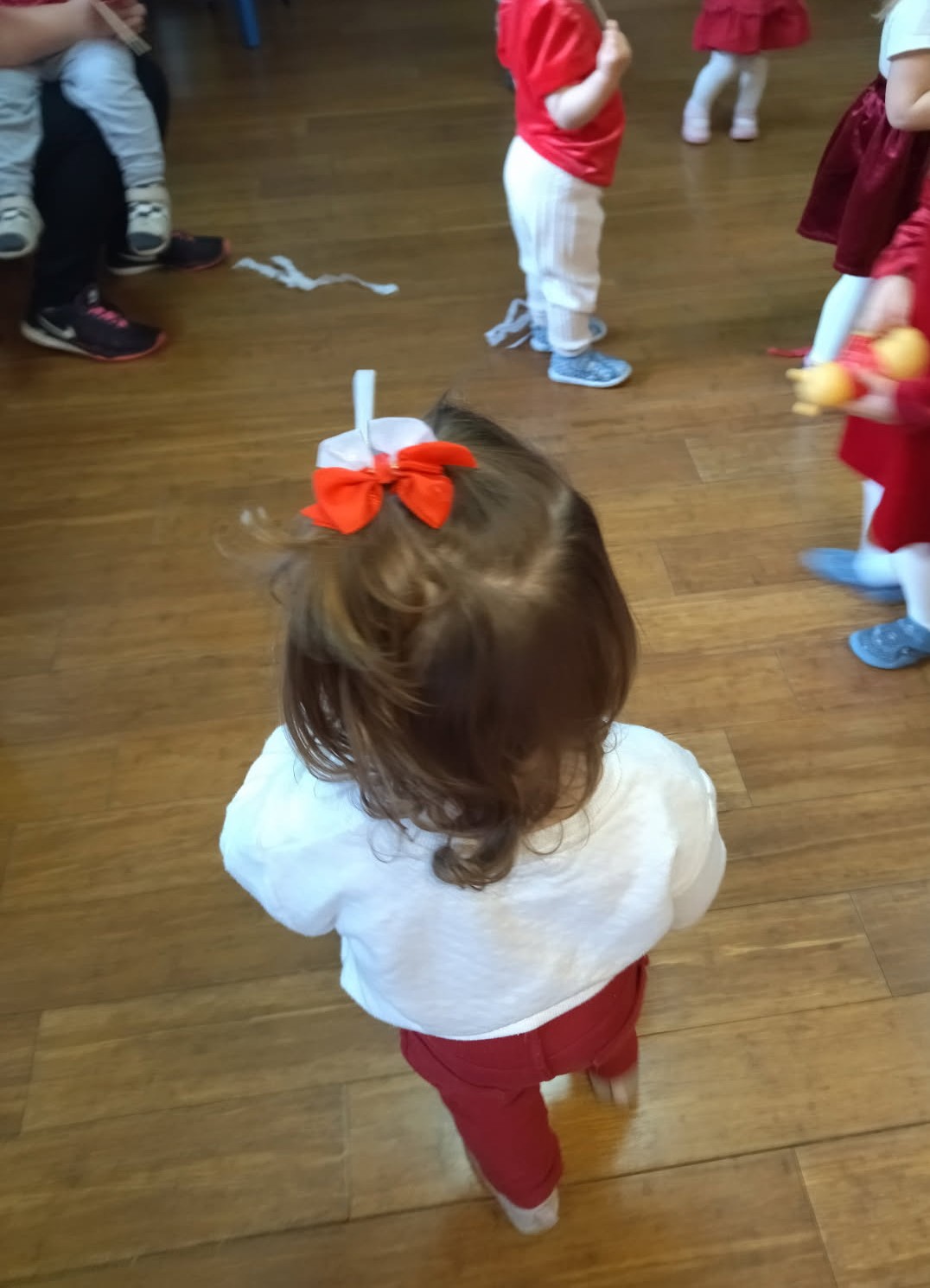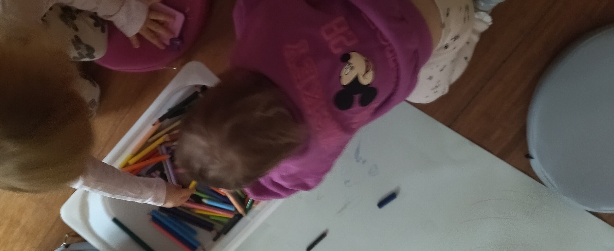 – zabawy ruchowe przy piosence ,, Kolorowe Kredki ‘’ – naśladowanie ruchów opiekunki , próby taneczne w parach