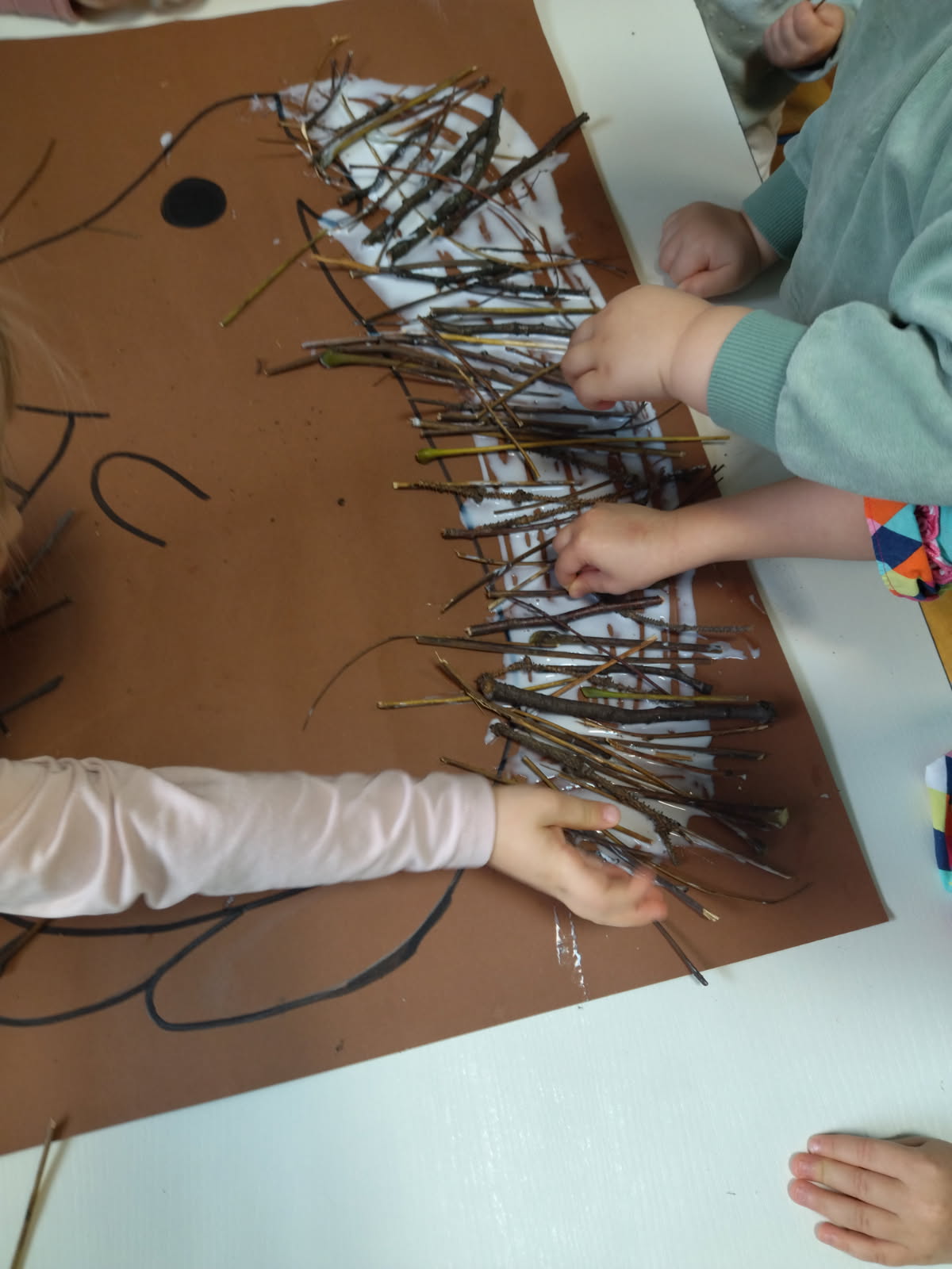 – pobudzenie zmysłów poprzez wspólne ozdabianie szablonu misia pociętą włóczka