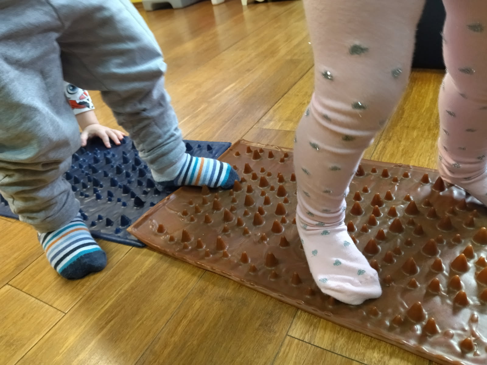 – zabawy sensoryczne – spacer po macie z kolcami ,masażyki kolczastymi piłkami