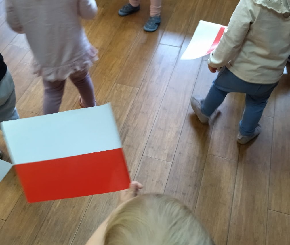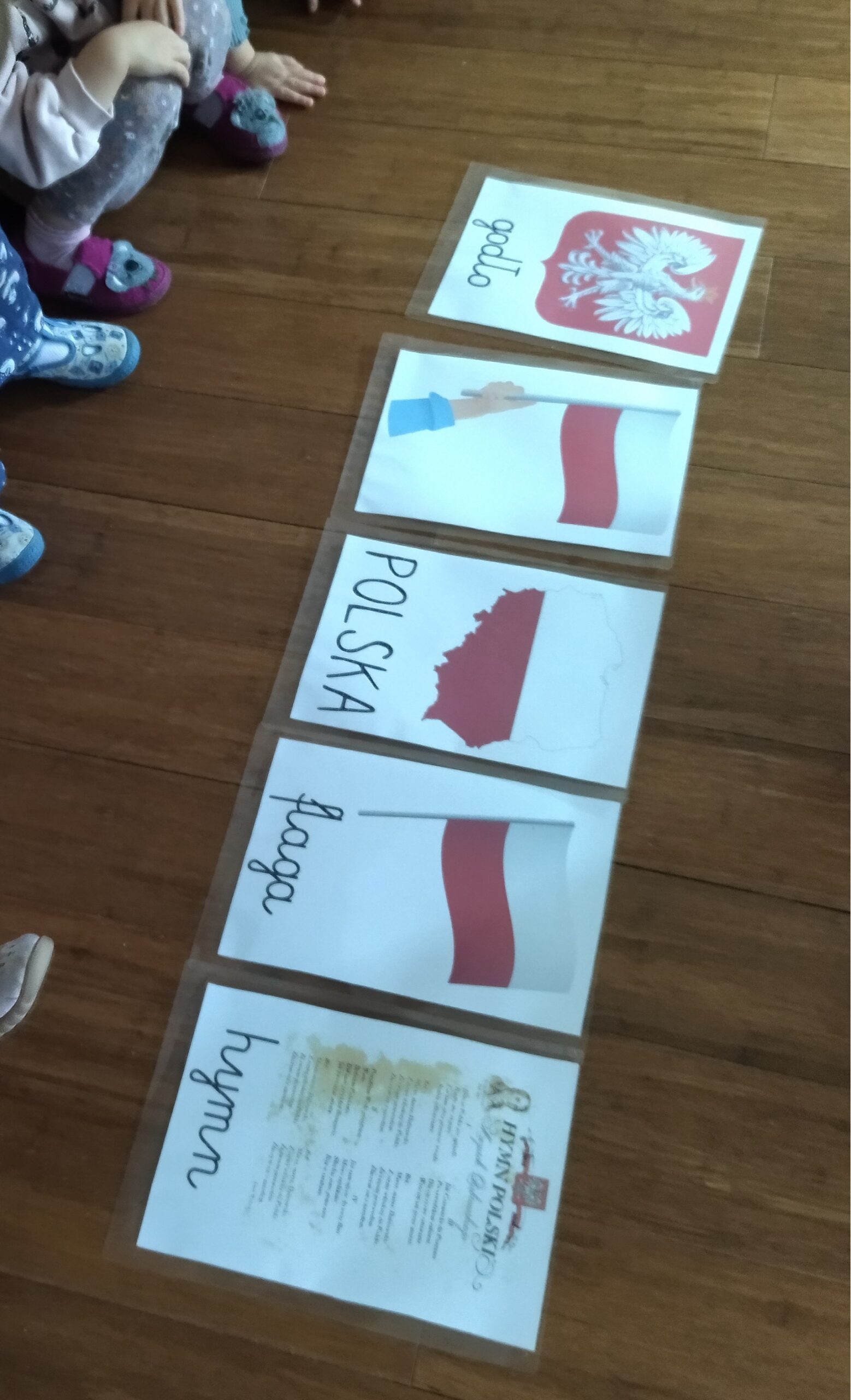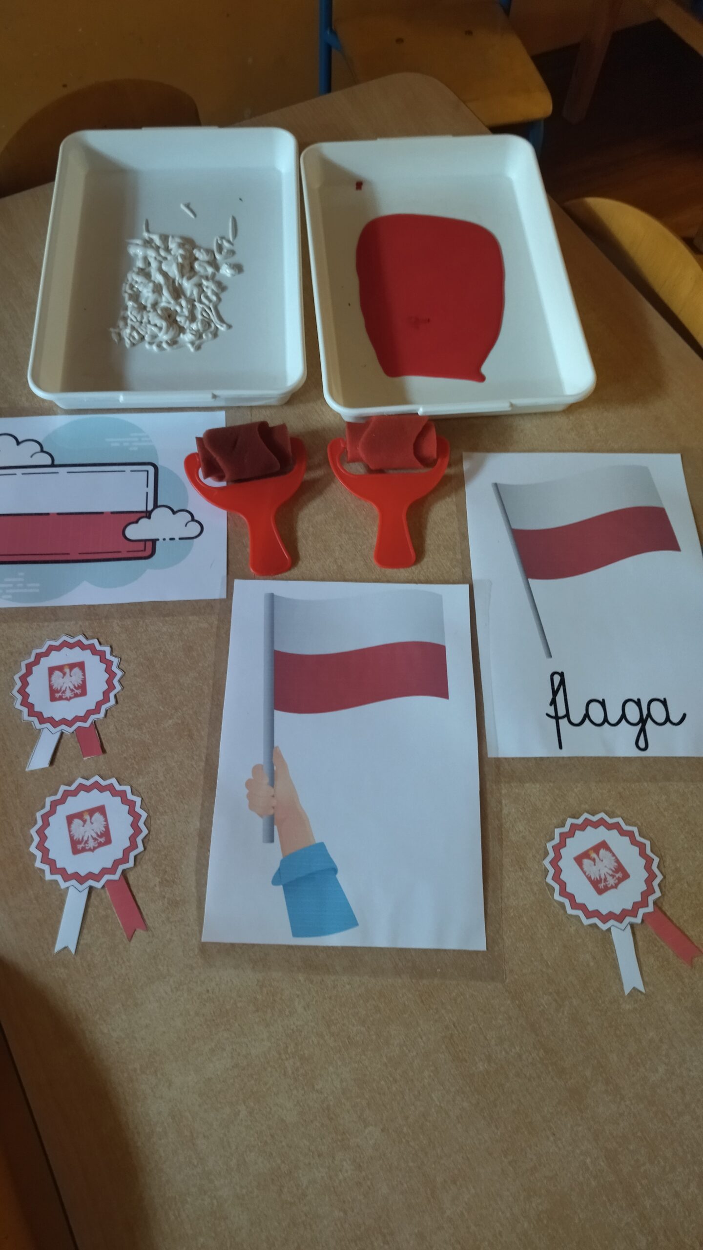 - praca plastyczna – ,,Polska ‘’ – wspólne wypełnianie konturu naszego kraju, biało- czerwonymi sercami , tworzenie flagi,