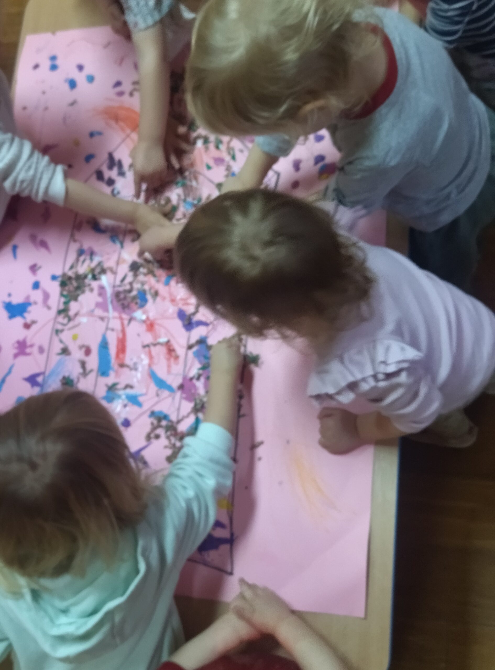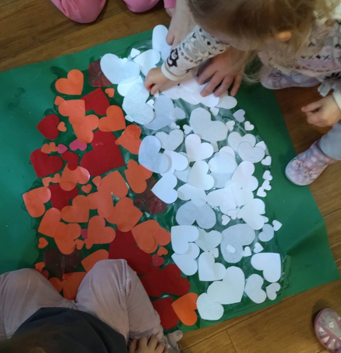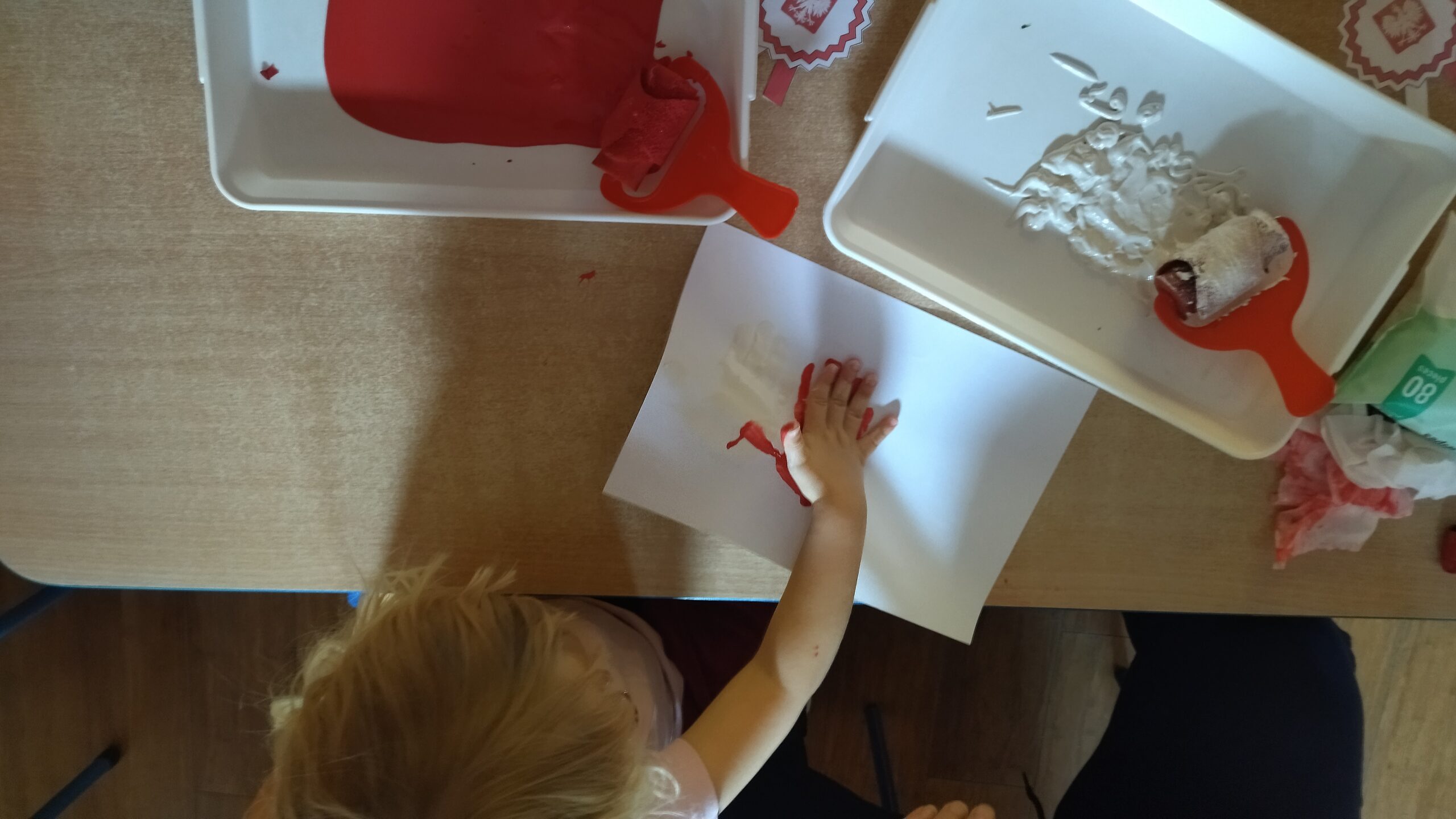 - praca plastyczna – ,,Polska ‘’ – wspólne wypełnianie konturu naszego kraju, biało- czerwonymi sercami , tworzenie flagi,