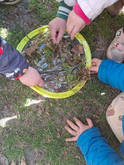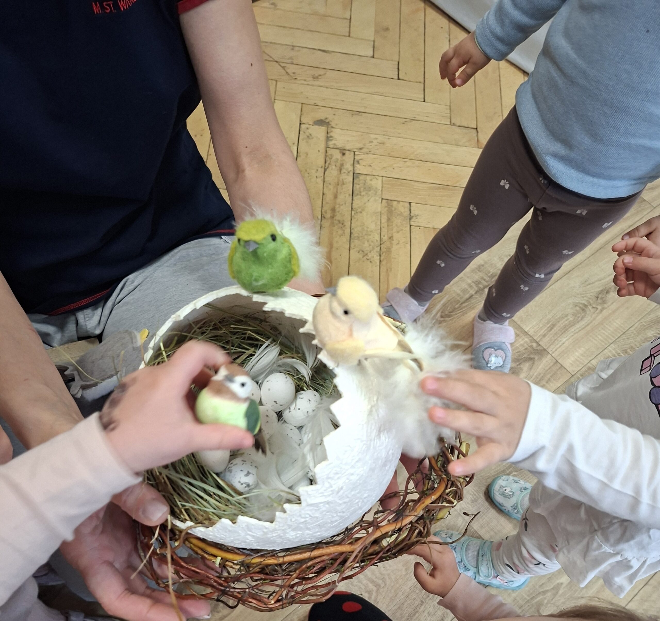 Wspólnie tworzyliśmy gniazdo bociana, co było nie tylko świetną zabawą, ale też okazją do rozmów o zwierzętach wracających do nas na wiosnę. Podczas zajęć poznawaliśmy także mieszkańców łąki i lasu, których dzieci będą mogły spotkać podczas spacerów.