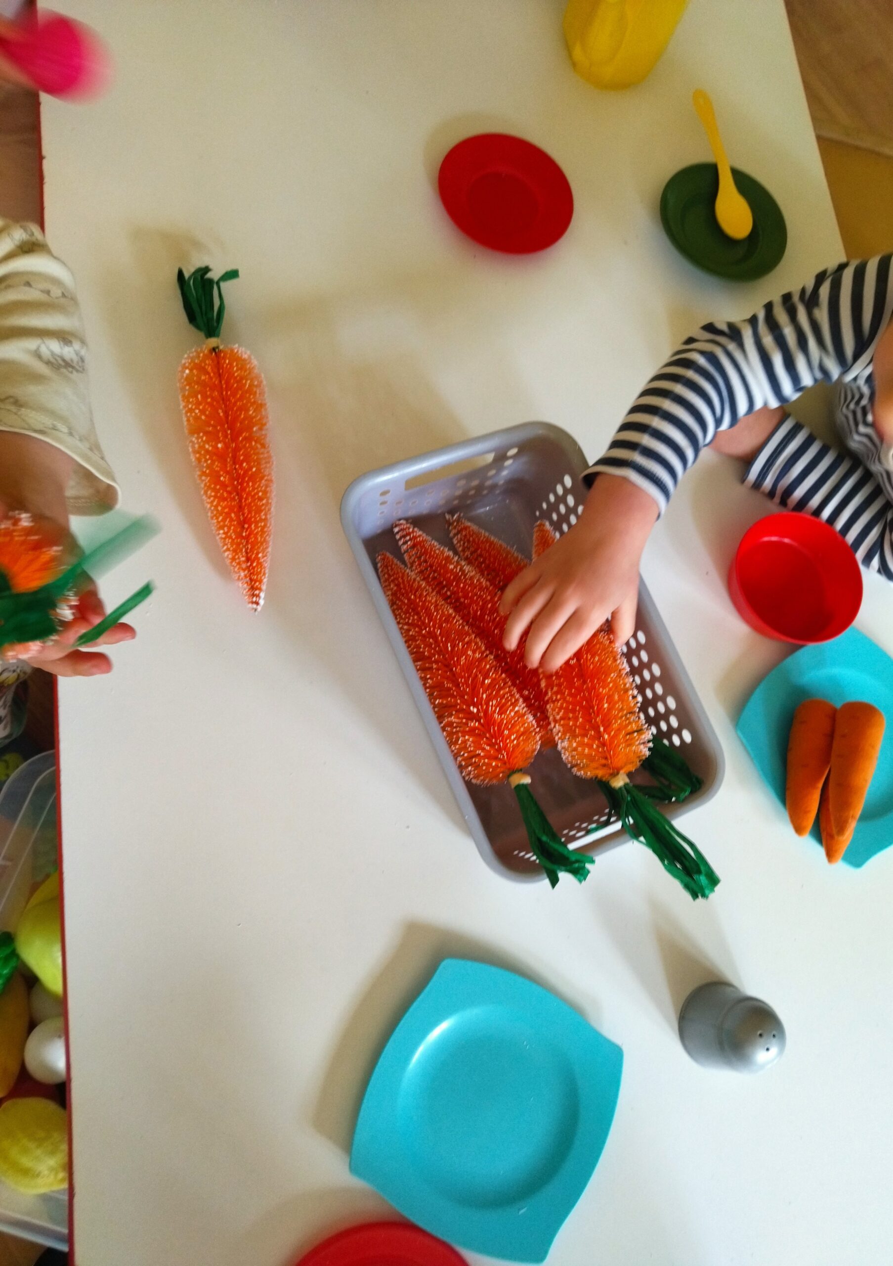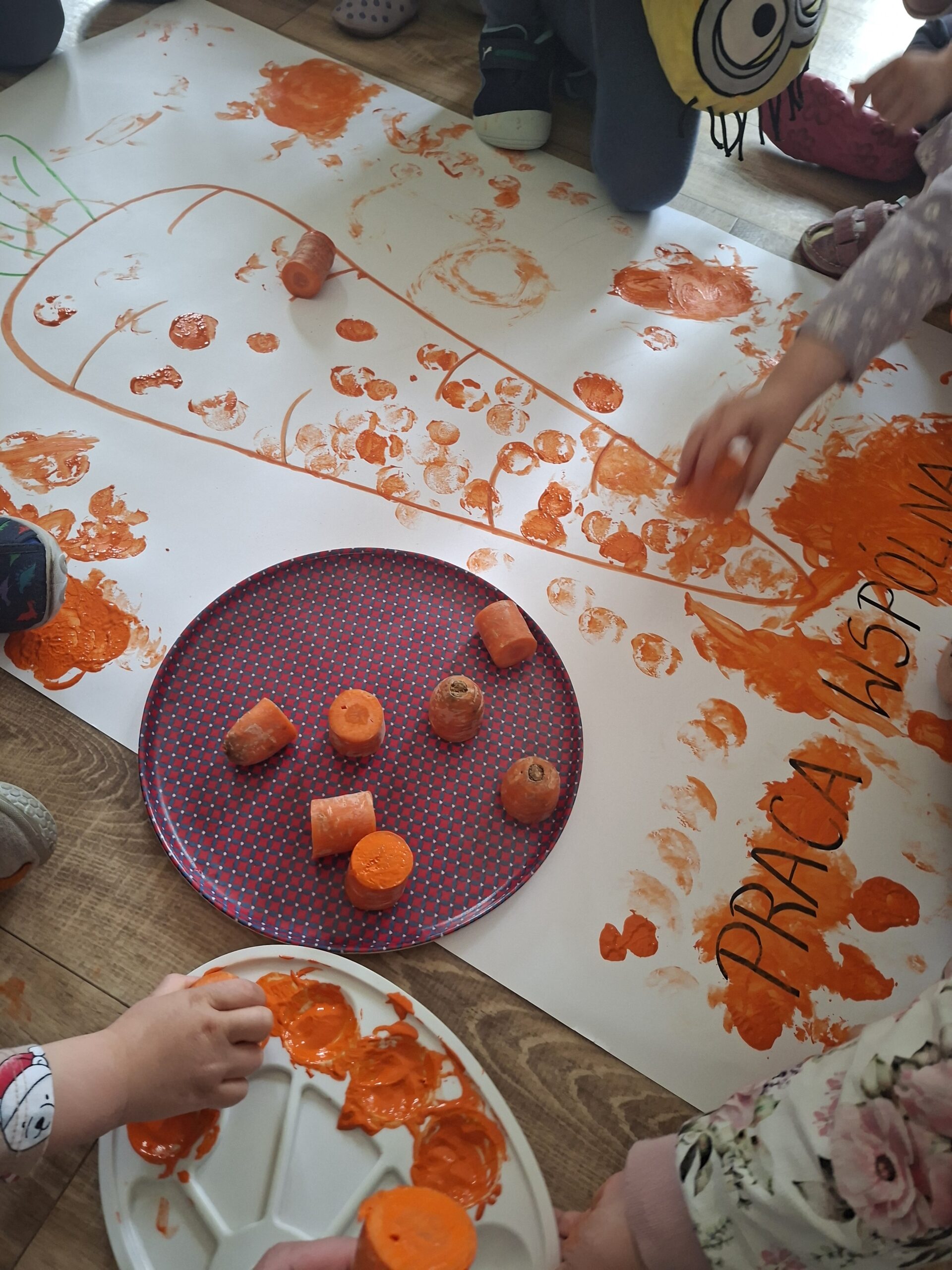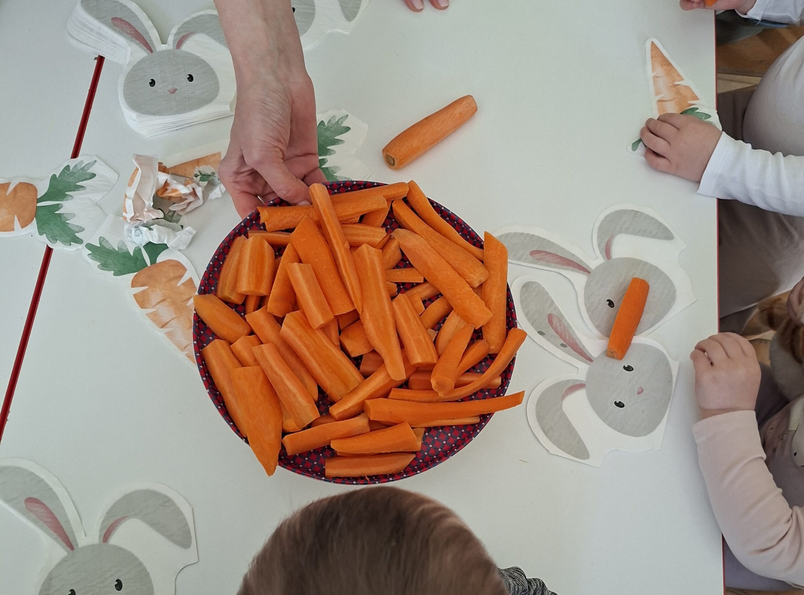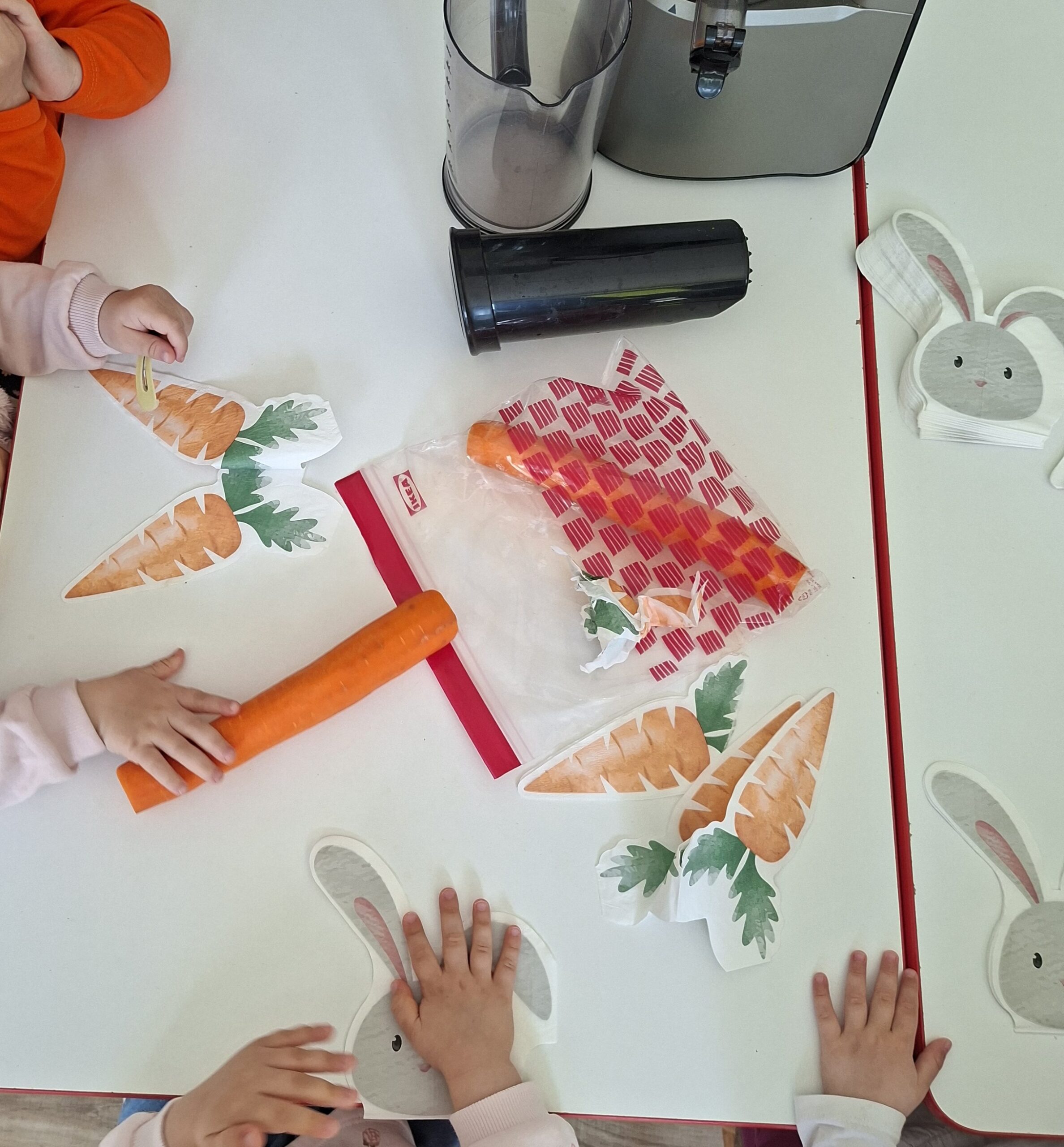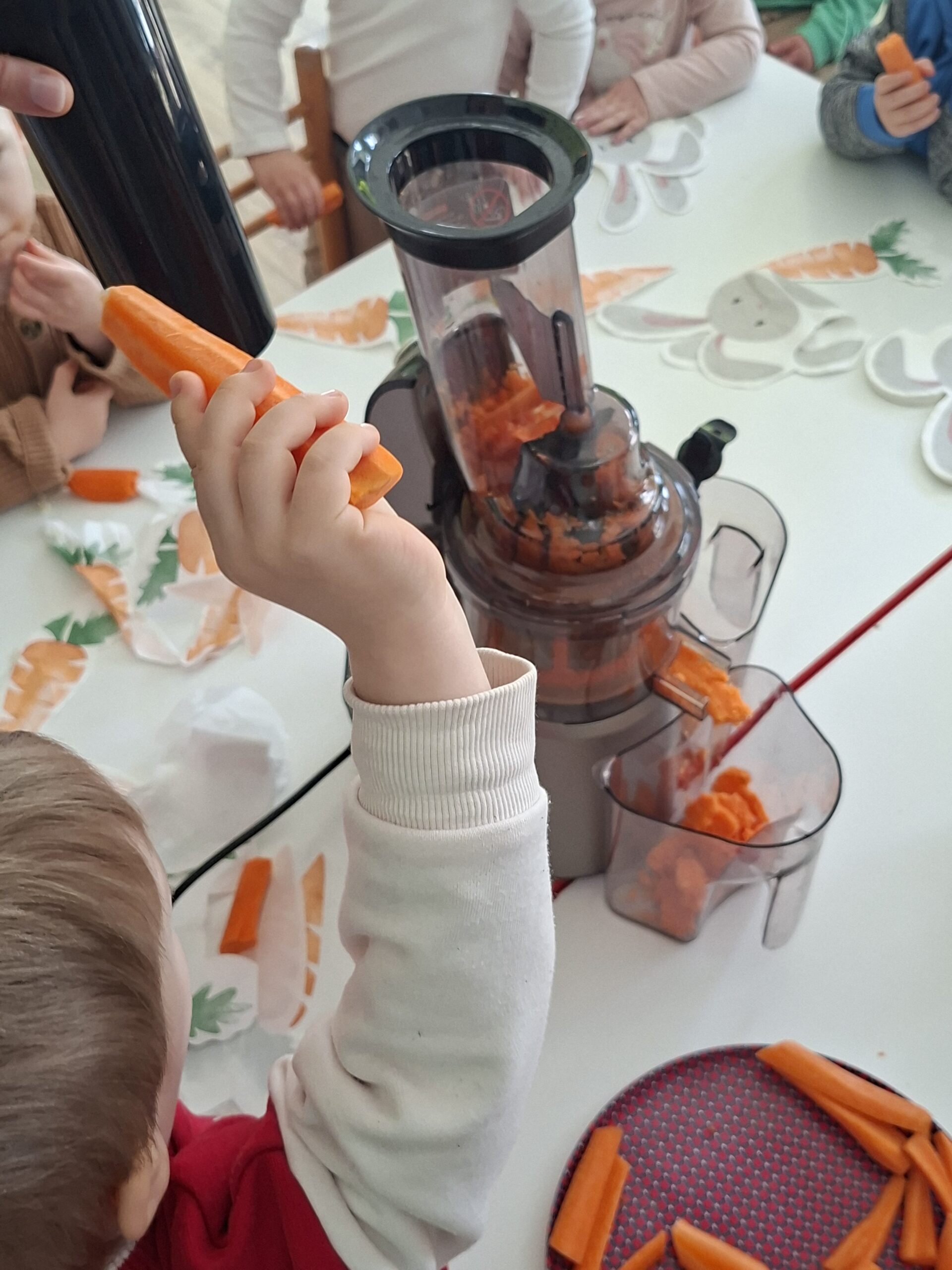 Nie zabrakło aktywności na świeżym powietrzu. Zabawy w ogrodzie sprawiły dzieciom mnóstwo radości. Jedną z ulubionych atrakcji było szukanie marchewek dla zajączka. Po udanych poszukiwaniach przygotowaliśmy wspólnie pyszny i zdrowy soczek, a następnie dzieci wykonały prace plastyczne związane z tym wydarzeniem.