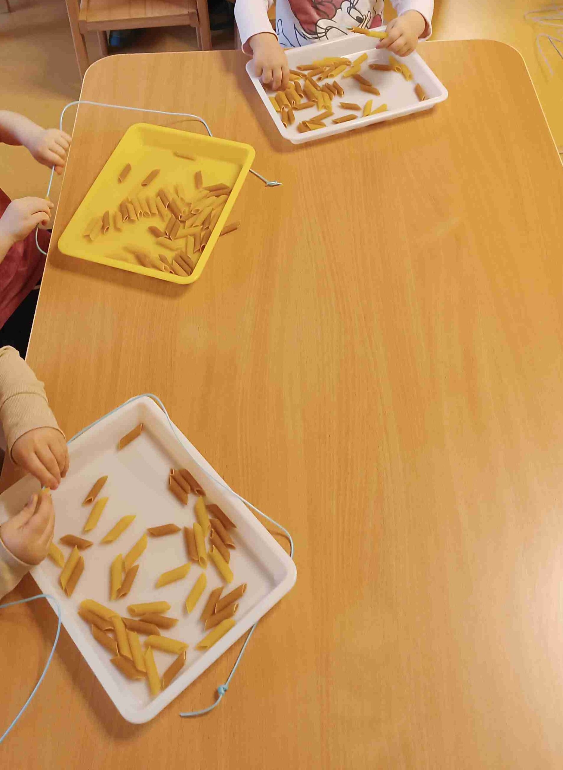 Dbaliśmy także o aktywność ruchową – zabawy w tunelach wzmacniały koordynację i sprawność fizyczną. Podczas zabaw z piaskiem kinetycznym oraz nawlekania makaronu na sznurek dzieci ćwiczyły koncentrację i precyzję ruchów.
