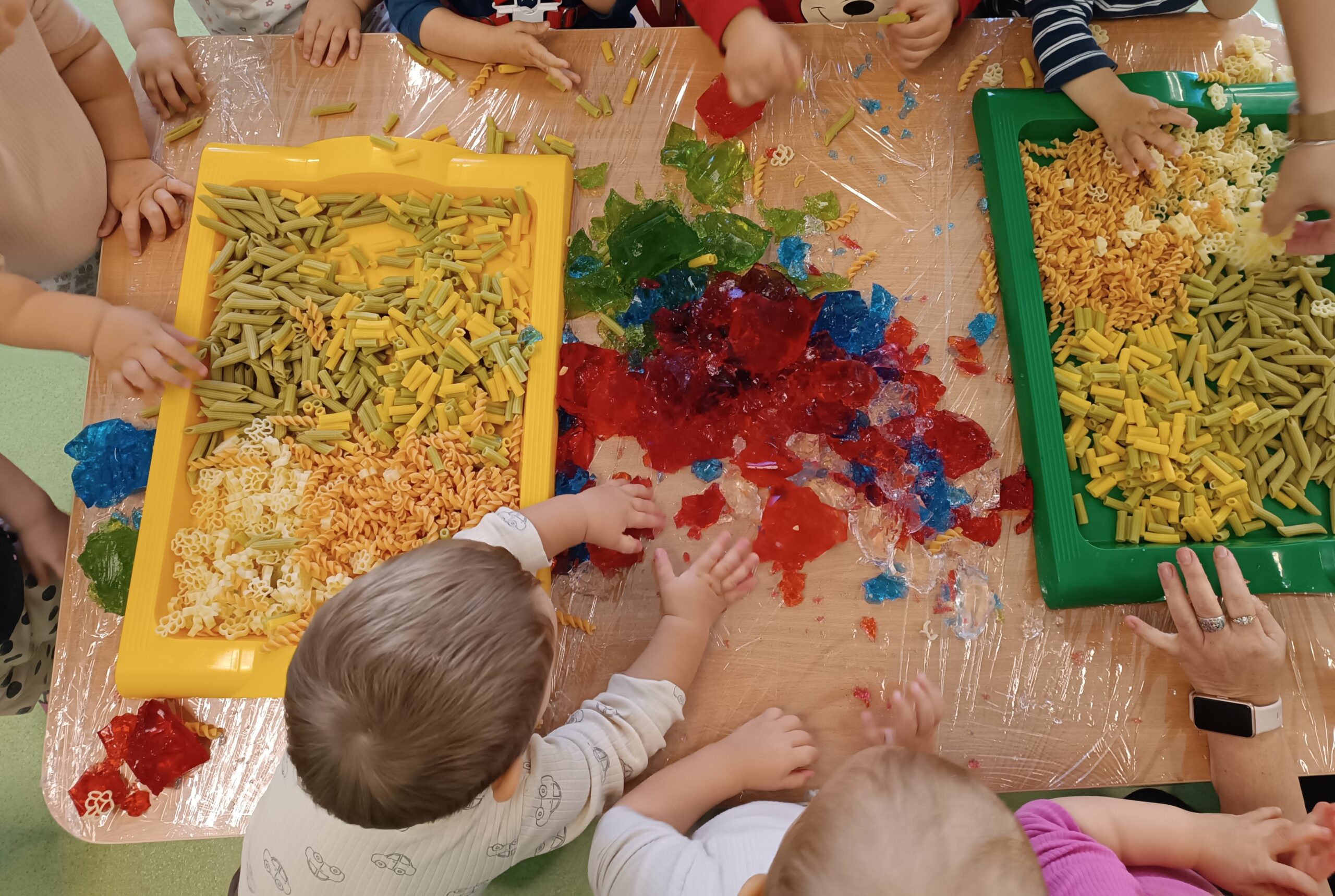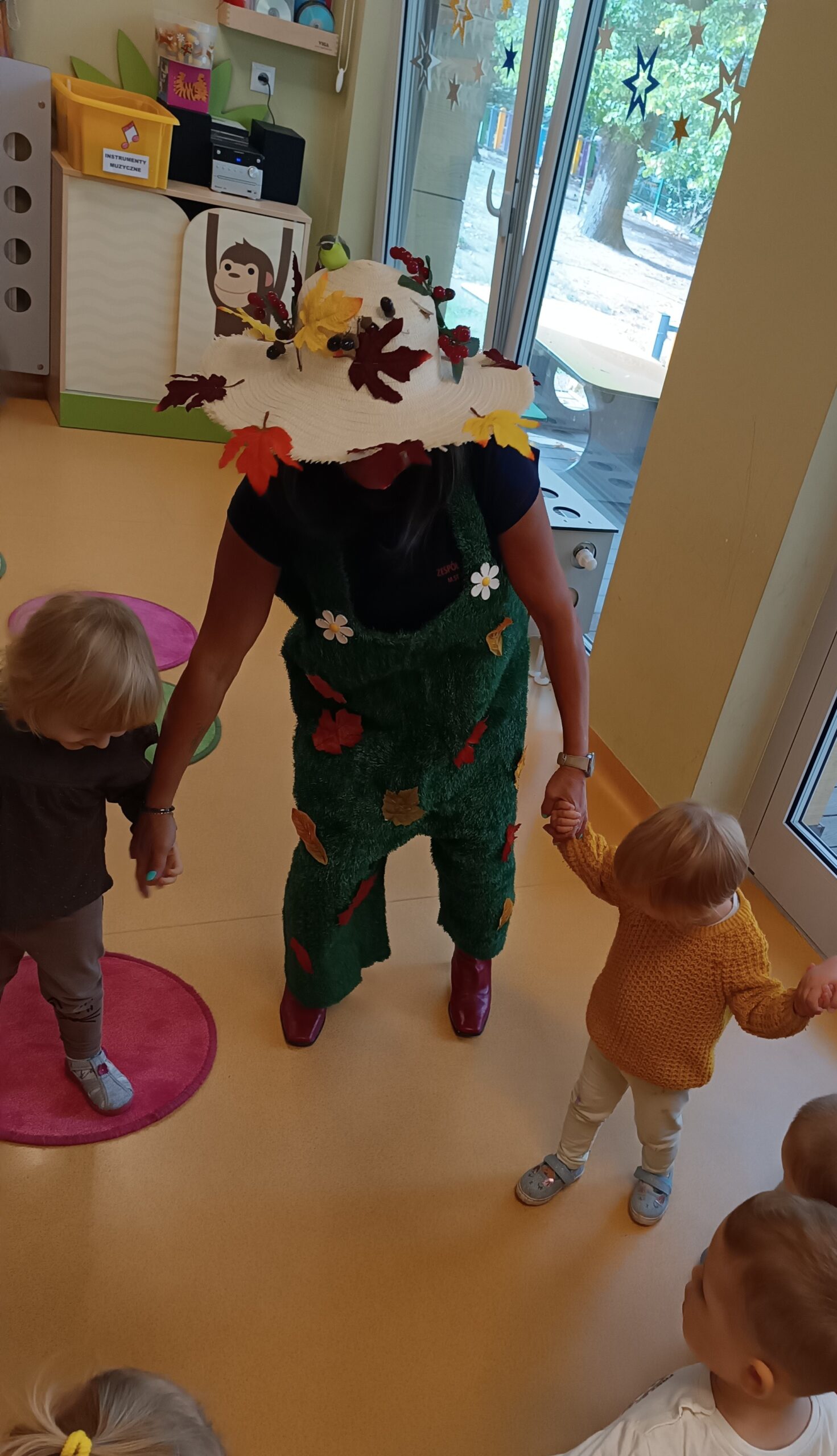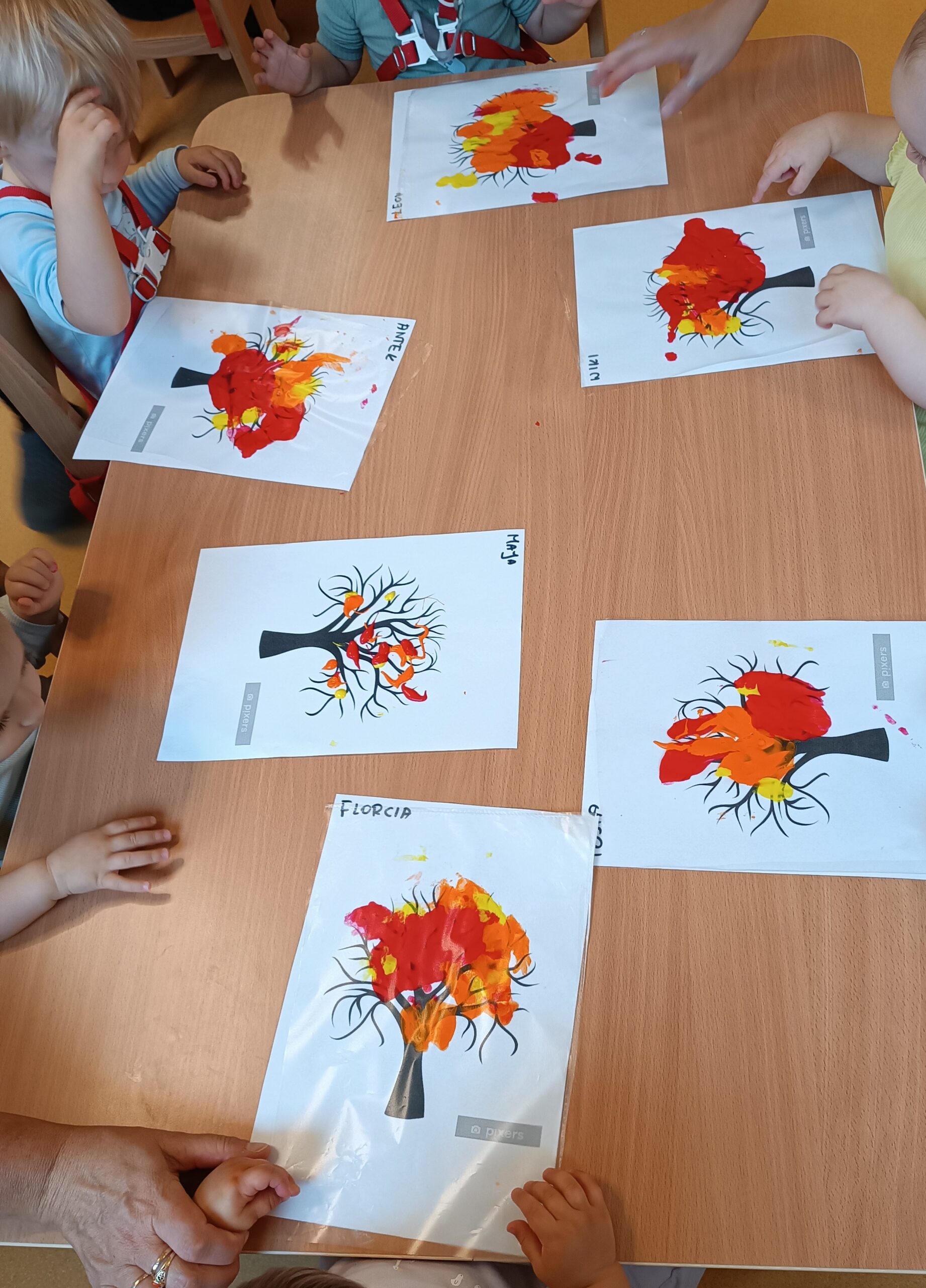 We wrześniu w naszym żłobku odbyły się pełne radości i zabawy zajęcia, które pomogły dzieciom w łagodnej adaptacji do nowego środowiska. Wspólnie obchodziliśmy Dzień Biedronki, który był okazją do pierwszych prac plastycznych – wyklejaliśmy biedronki i odbijaliśmy rączki. Nie zabrakło też zabaw ruchowych – tańczyliśmy z chustami i poznawaliśmy różne instrumenty podczas zajęć muzycznych. Odwiedziła nas Pani Jesień, która przyniosła ze sobą dary jesieni, a dzieci z radością brały udział w malowaniu liści, tworzeniu jesiennego kącika oraz w zabawach sensorycznych. Robiliśmy sok z owoców i warzyw, a także układaliśmy proste puzzle, rozwijając spostrzegawczość i koordynację. Wrzesień był czasem pełnym ciepła, kolorów i pierwszych wspólnych doświadczeń.
