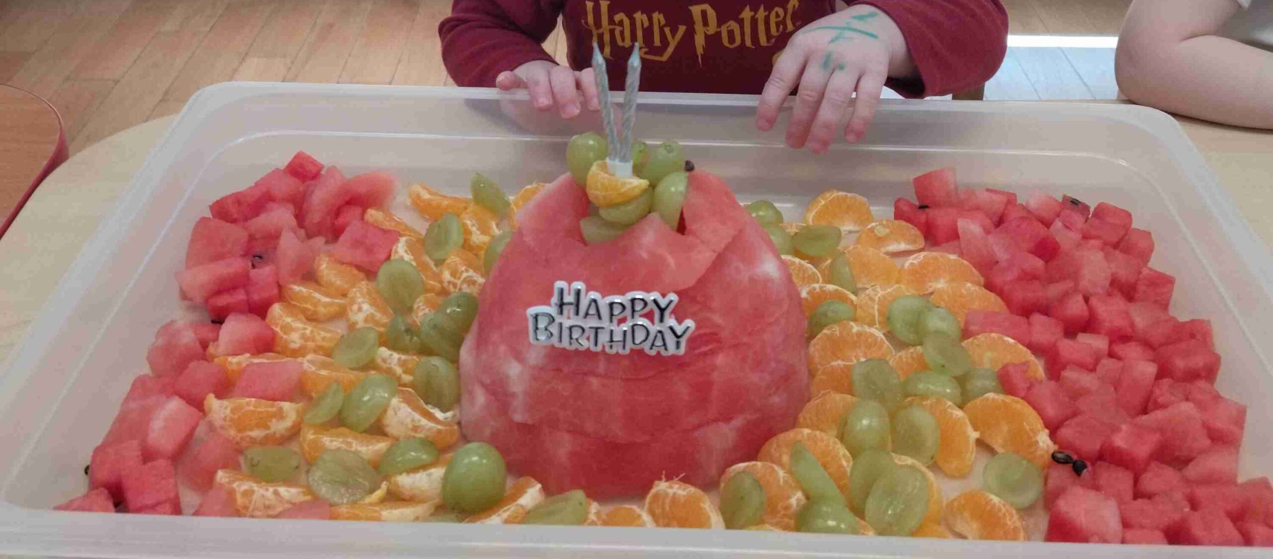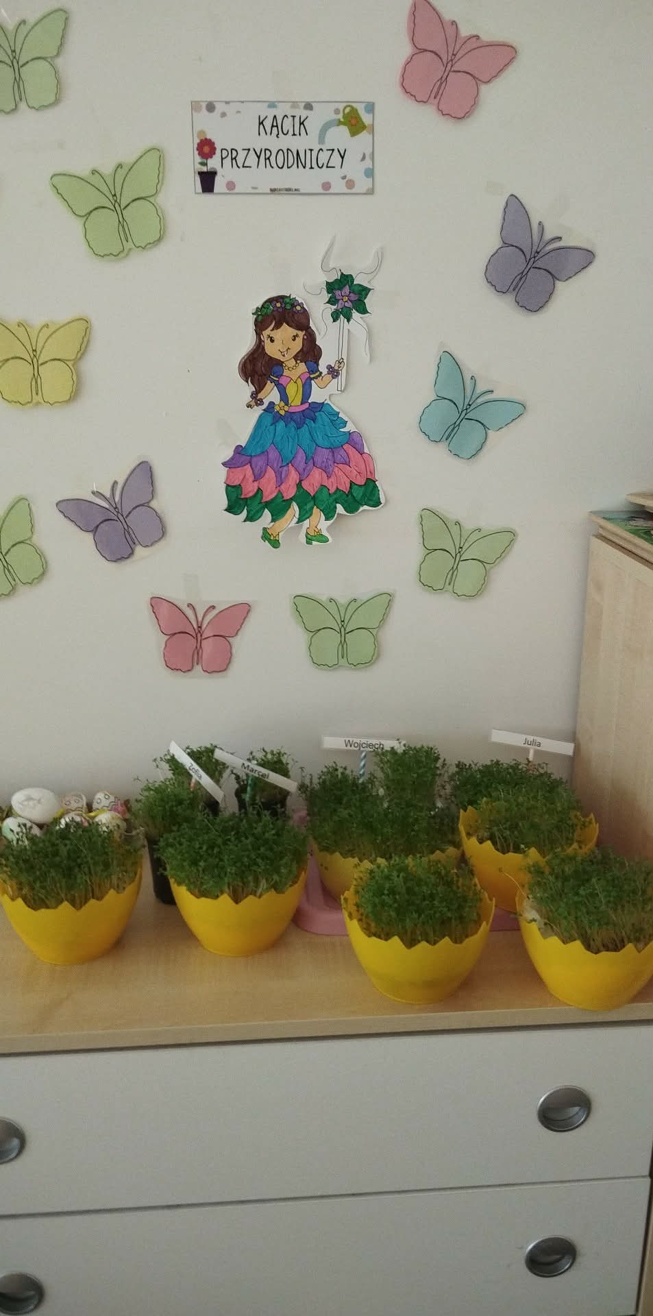 Sadziliśmy kwiaty, sialiśmy rzeżuchę, zrobiliśmy wielkanocną fotobudkę, upiekliśmy maślane ciasteczka. Było mnóstwo zabaw sensorycznych, plastycznych, muzycznych a nawet gimnastyka. Dla dzieci, które miały urodziny panie kucharki przygotowały specjalny tort owocowy.