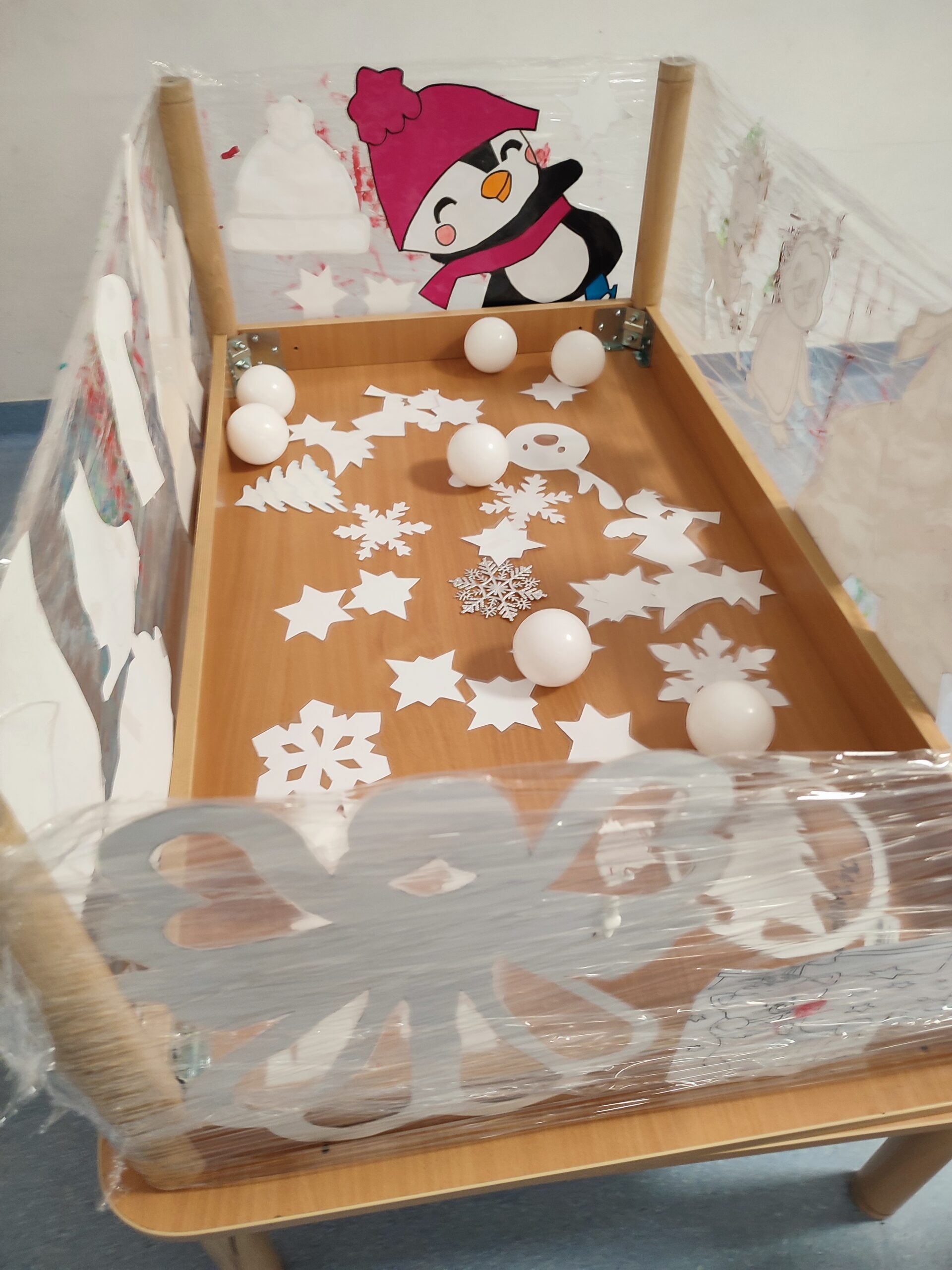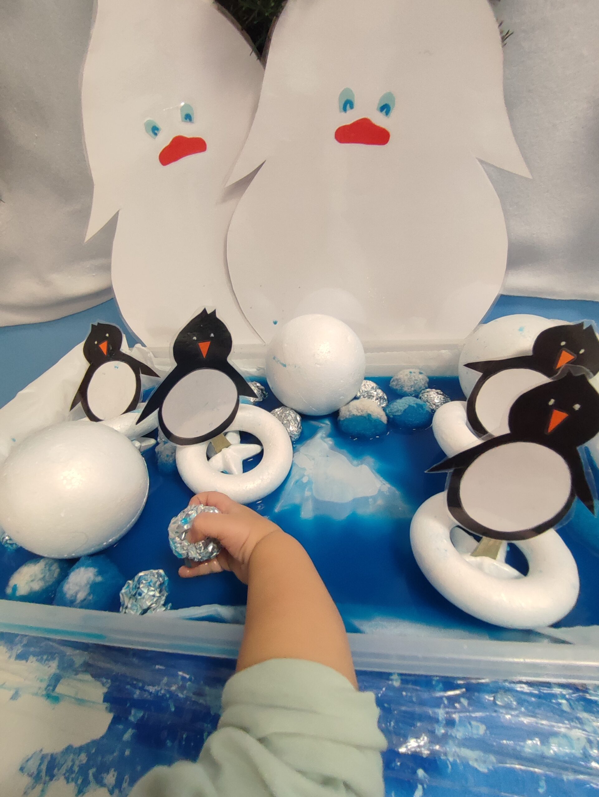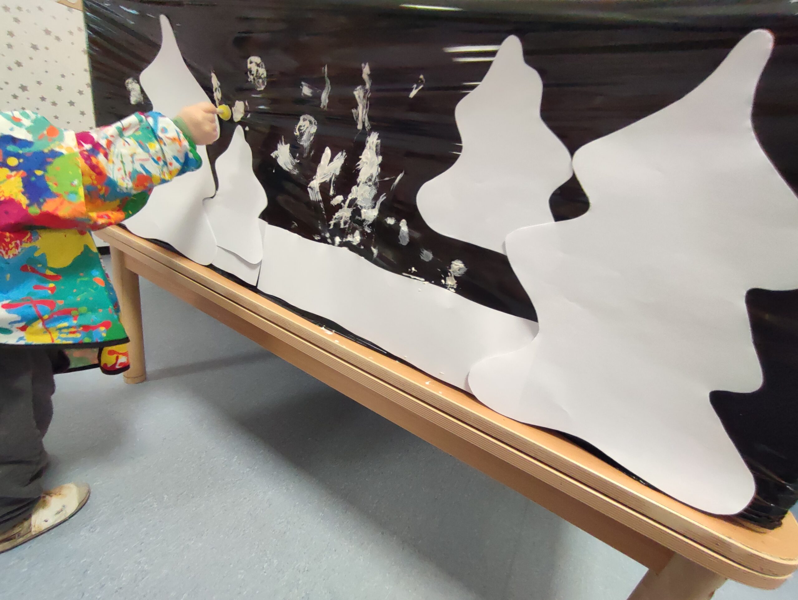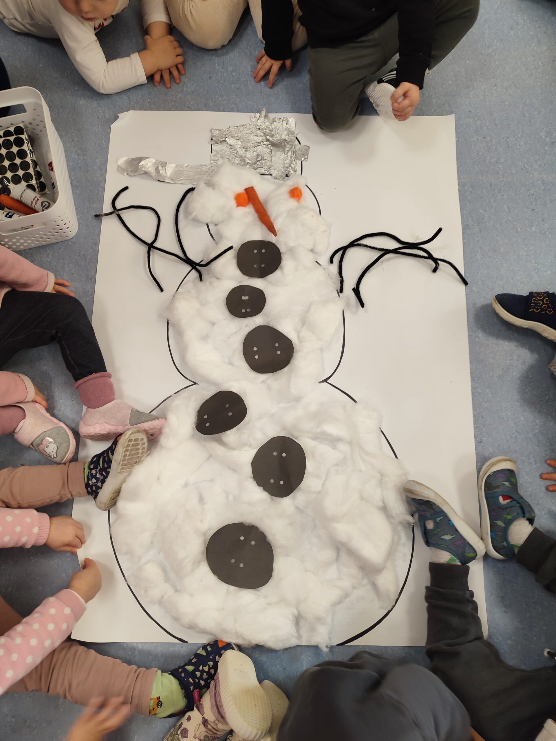 Poprzez zabawy sensoryczne, prace plastyczne i piosenki maluchy doświadczały zimowych tematów.