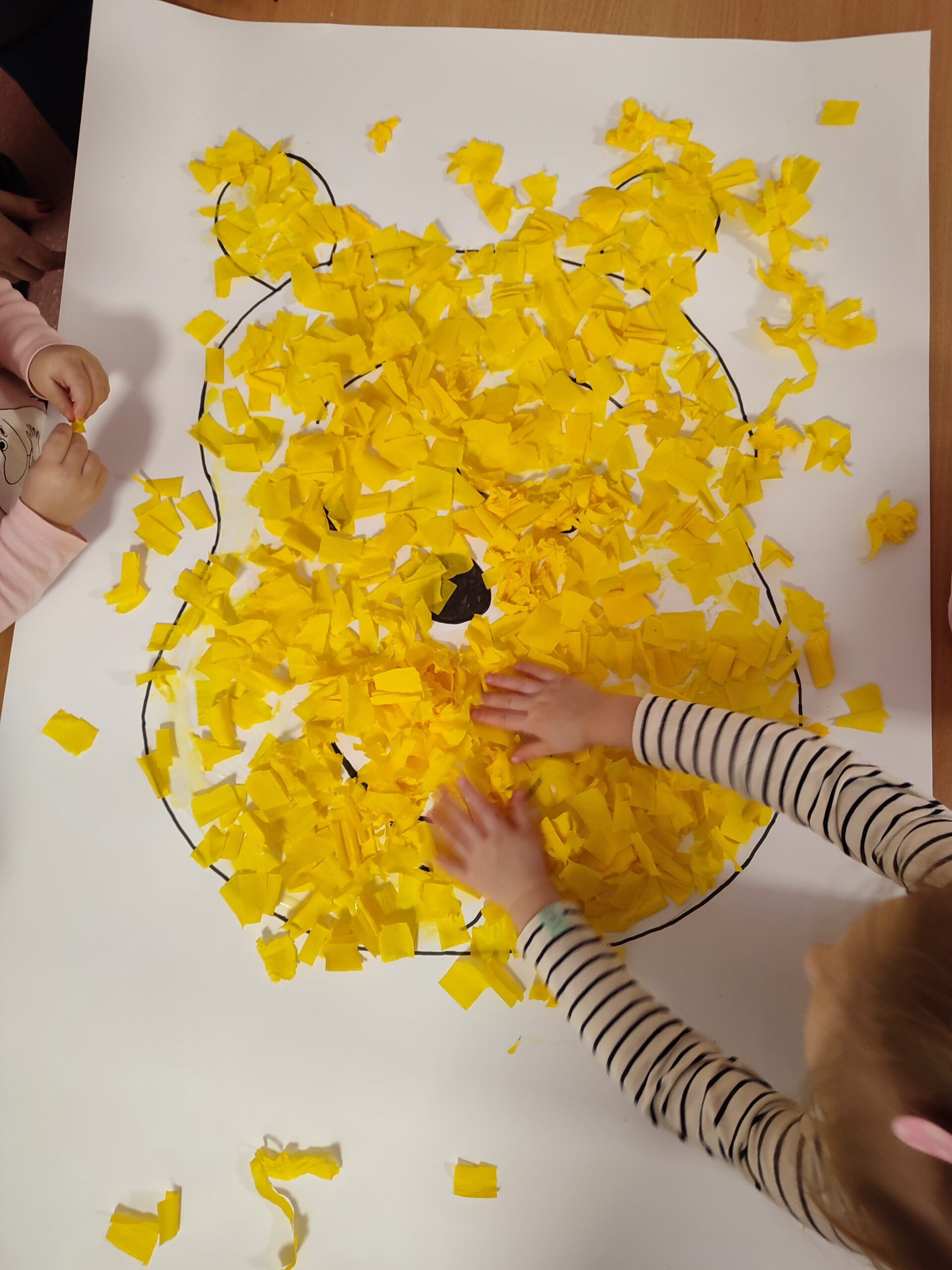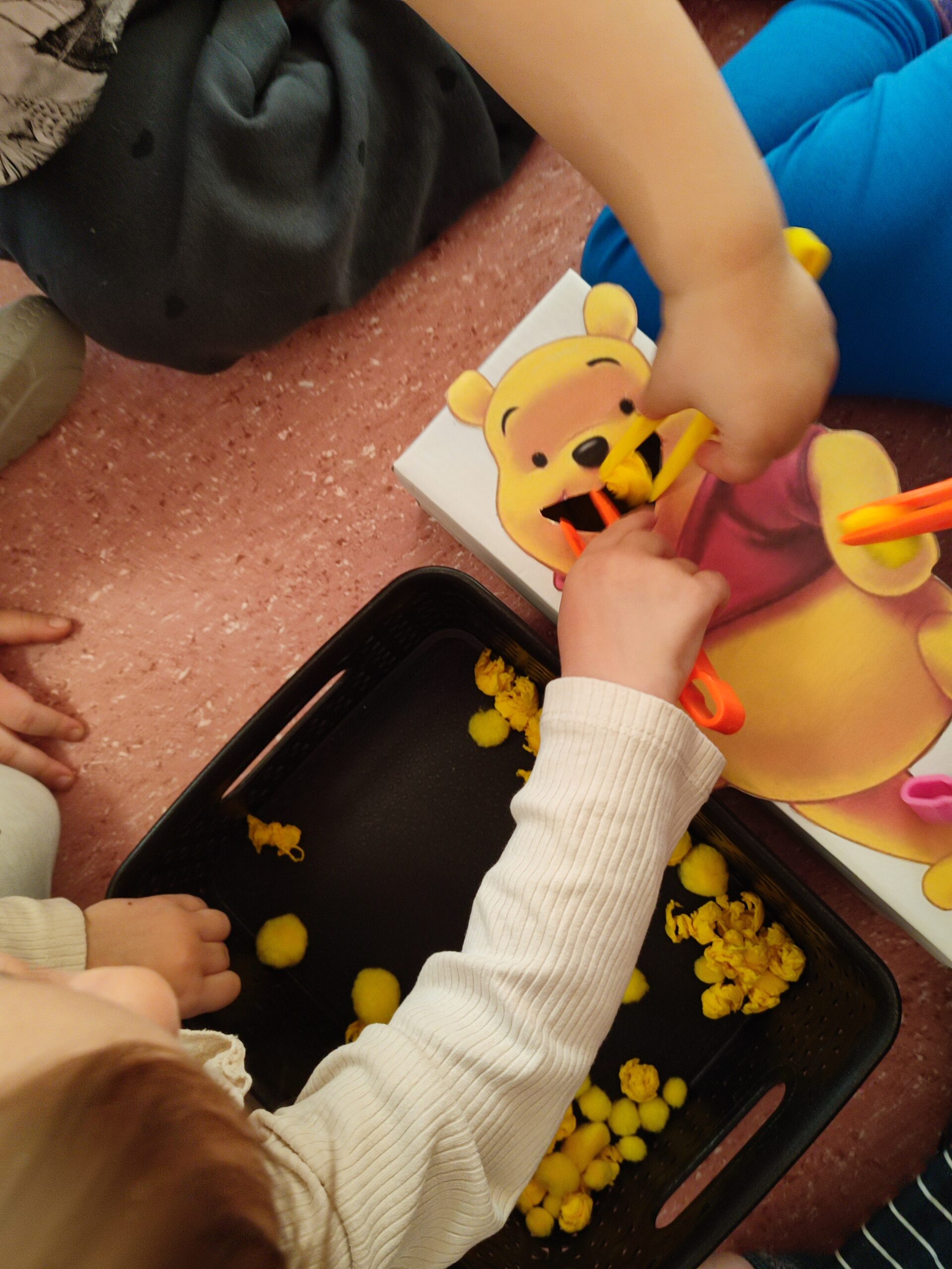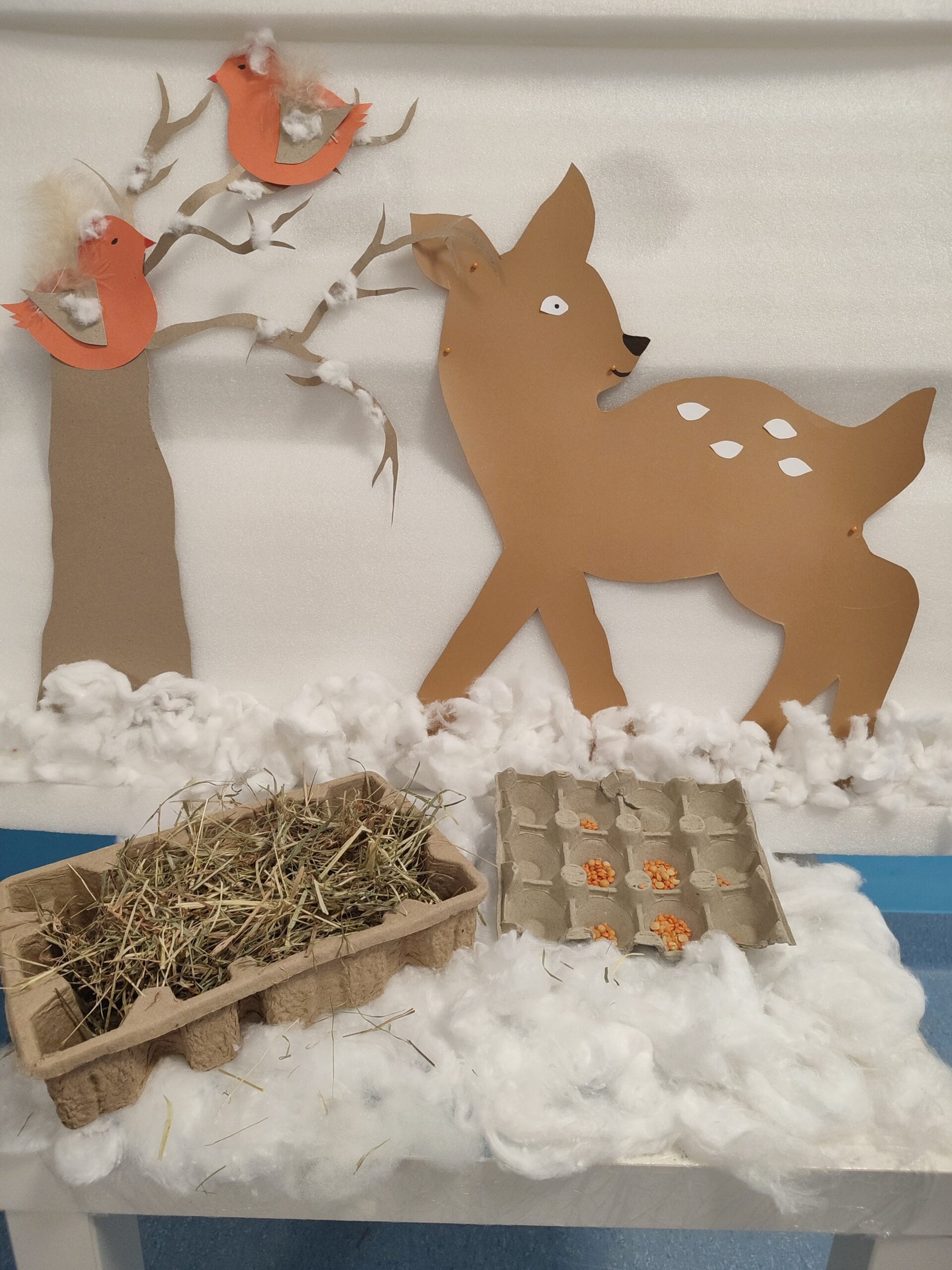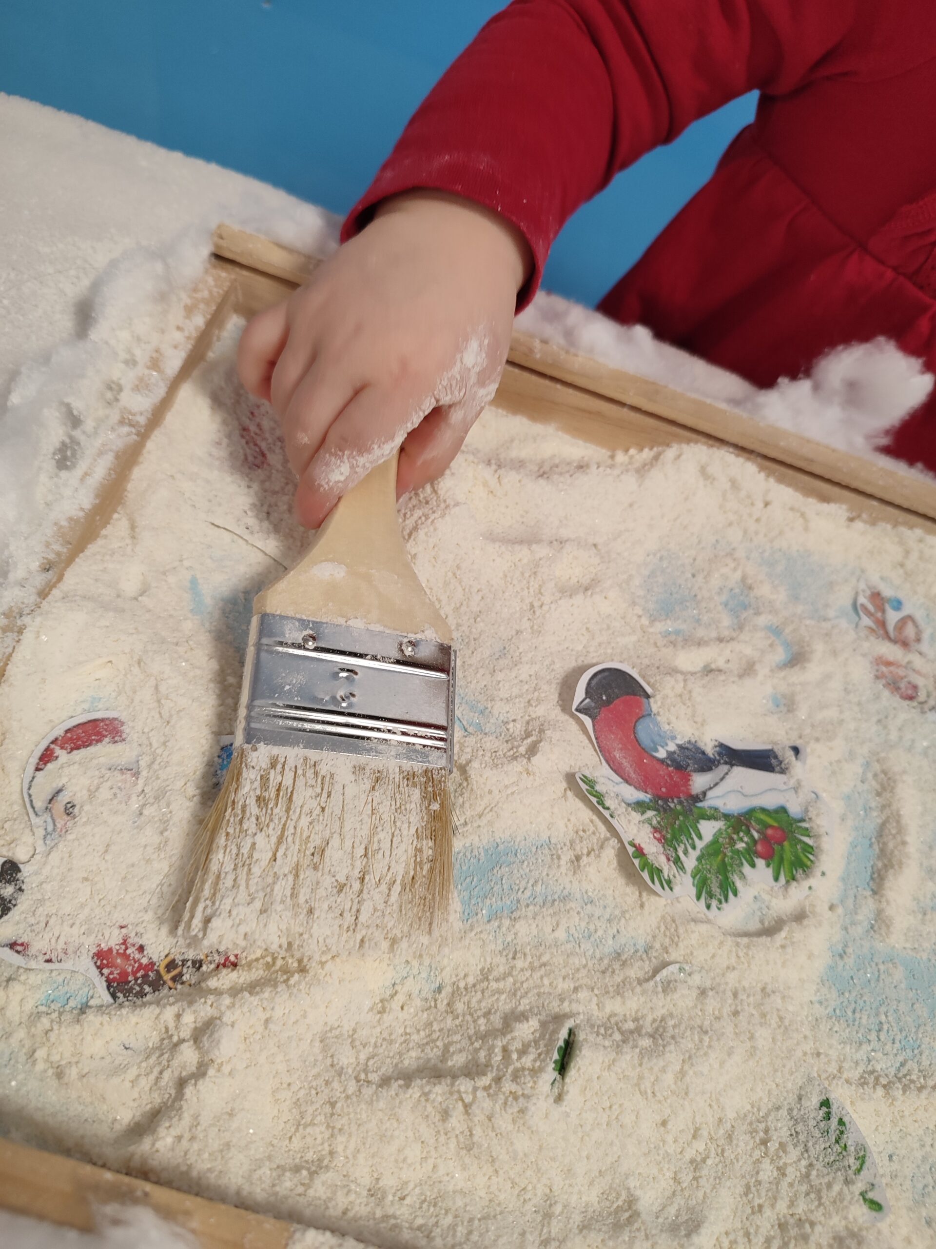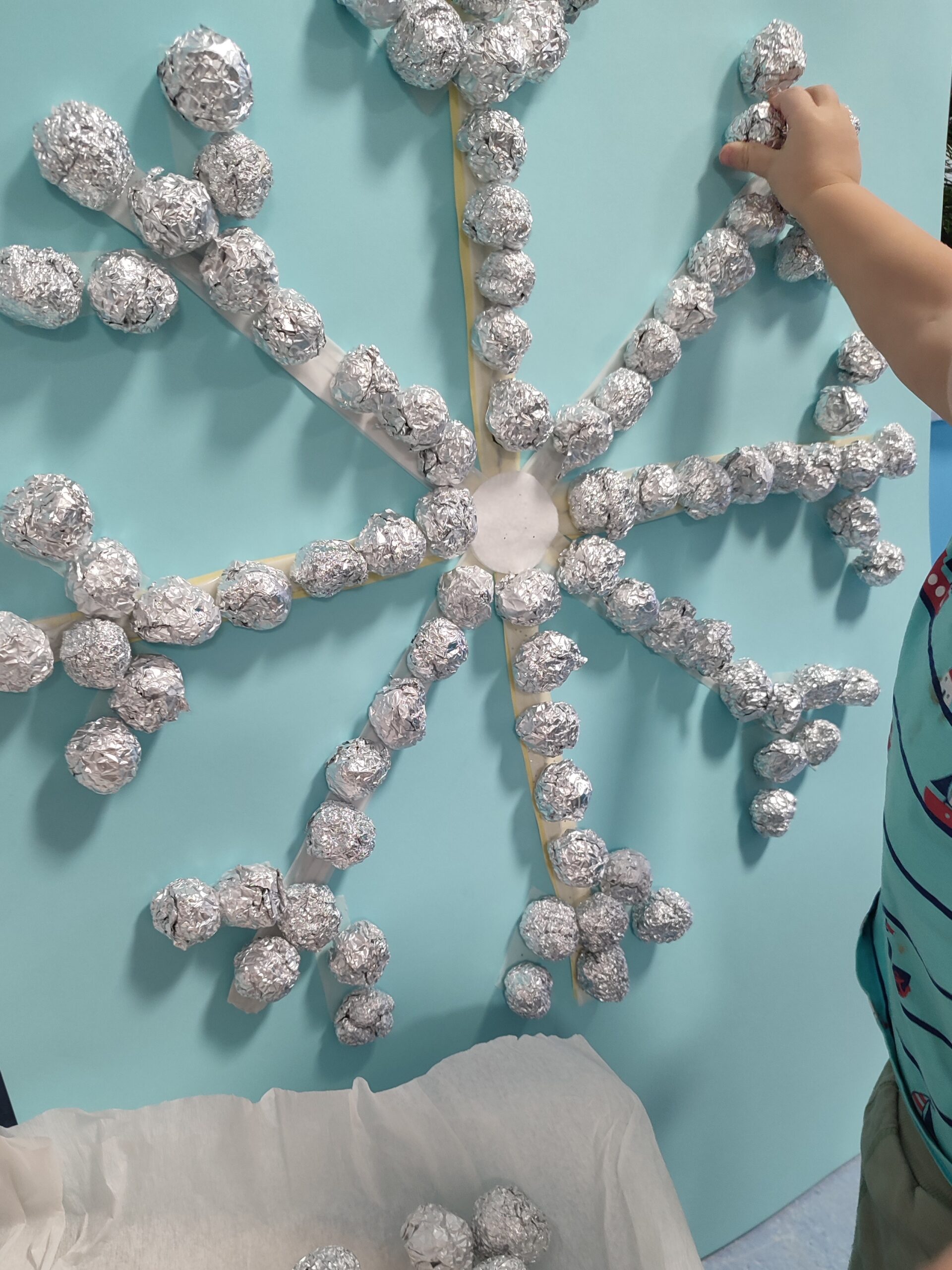 Poprzez zabawy sensoryczne, prace plastyczne i piosenki maluchy doświadczały zimowych tematów.