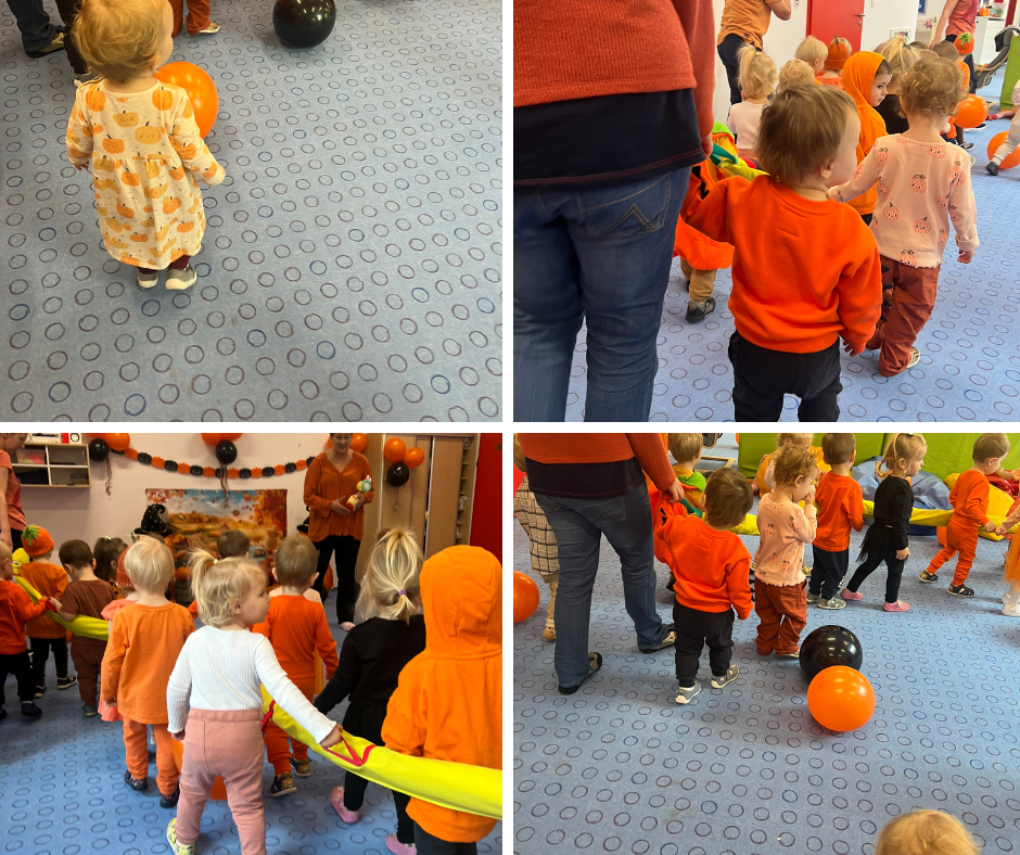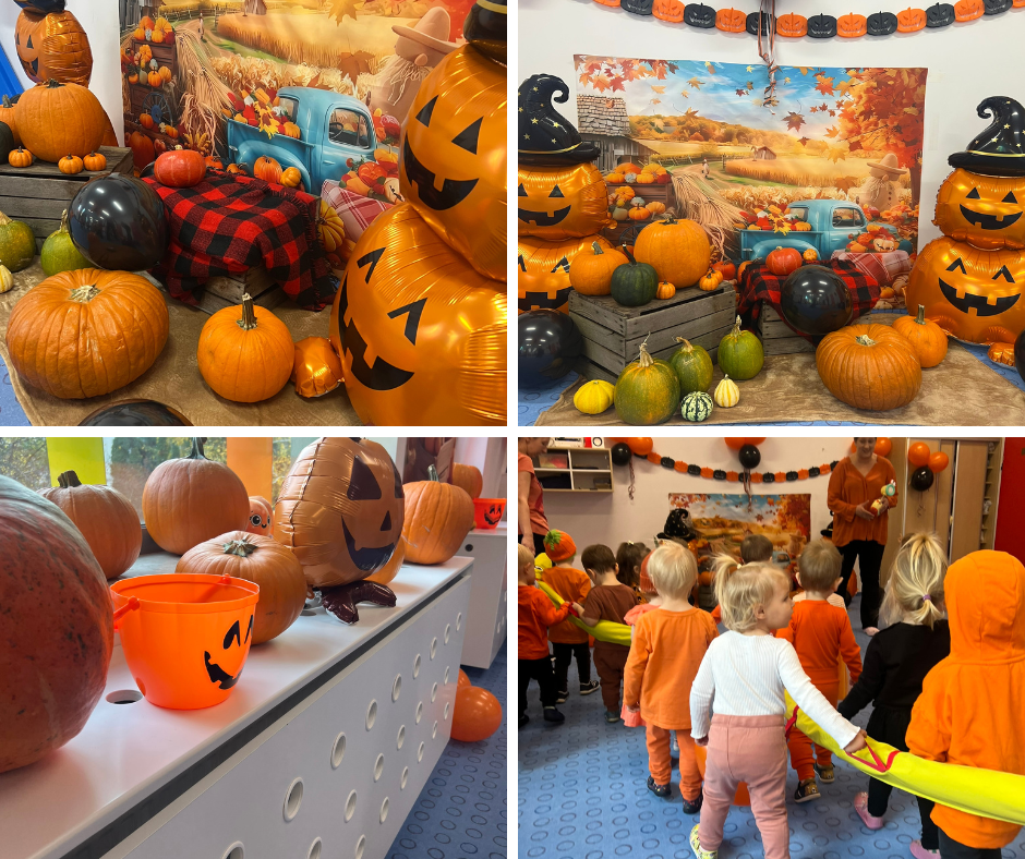 Październik obdarował nas piękną pogodą, a słońce skutecznie poprawiało nastroje i eksponowało różnokolorowe liście na drzewach. Zainspirowani tym faktem, celebrowaliśmy jesienną pogodę zajęciami sensorycznymi z wykorzystaniem darów natury. Dynia – prawdziwa królowa jesieni – pamiętaliśmy i o niej, celebrując bal dyni. Pomarańczowe przebrania i dekoracje, motywy inspirowane dynią – pomysłowość Pań nie miała końca. Nie zabrakło również innych zajęć – udało nam się przebadać pluszaki, a także poznać wiejskie życie! Ah, cóż to była za sielanka! Zobaczcie sami 🙂