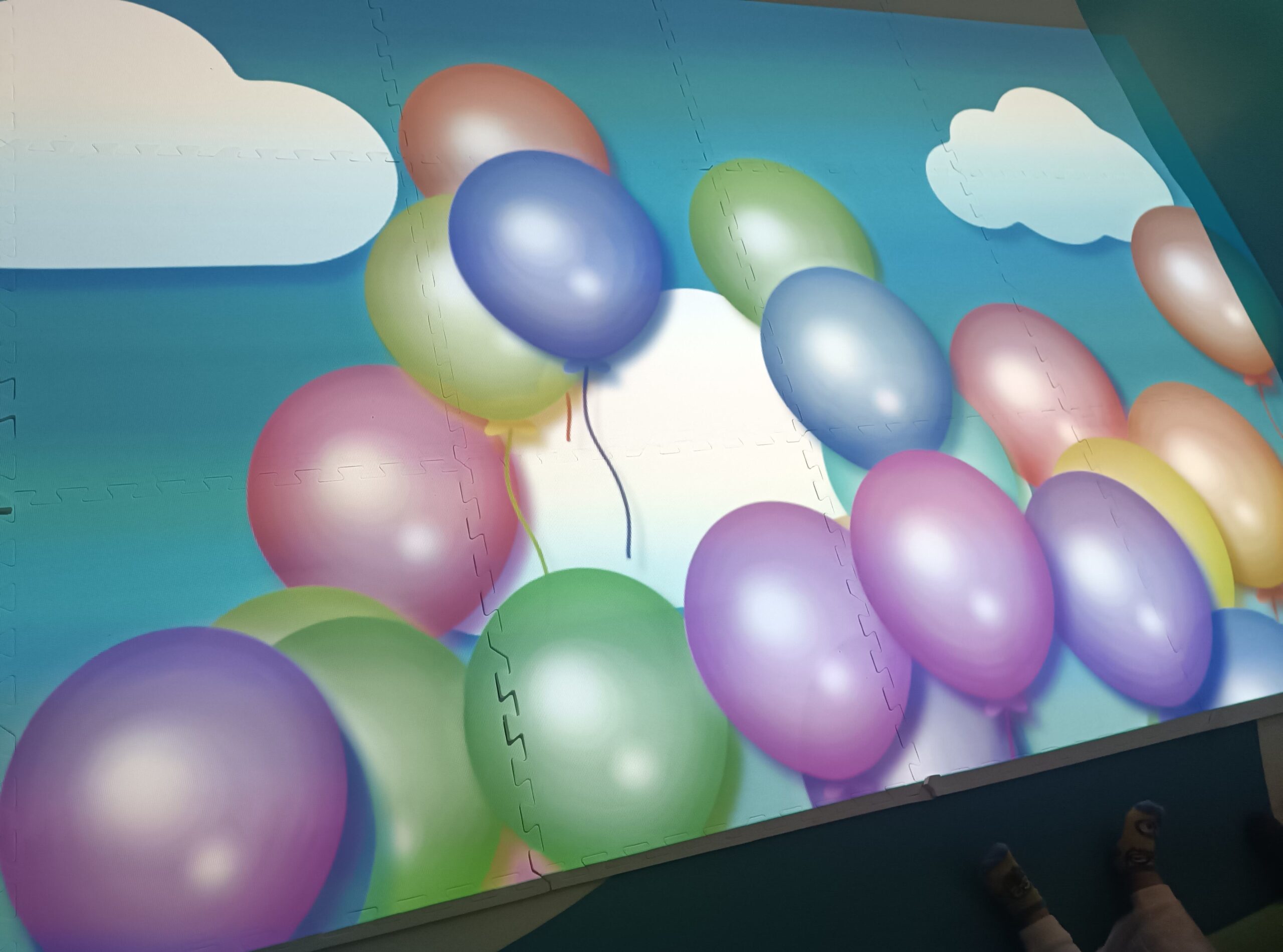 Kiedy po niej biegamy albo skaczemy, na dywanie pojawiają się kolorowe obrazki, zwierzątka, piłki, liście albo bańki, które możemy łapać rączkami albo nogami! 🎈