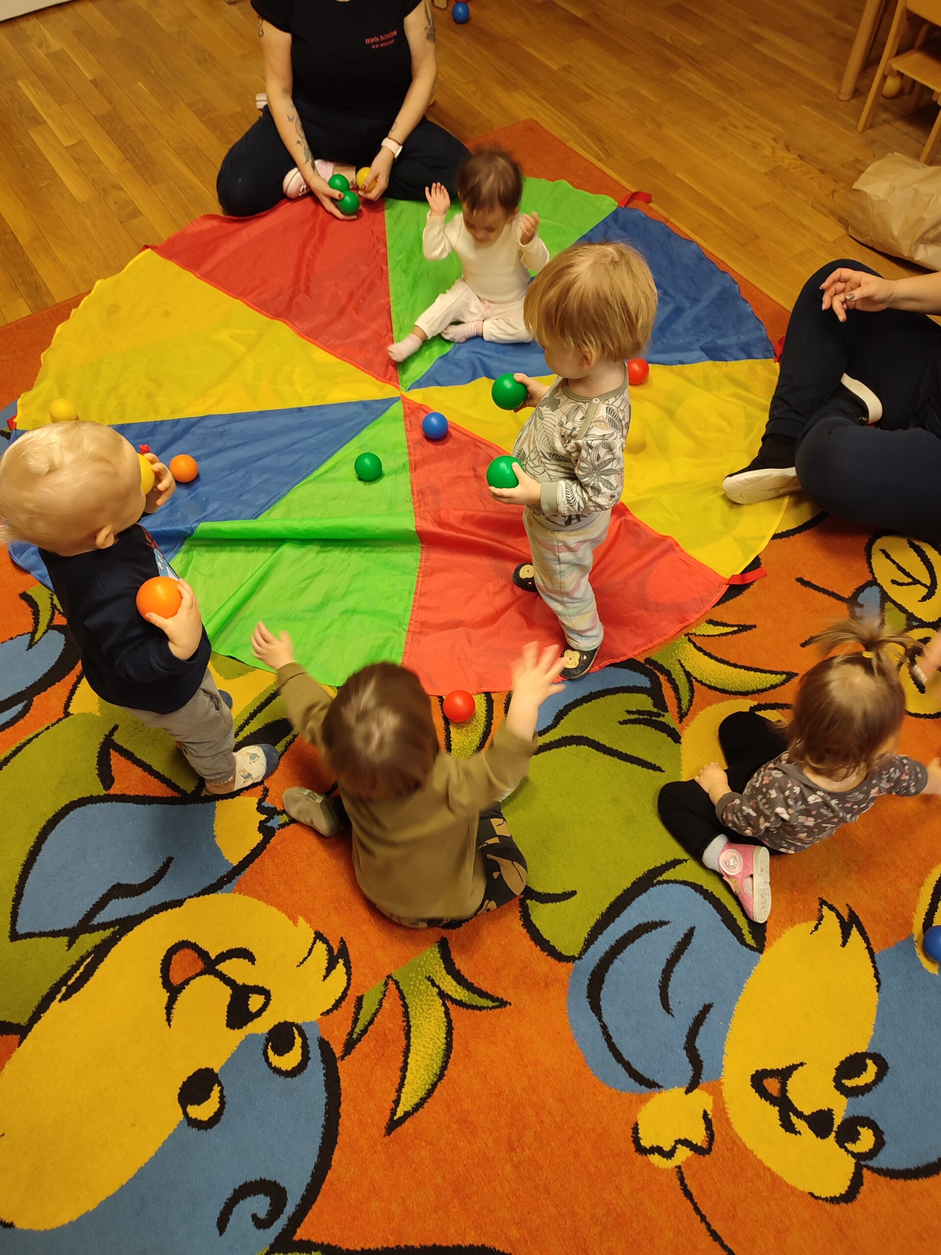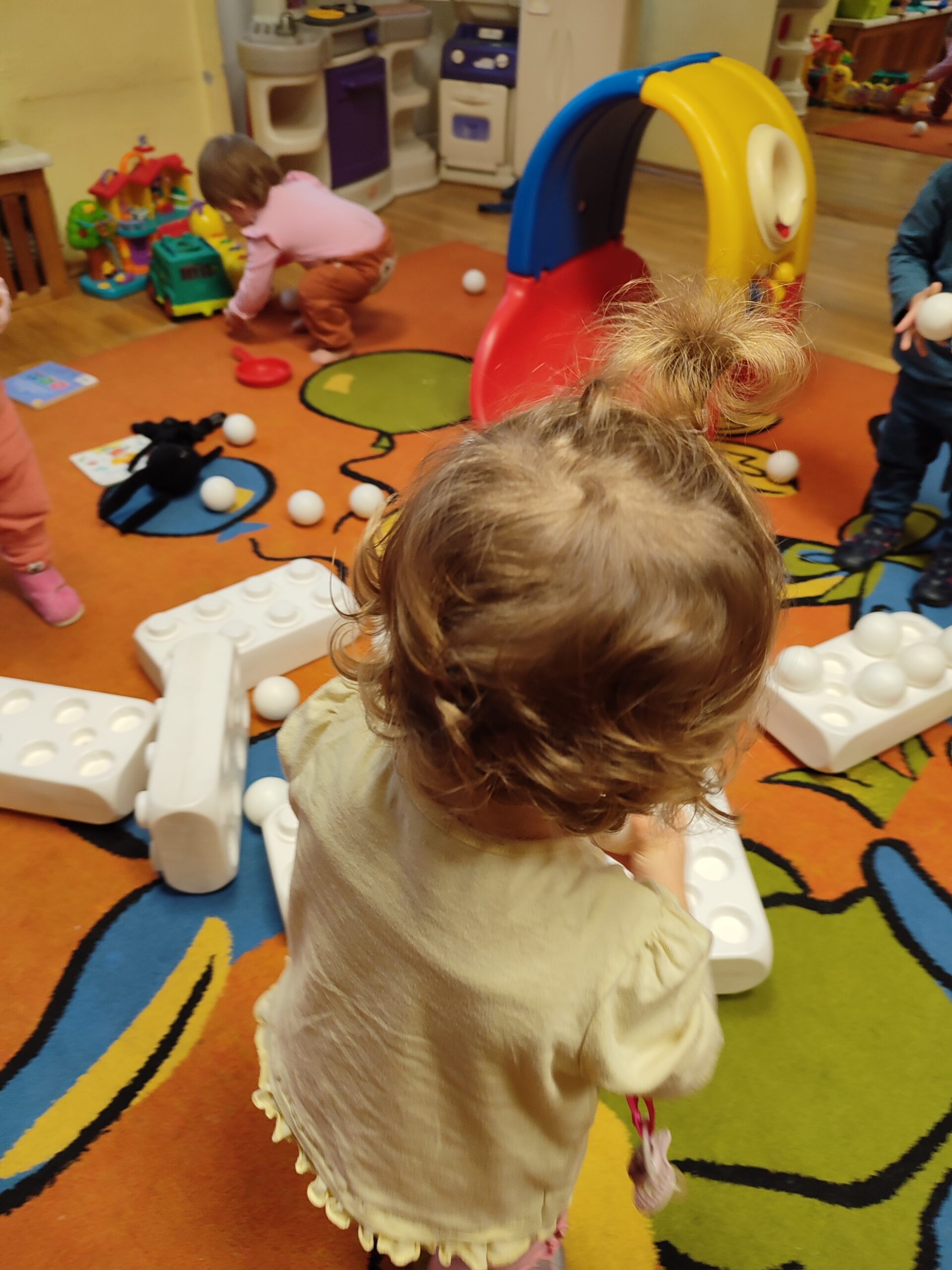 - Segregowaliśmy kuleczki według kolorów na chuście animacyjnej.