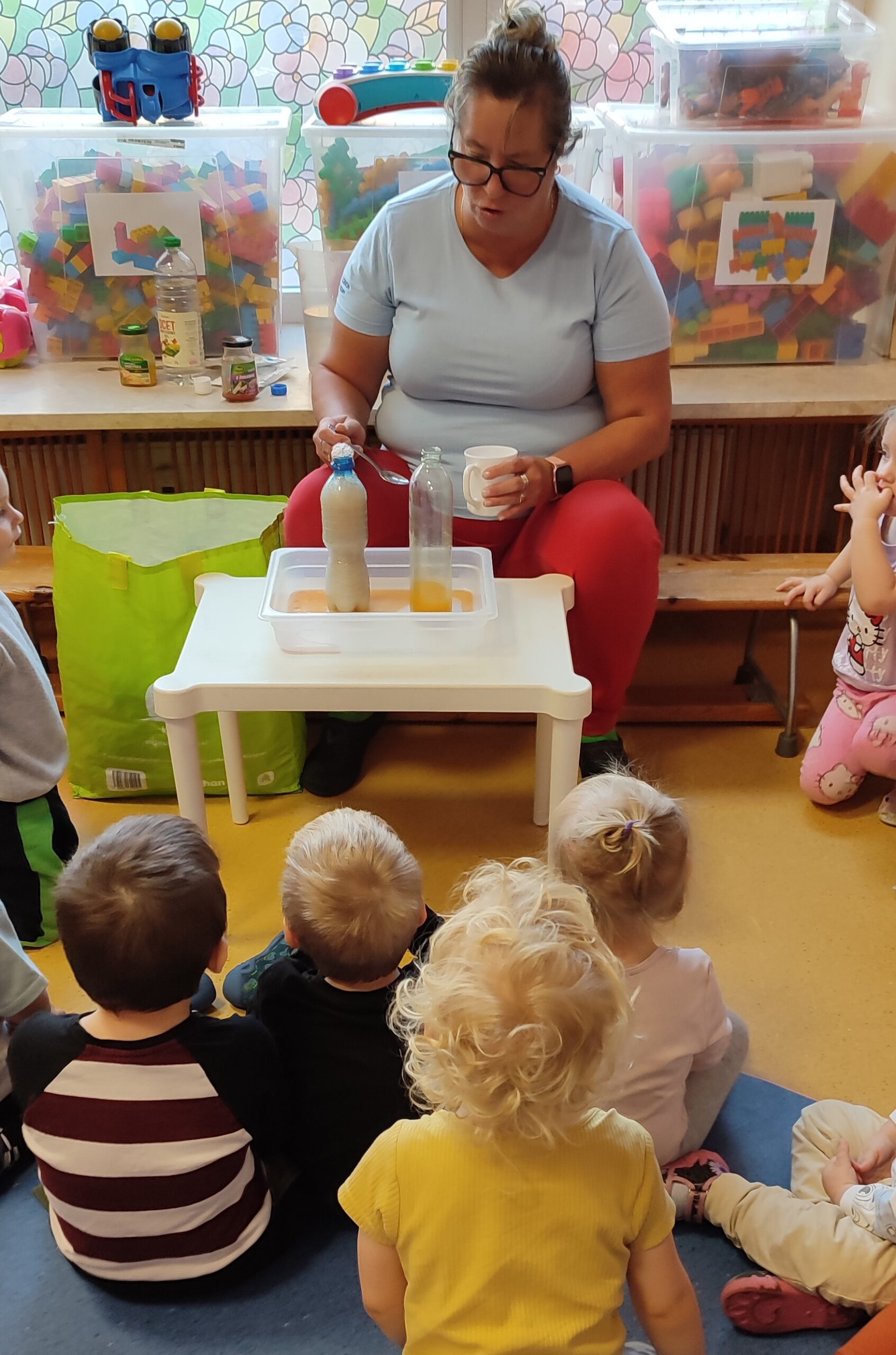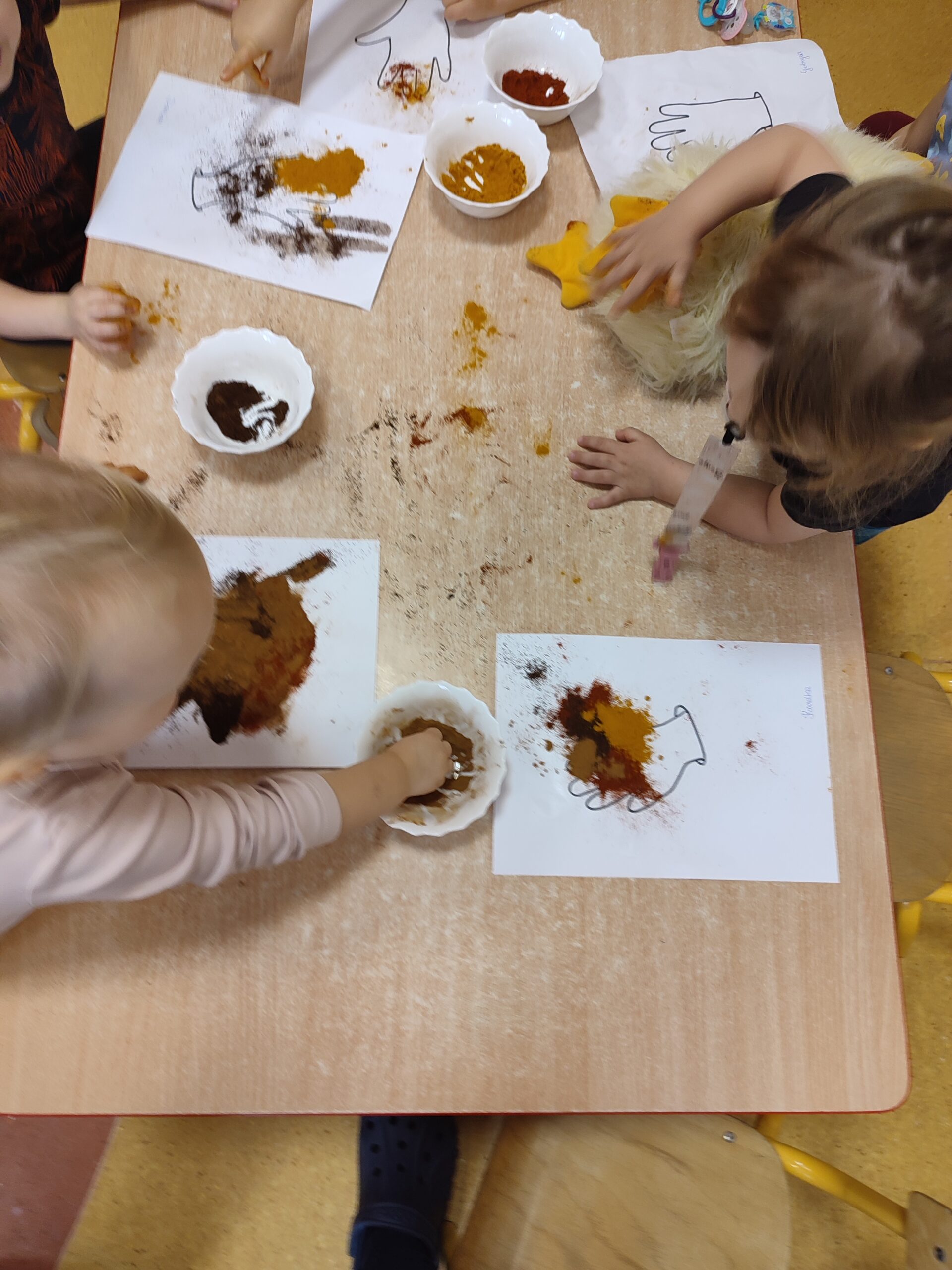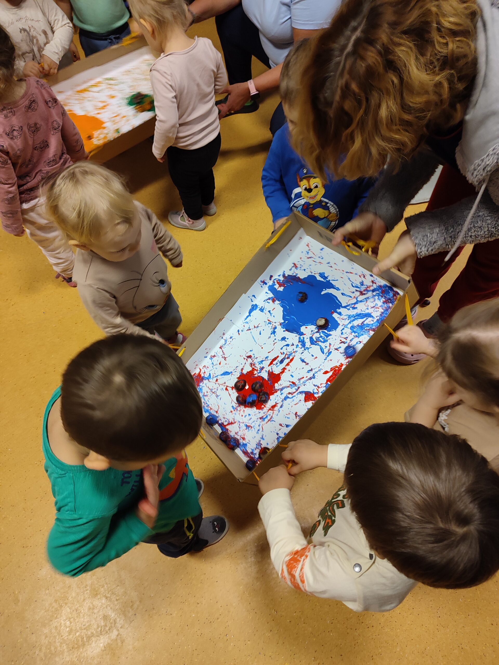 Z kolei u naszych starszych kolegów w mini żłobku były aktywności stymulujące zmysły. Był piasek kinetyczny, malowanie przyprawami (papryka słodka, kawa, pieprz, cynamon), węchowe memory, szukanie skarbów w galaretce. Ich ciocie robiły z nimi też eksperymenty w ramach tygodnia ZABAWA I NAUKA. Malowali magnesem, mieli „wybuchowe butelki – do wody ciocia dodawała kwasek cytrynowy i sodę, a już po chwili z butelki wydobywała się piana 🙂 Oni również bawili się w JESIENNĄ POGODĘ – skakali po kałużach wyciętych z niebieskiego brystolu i chodzili pod parasolem w sali i na placu zabaw.