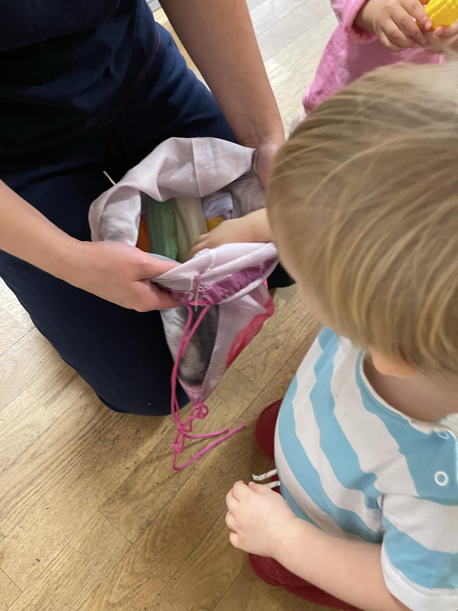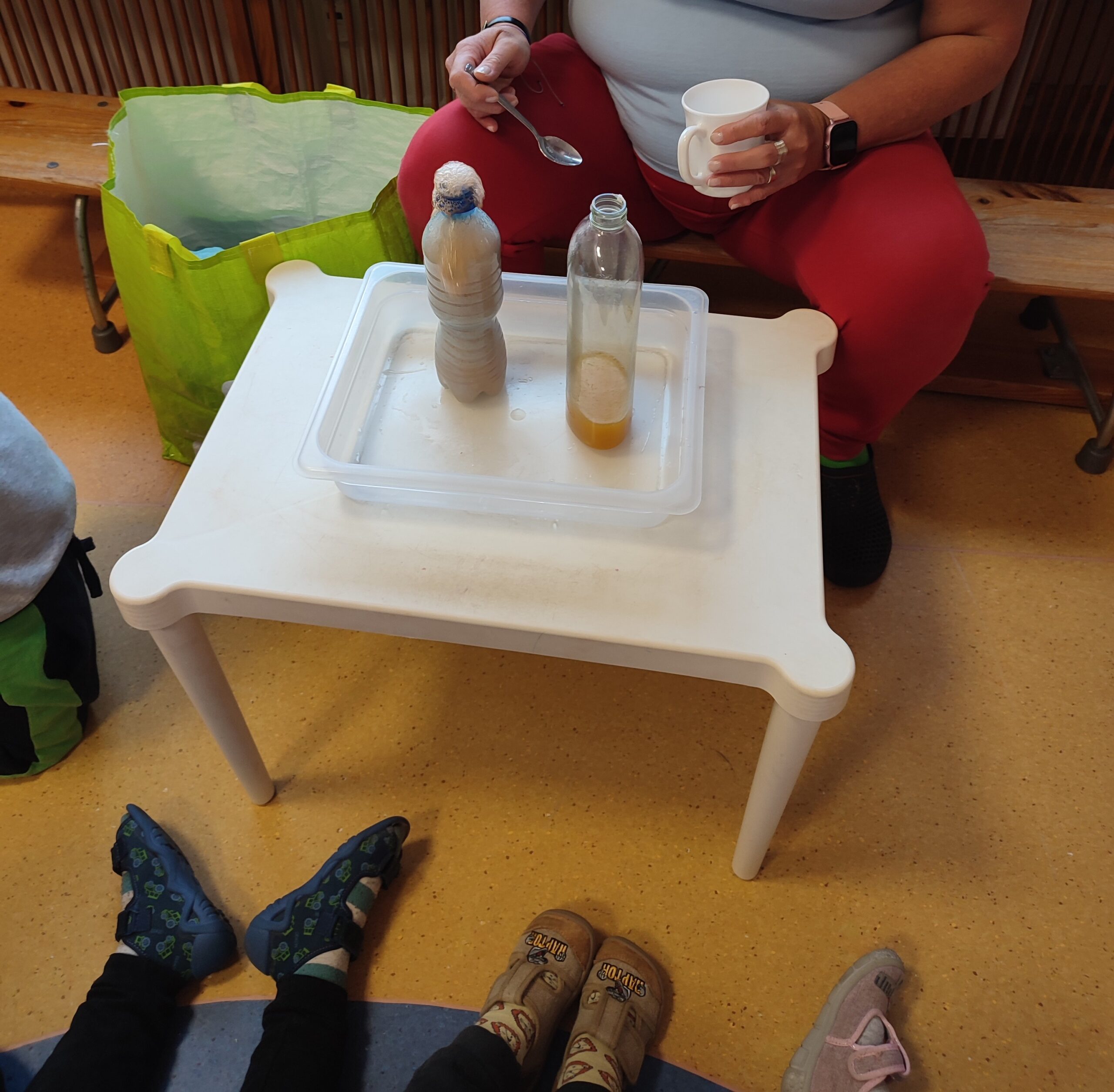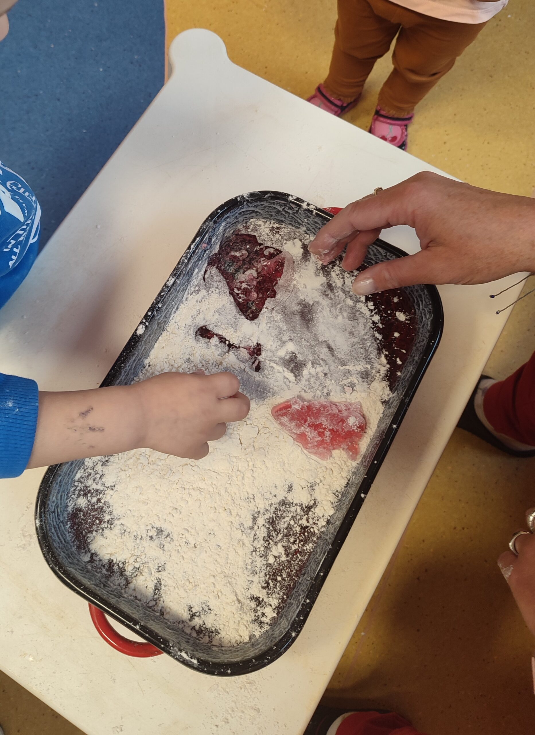 Z kolei u naszych starszych kolegów w mini żłobku były aktywności stymulujące zmysły. Był piasek kinetyczny, malowanie przyprawami (papryka słodka, kawa, pieprz, cynamon), węchowe memory, szukanie skarbów w galaretce. Ich ciocie robiły z nimi też eksperymenty w ramach tygodnia ZABAWA I NAUKA. Malowali magnesem, mieli „wybuchowe butelki – do wody ciocia dodawała kwasek cytrynowy i sodę, a już po chwili z butelki wydobywała się piana 🙂 Oni również bawili się w JESIENNĄ POGODĘ – skakali po kałużach wyciętych z niebieskiego brystolu i chodzili pod parasolem w sali i na placu zabaw.