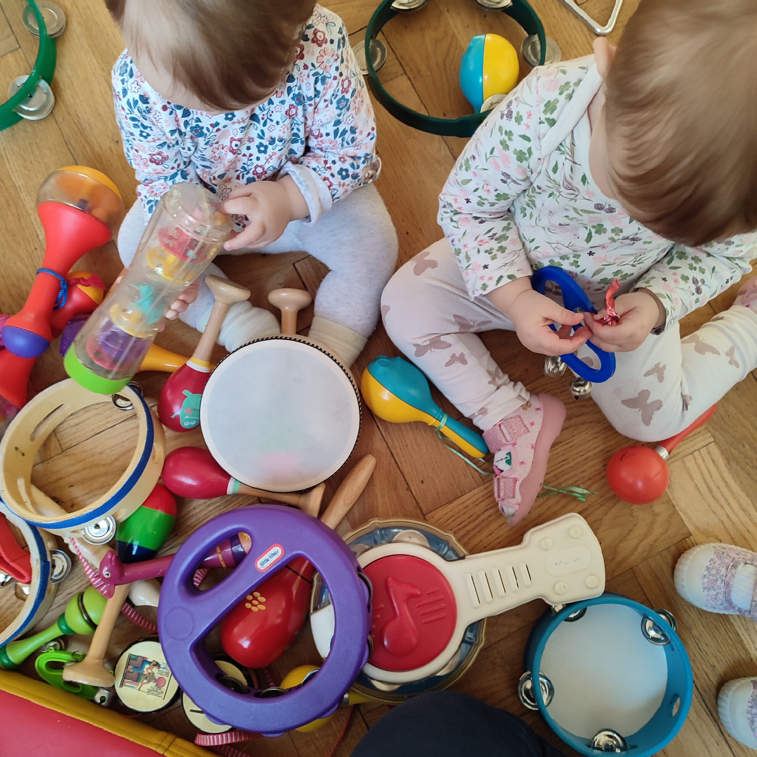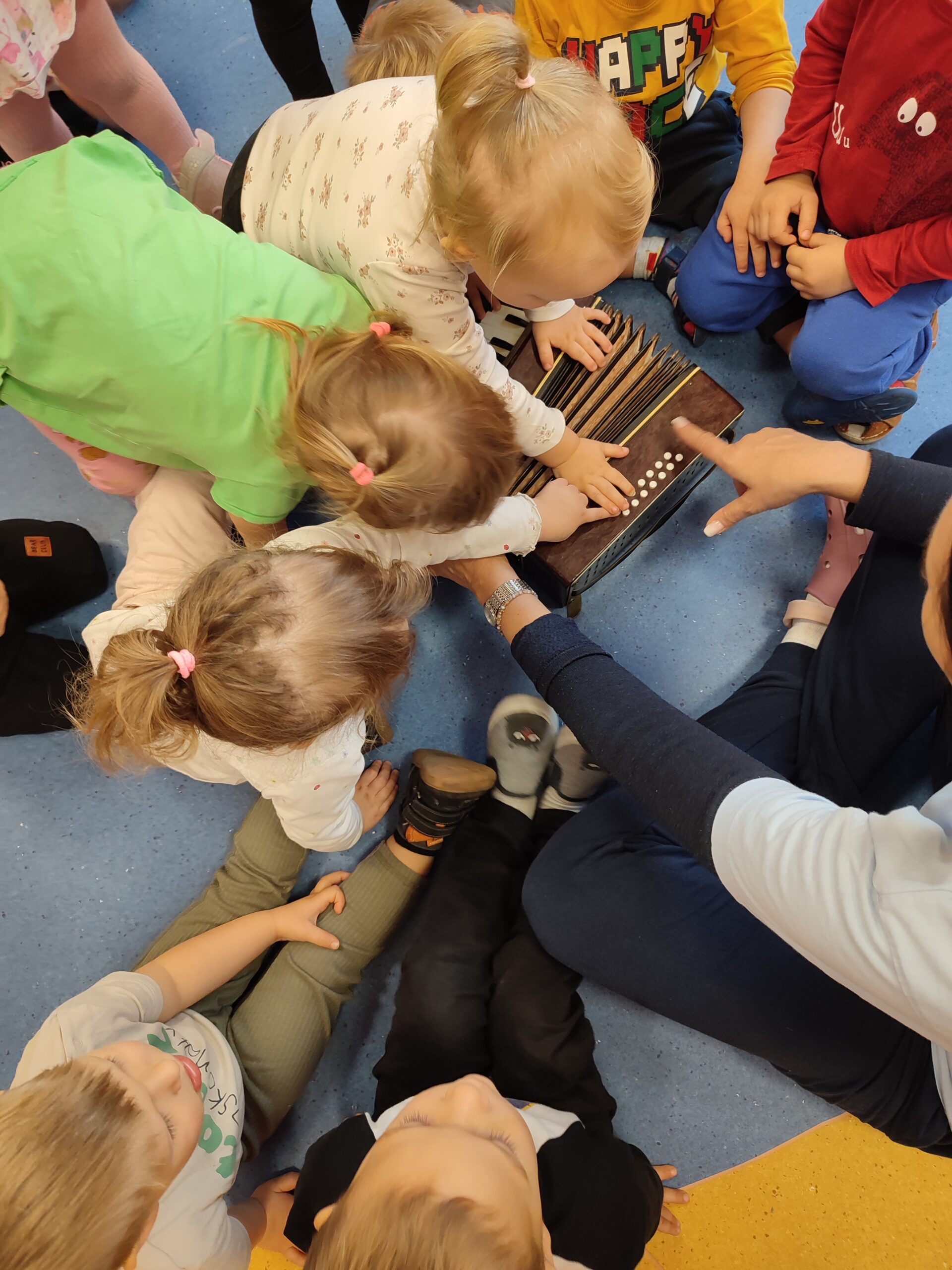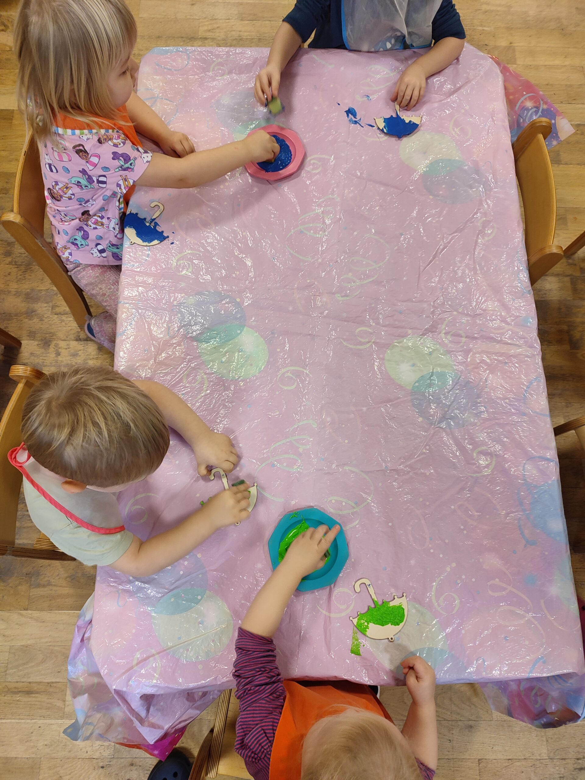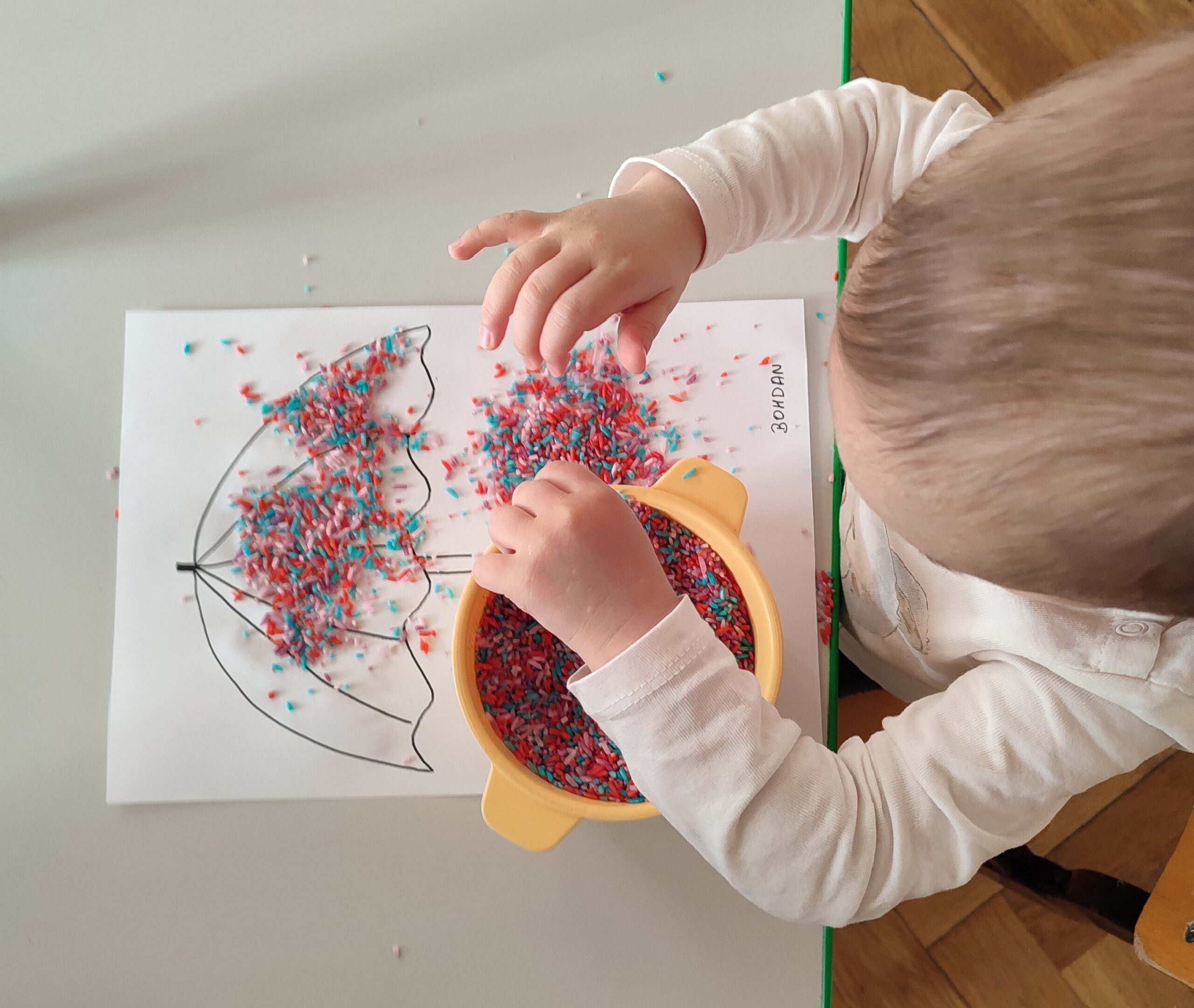 Nasi młodsi koledzy oprócz codziennych wyjść na plac zabaw bawili się kolorowym ryżem, który próbowali przyklejać na kartkę z konturami parasolki. Mieli też zabawę „Co ukryło się w pudełku?”. Wyciągali stamtąd przeróżne rzeczy, np. suchy makaron, małe samochodziki, pomponiki, kulki z folii aluminiowej. Bawili się też w jesienną orkiestrę – grali na instrumentach i większość dzieci wybierała sobie grzechotki. Ich ciocie naśladowały szelest jesiennych liści w parku, szeleszcząc różnymi przedmiotami – papierem, sreberkiem, liśćmi przyniesionymi z placu zabaw lub klaszcząc. Maluchy tak jak i my bawiły się w DESZCZOWĄ POGODĘ. Chodziły po sali pod parasolem i w kaloszach, malowały chmurki i parasolki.