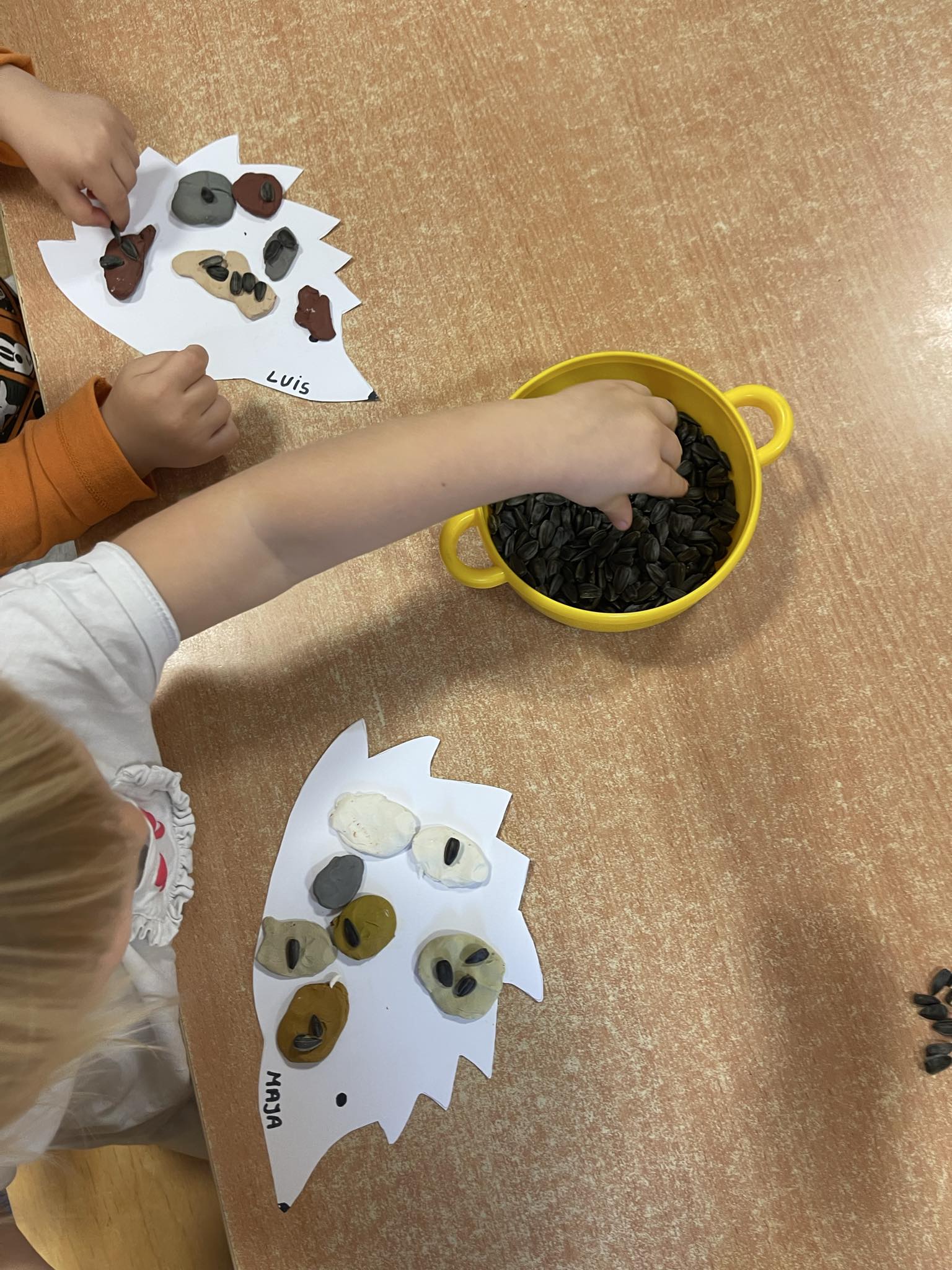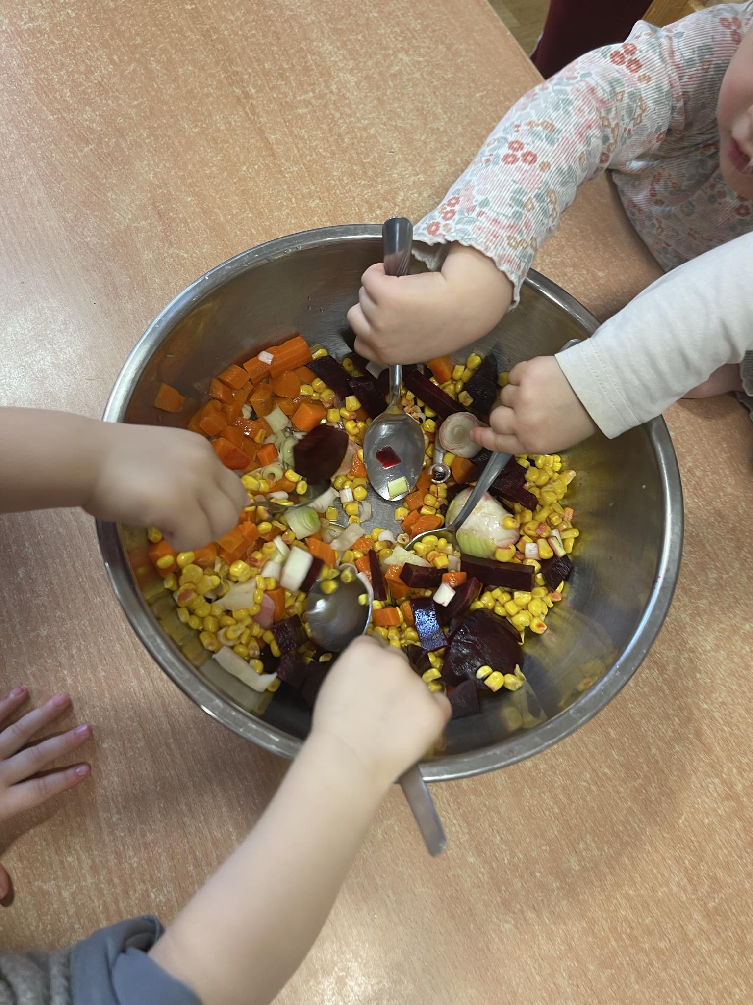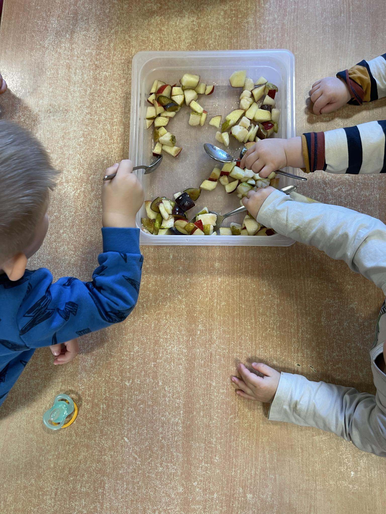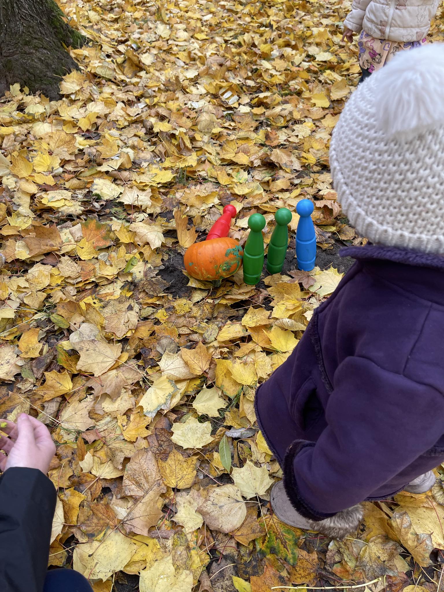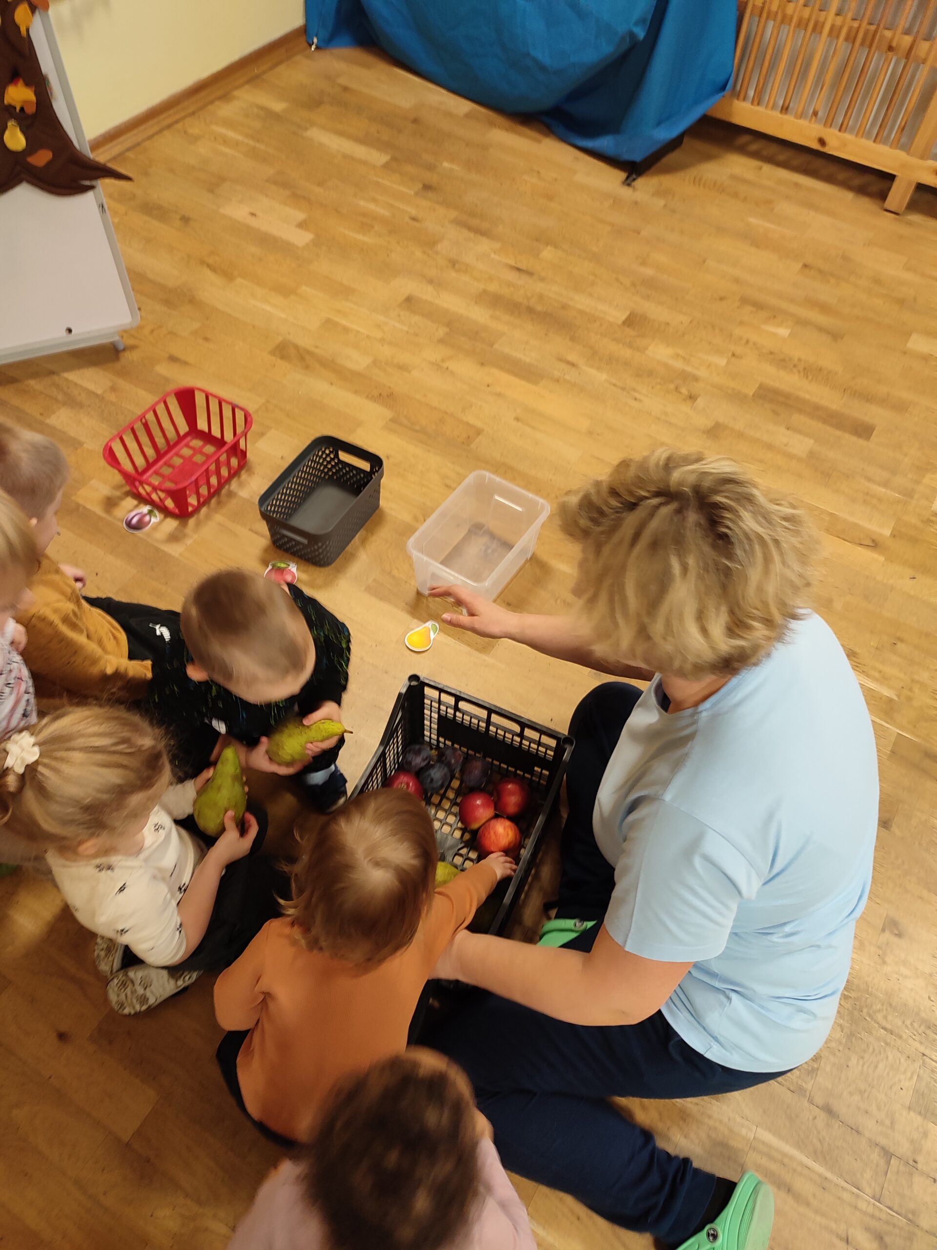 Bawiliśmy się zarówno w salach jak i na dworze. W czasie pobytu wewnątrz nasze ciocie wymyślały nam przeróżne aktywności – robiliśmy sałatki z warzyw i owoców jesiennych. Rozpoznawaliśmy owoce i warzywa pod względem koloru i wielkości. Podczas spacerów w żłobkowym ogrodzie, graliśmy w dyniowe kręgle. Szukaliśmy też jeży. W czasie tygodnia „Jeża” – wykonywaliśmy pracę plastyczną JEŻ z pestek słonecznika. W tygodniu JESIENNA POGODA malowaliśmy pogodę do muzyki. Każdy malował tak jak chciał.