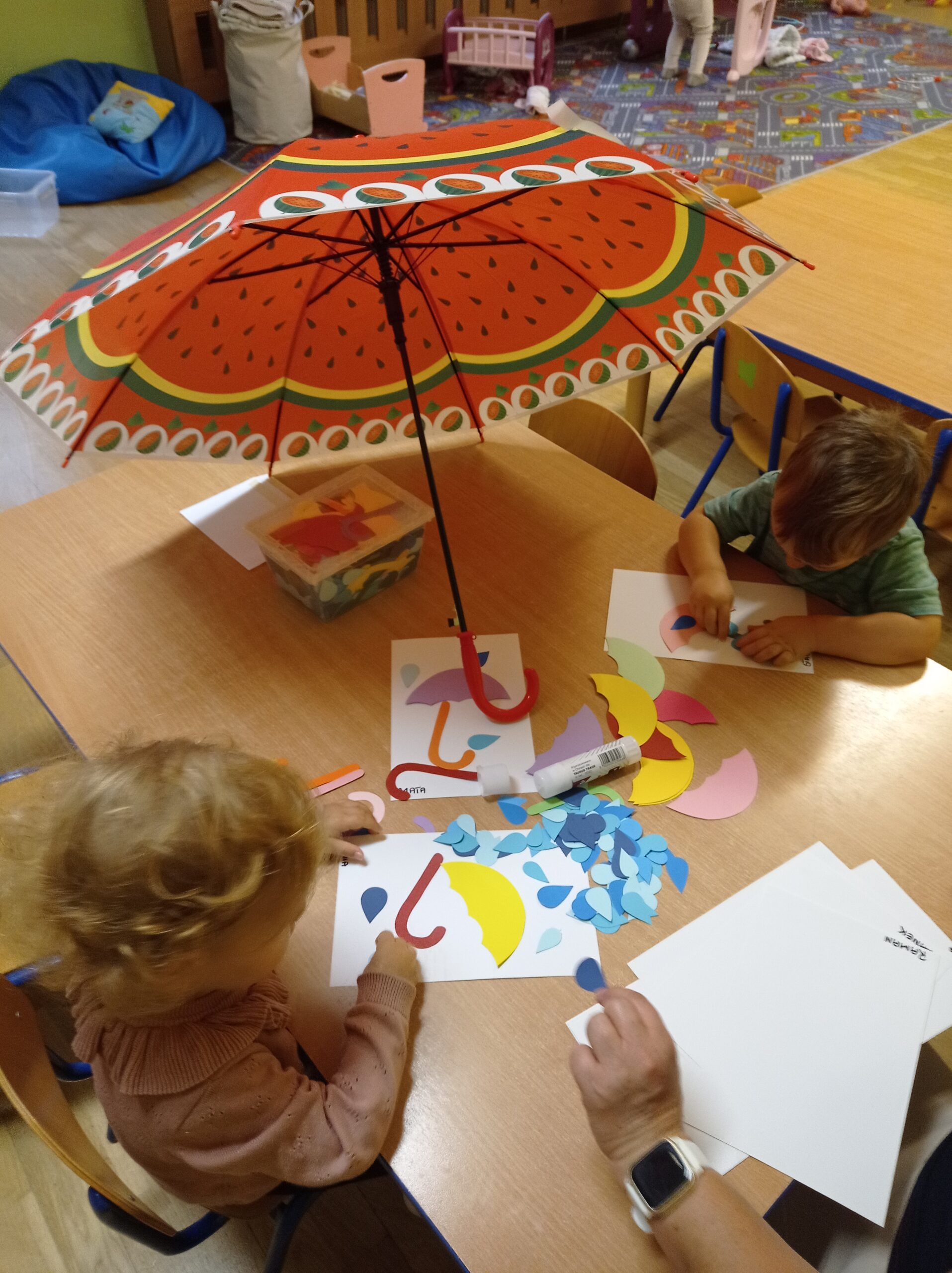 Za oknem pogoda zmieniała się jak w kalejdoskopie – raz słońce, raz deszcz, a czasem wiatr. Obserwowaliśmy te zmiany i rozmawialiśmy o jesiennej aurze. Nie zabrakło także radosnych zabaw z parasolem, które przyniosły nam mnóstwo uśmiechu i ruchu. ☔