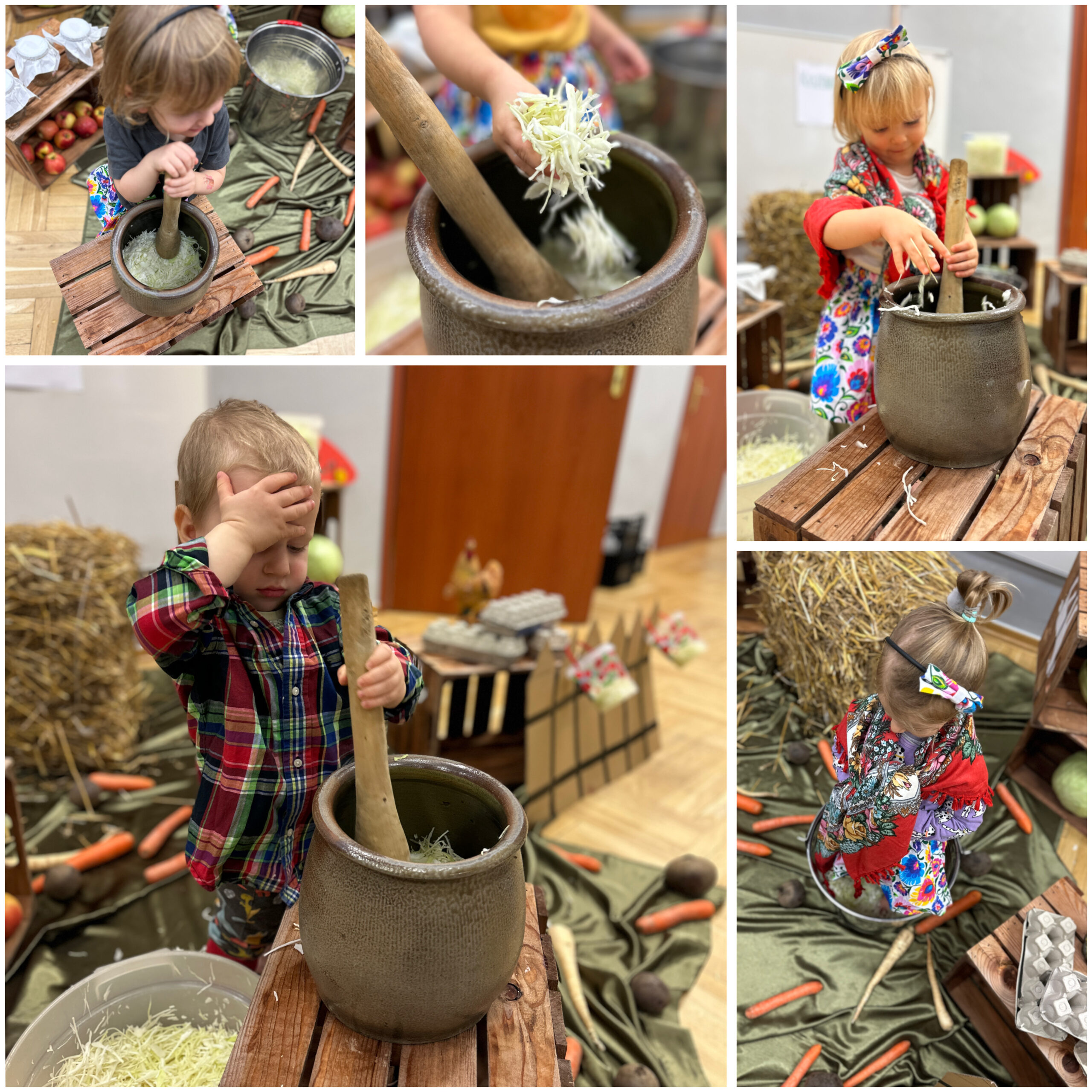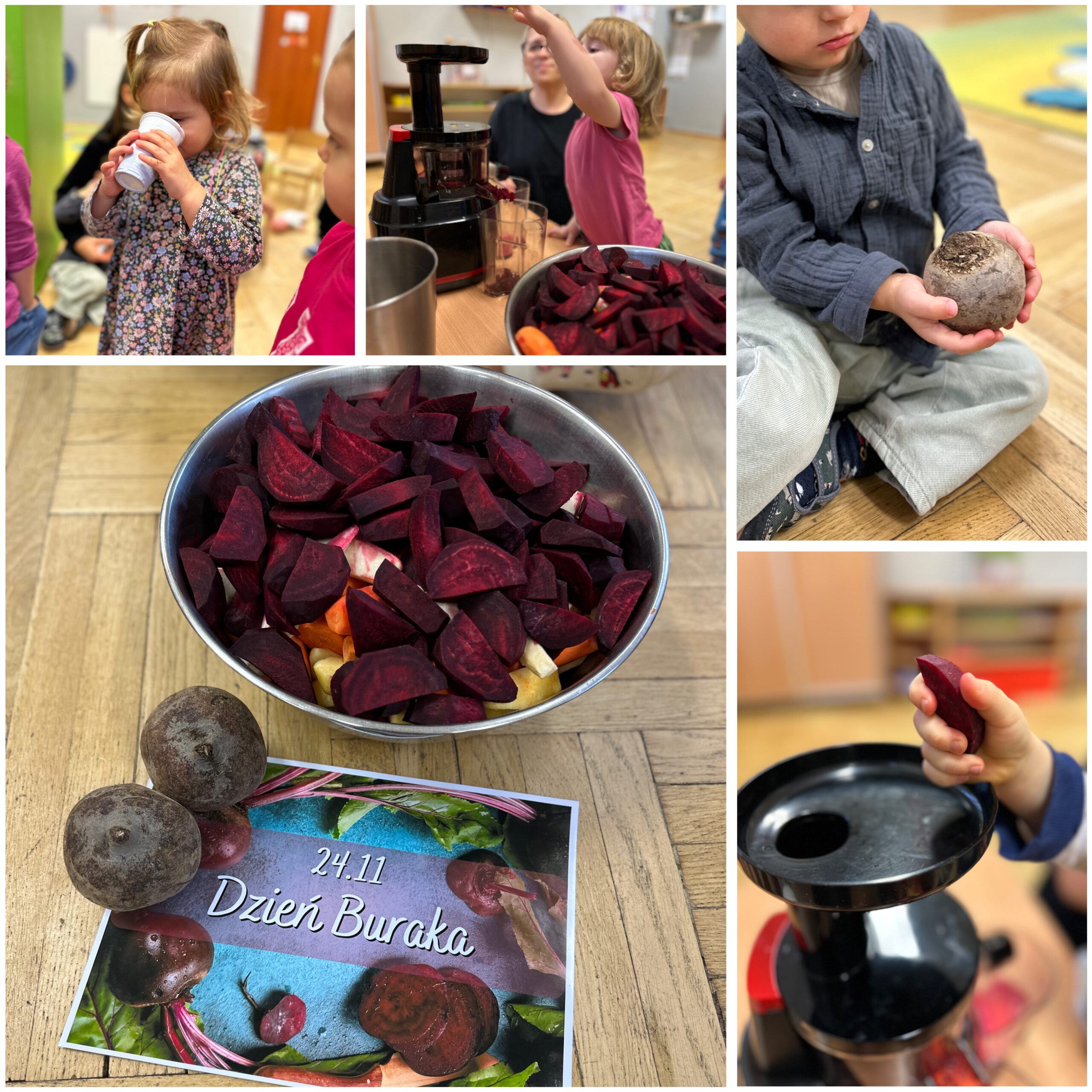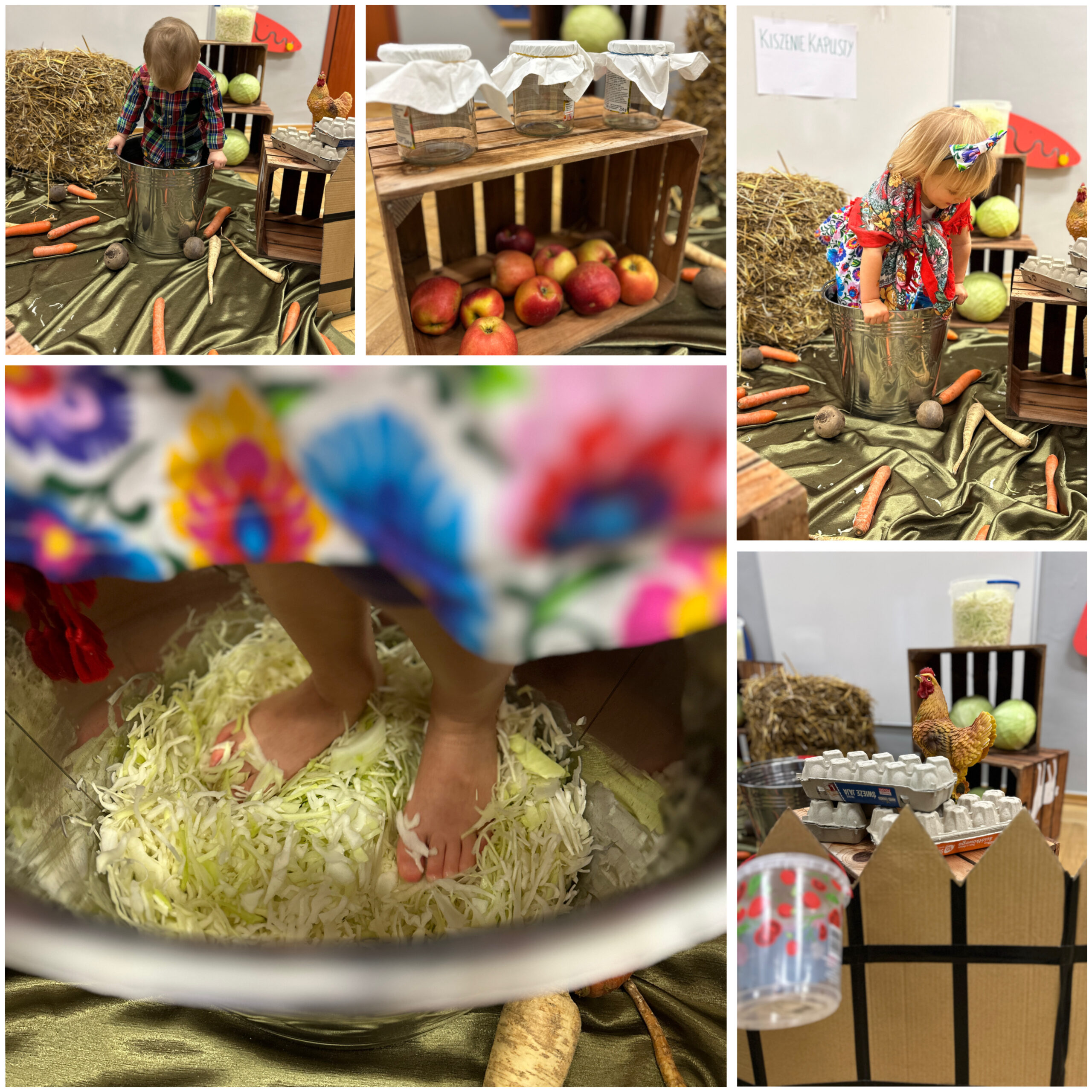 Pewnego dnia żłobek wypełnił zapach buraczanego czaru – to Dzień Buraka, podczas którego mali bohaterowie wyciskali rubinowe soki, zamieniając warzywo w napój pełen zdrowia. A gdy przyszedł czas na kiszenie kapusty, dzieci niczym mali czarodzieje ugniatały ją, mieszając radość, tradycję i ciekawość w jednym wielkim drewnianym naczyniu.