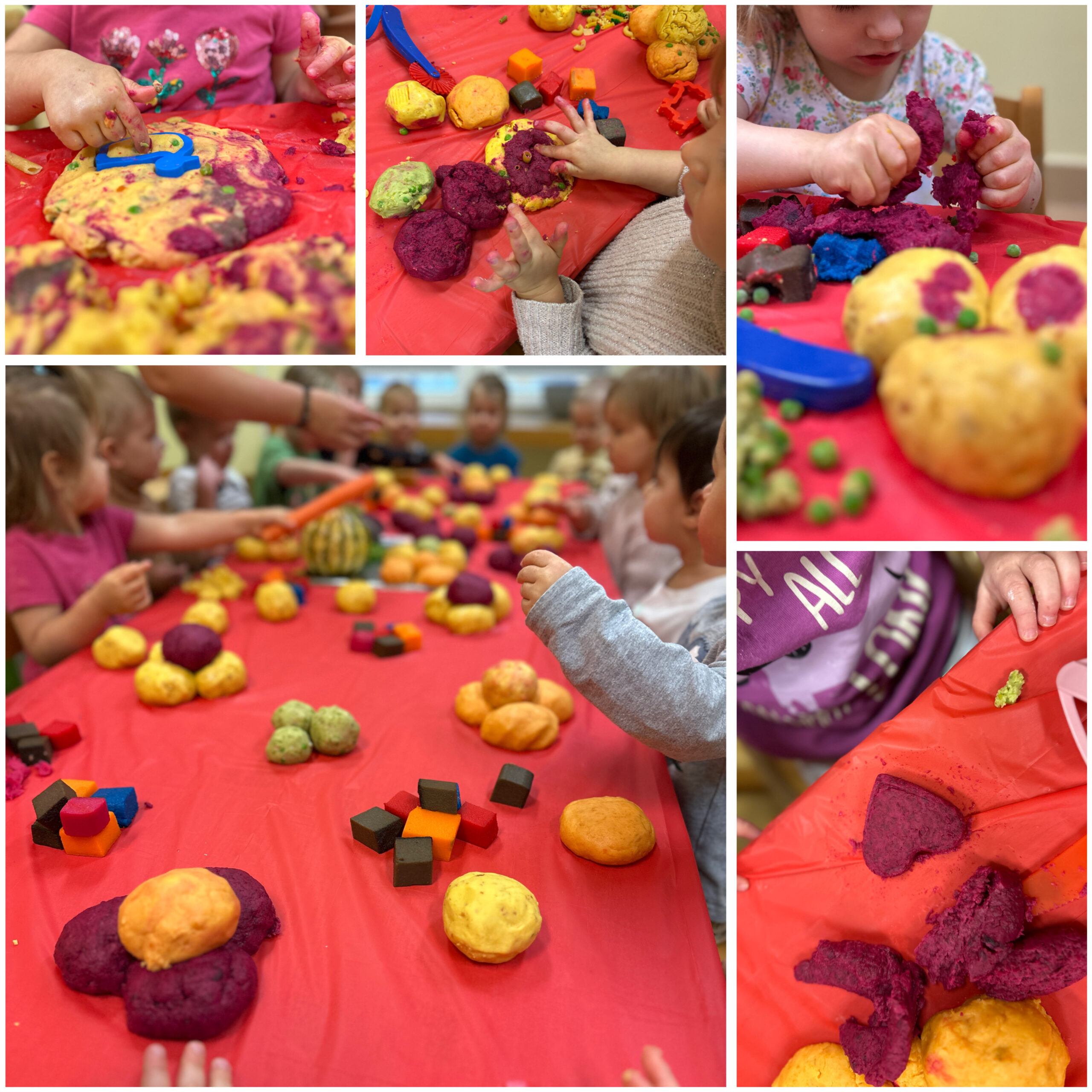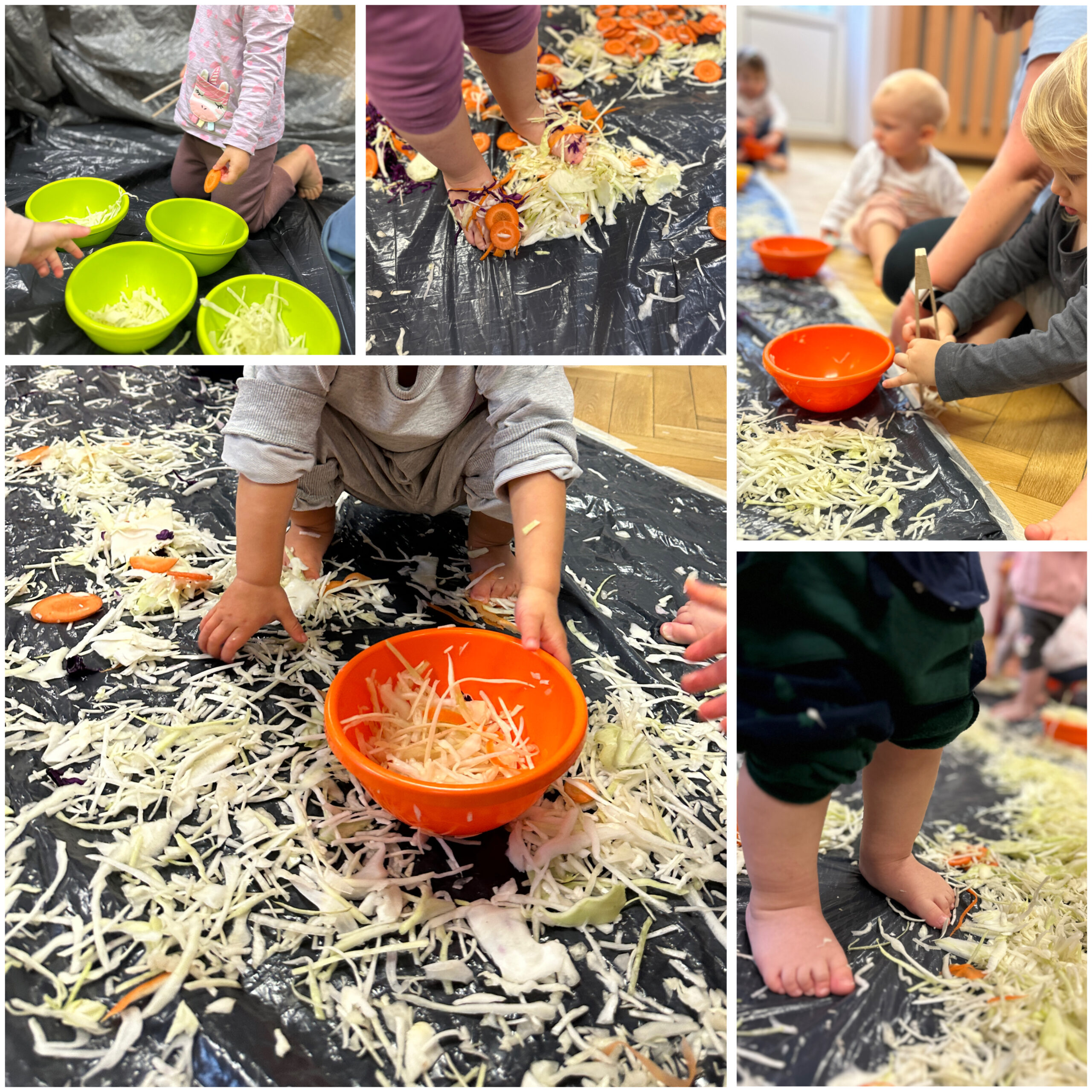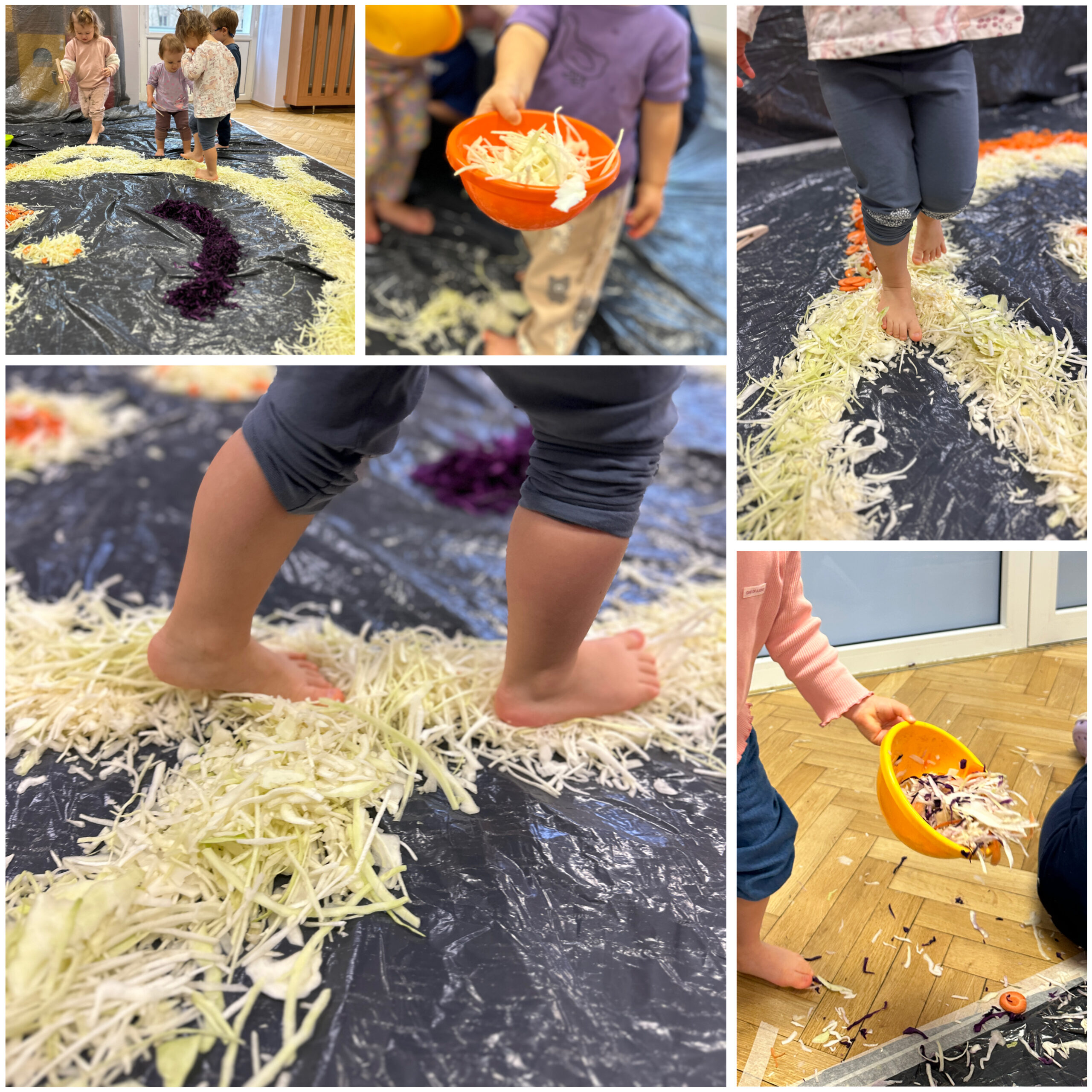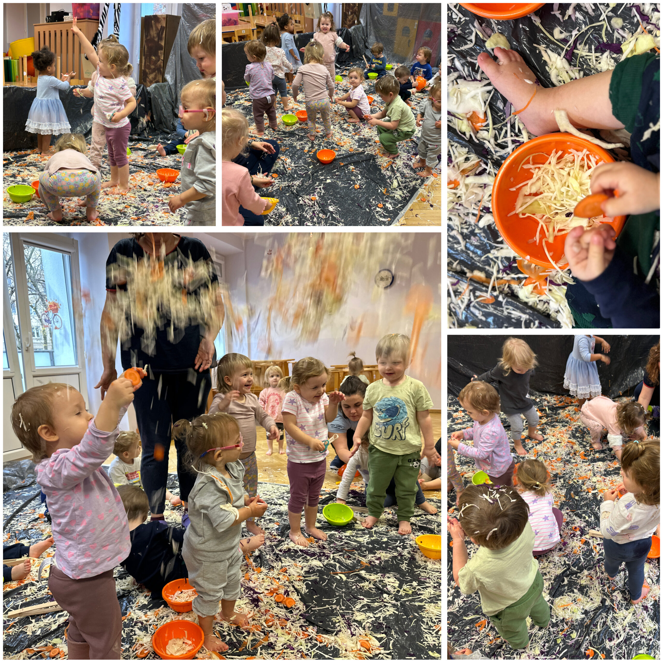 Pewnego dnia żłobek wypełnił zapach buraczanego czaru – to Dzień Buraka, podczas którego mali bohaterowie wyciskali rubinowe soki, zamieniając warzywo w napój pełen zdrowia. A gdy przyszedł czas na kiszenie kapusty, dzieci niczym mali czarodzieje ugniatały ją, mieszając radość, tradycję i ciekawość w jednym wielkim drewnianym naczyniu.