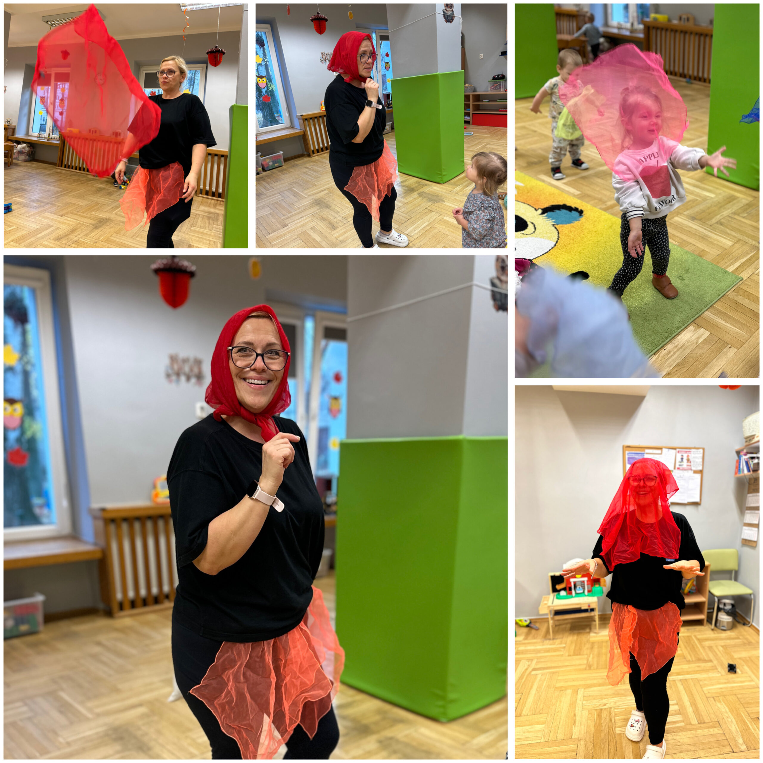 Listopad w naszym żłobku przypominał kolorowy rozdział z zaczarowanej księgi, w której każdy dzień szeptał nową przygodę. Na samym początku miesiąca nasze ciocie otworzyły przed dziećmi magiczne drzwi do świata opowieści, wystawiając teatrzyk „Na straganie”. Warzywni bohaterowie ożyli niczym w jesiennym ogrodzie, a maluszki patrzyły z zachwytem, jak dynie, cebule i pietruszki prowadzą swoje zabawne dyskusje.