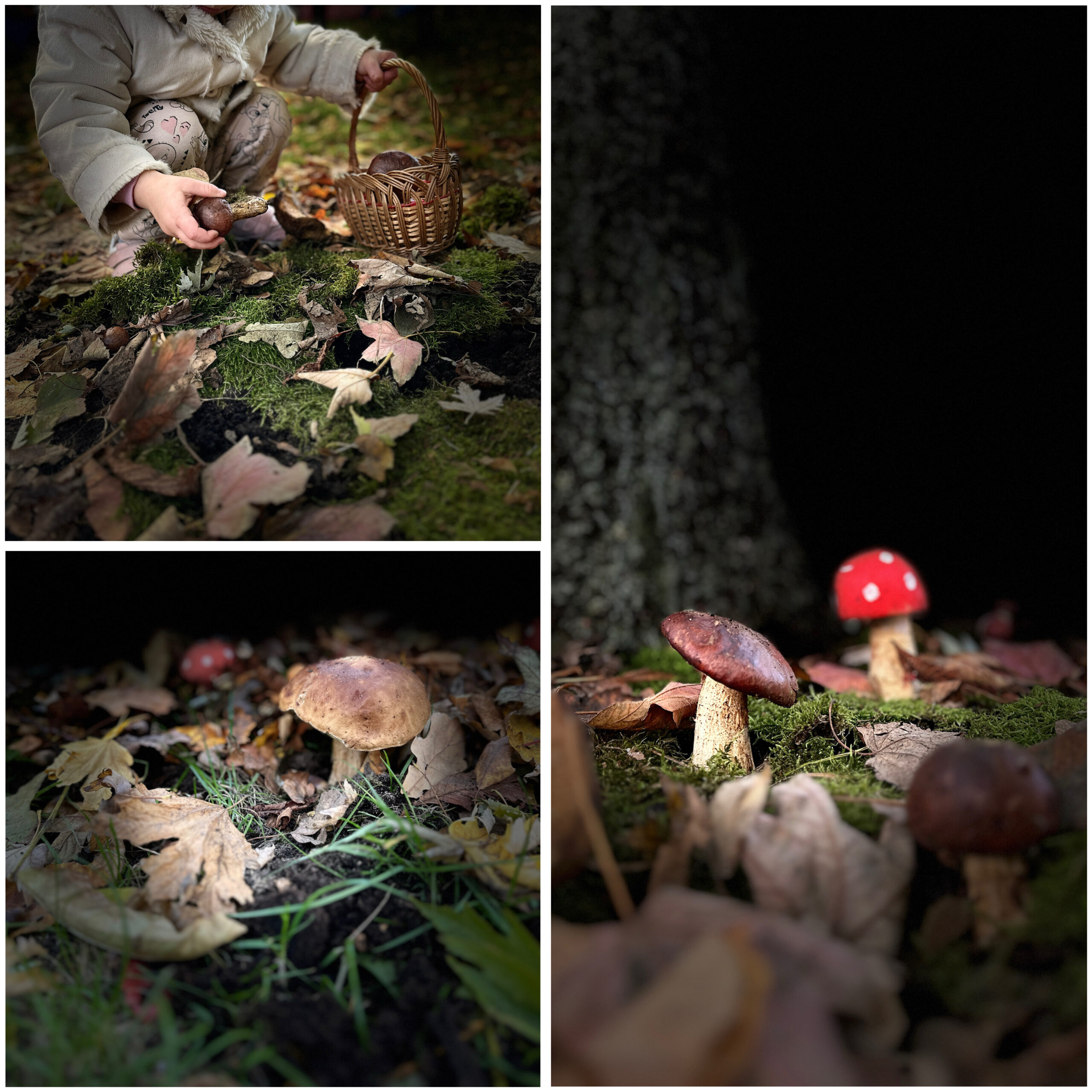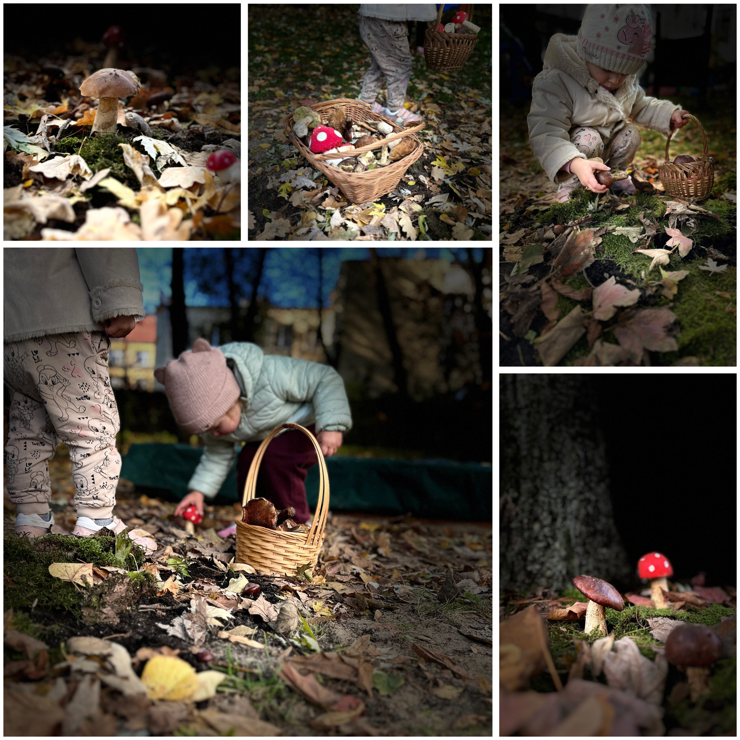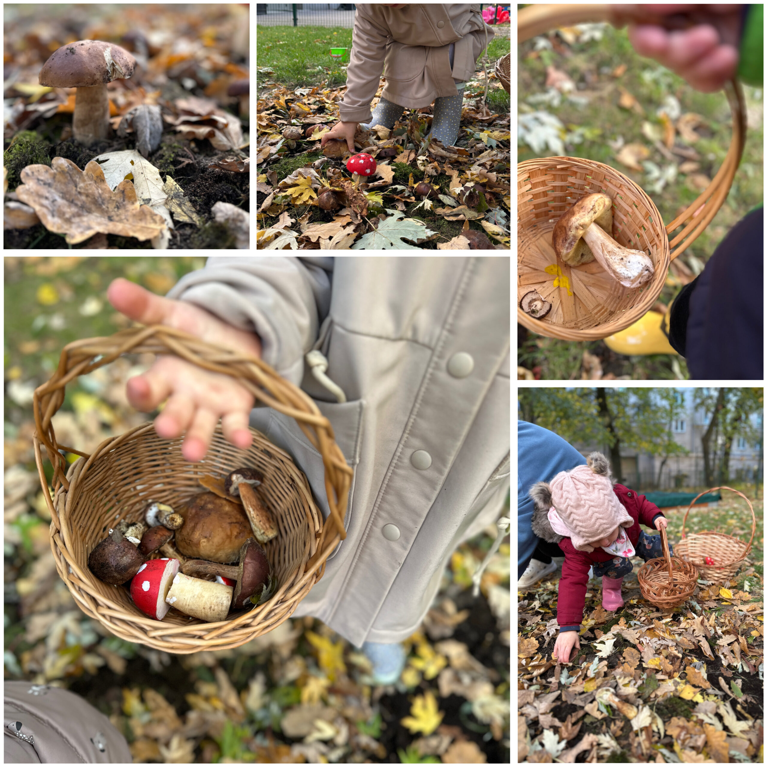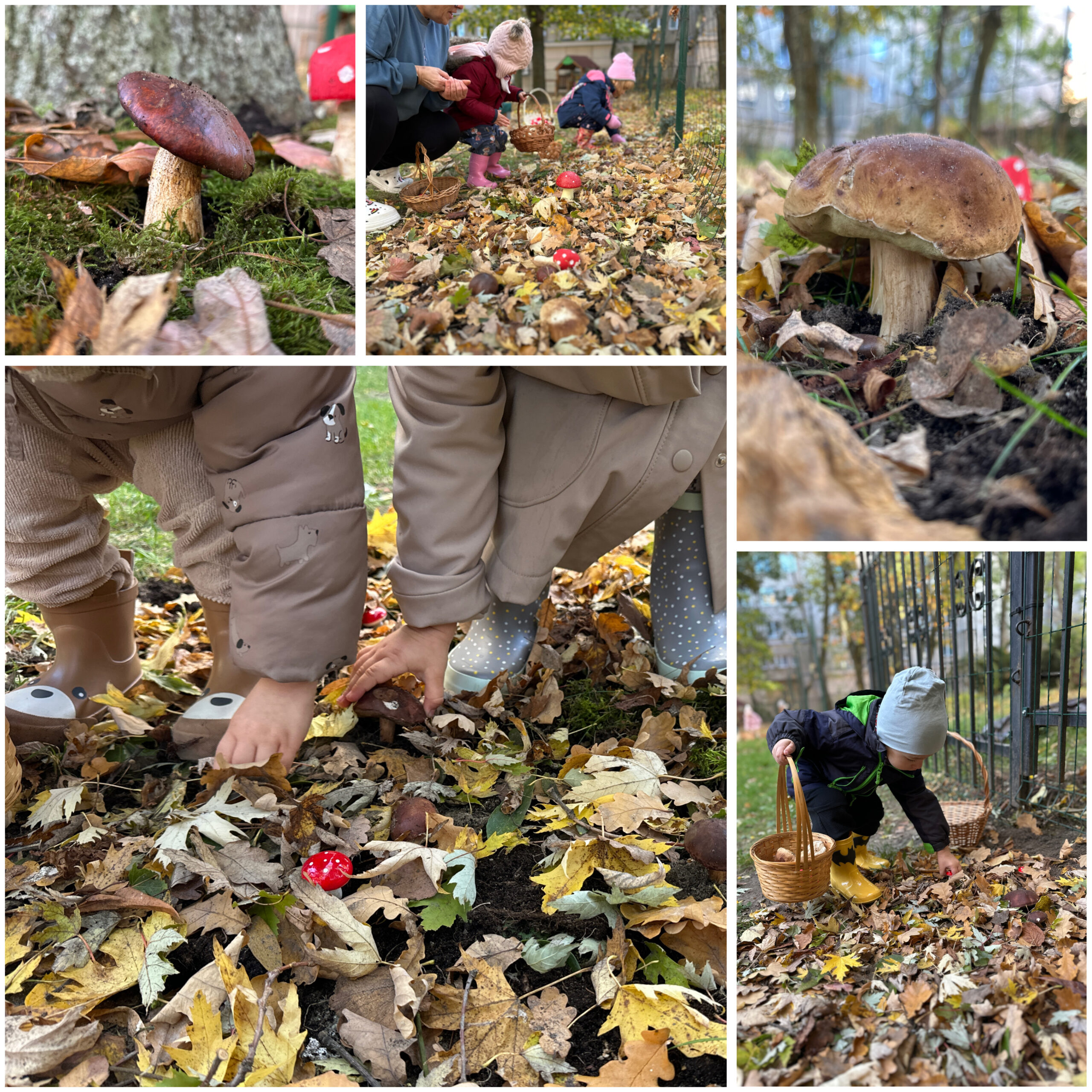 Jesień to także czas leśnych przygód, dlatego wybraliśmy się na nasze żłobkowe grzybobranie. Wspólnie szukaliśmy ukrytych na placu zabaw grzybków, jednocześnie ucząc się rozróżniać te jadalne od niejadalnych.