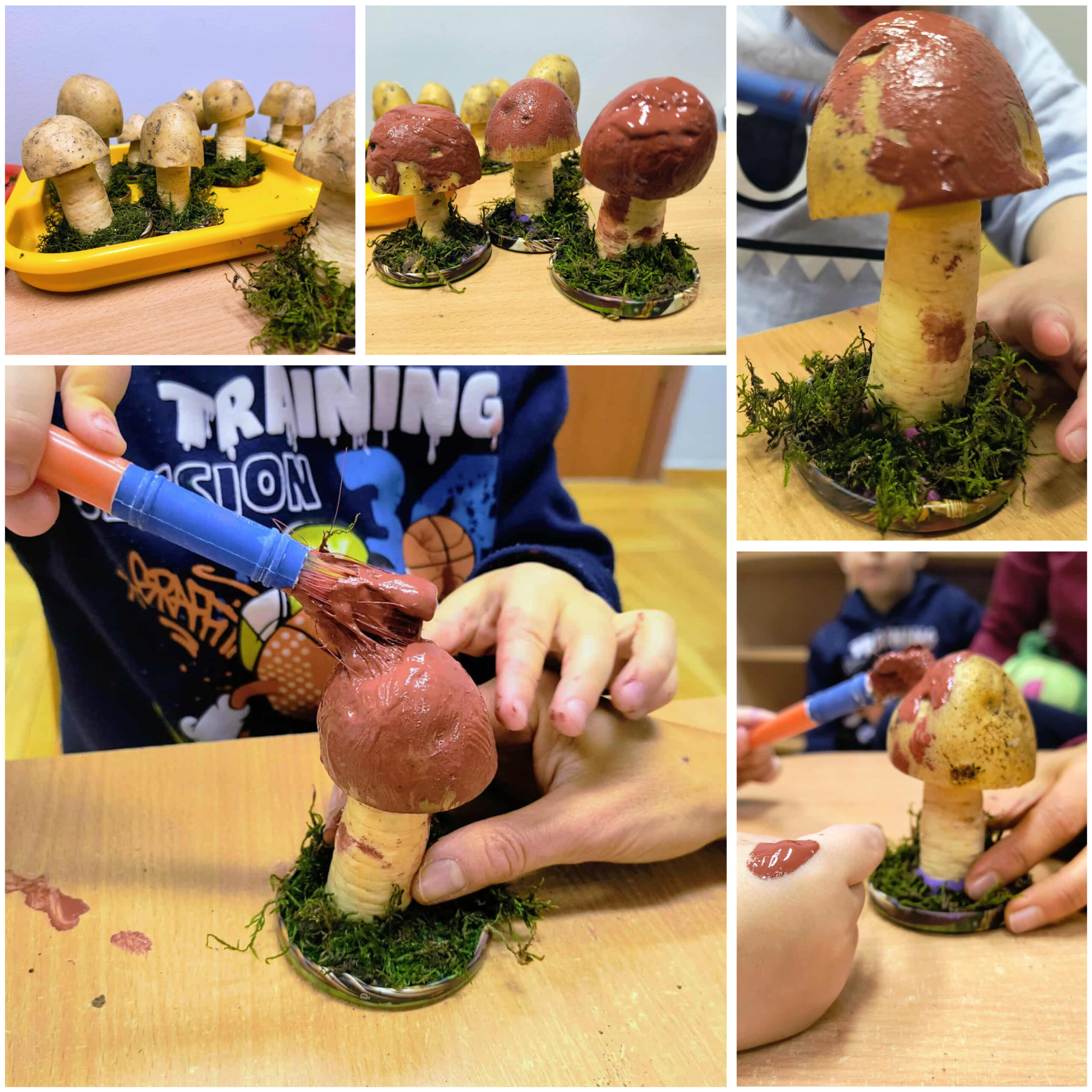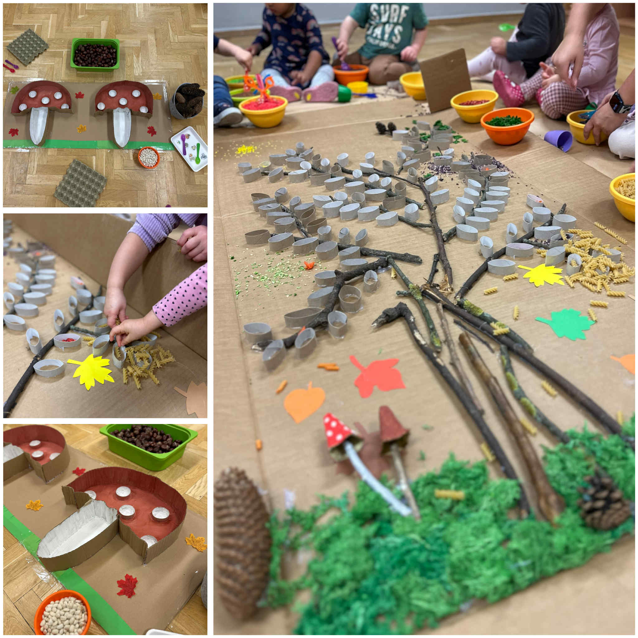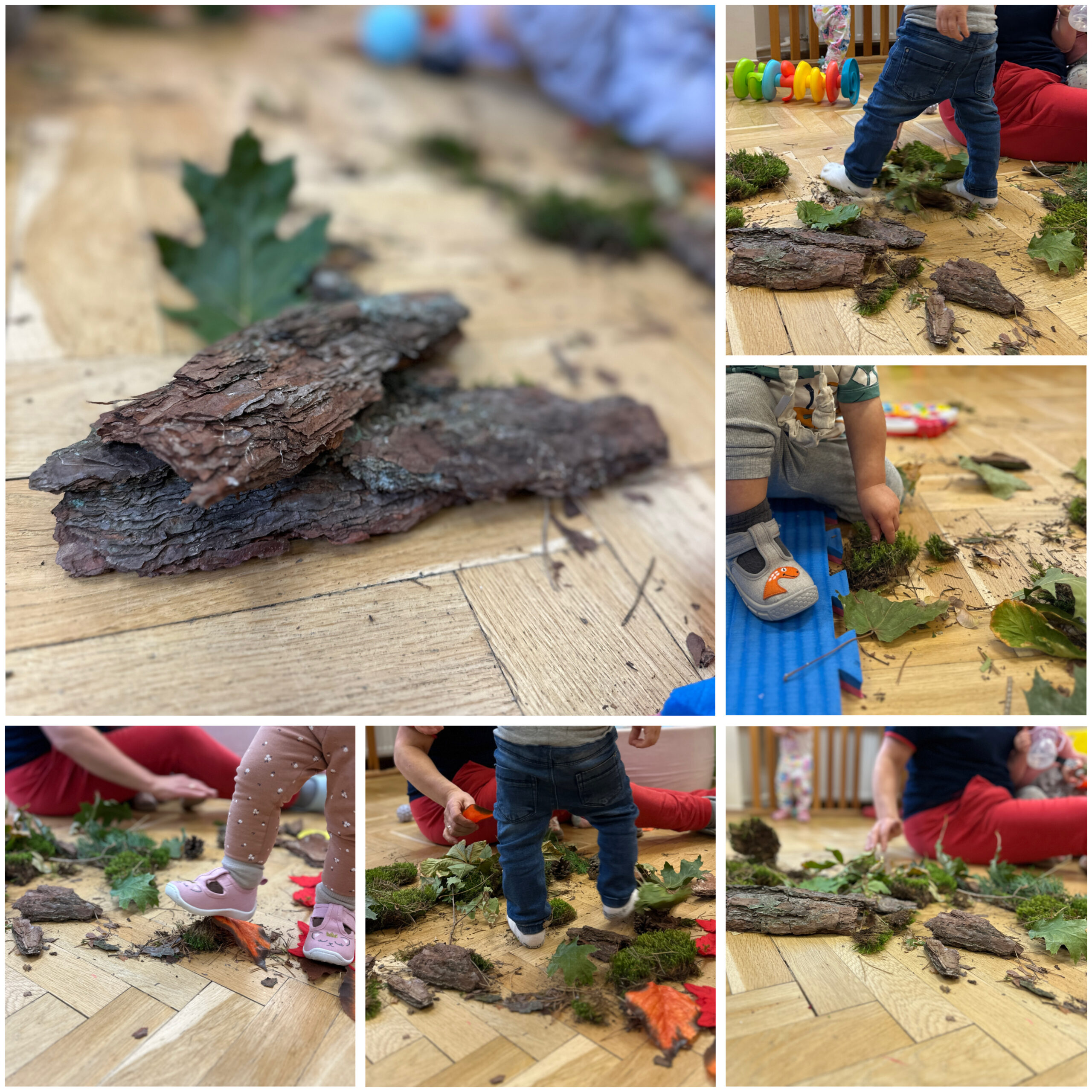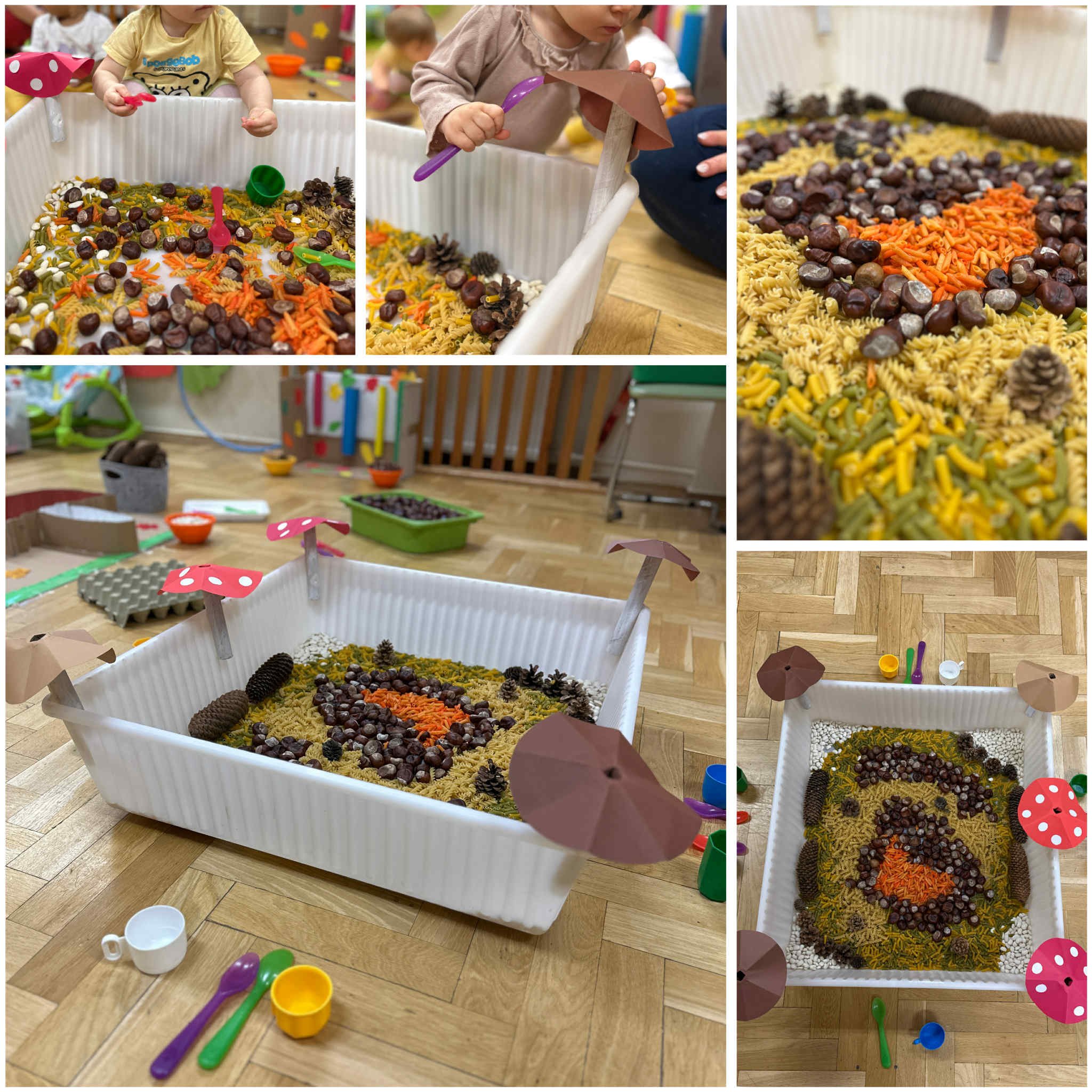 Jesień to także czas leśnych przygód, dlatego wybraliśmy się na nasze żłobkowe grzybobranie. Wspólnie szukaliśmy ukrytych na placu zabaw grzybków, jednocześnie ucząc się rozróżniać te jadalne od niejadalnych.