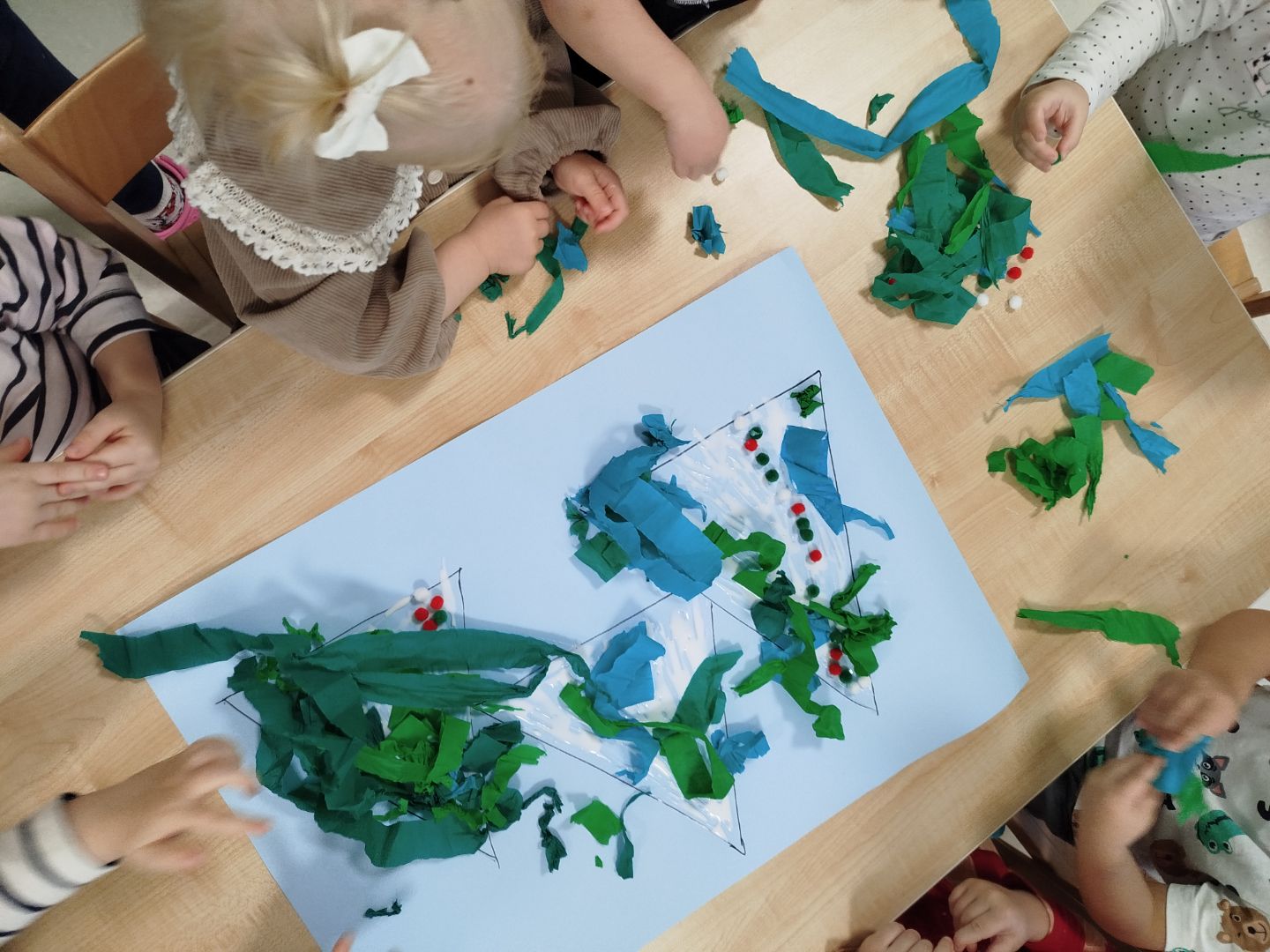 - Ozdabialiśmy drzewka samoprzylepnymi płatkami śniegu,