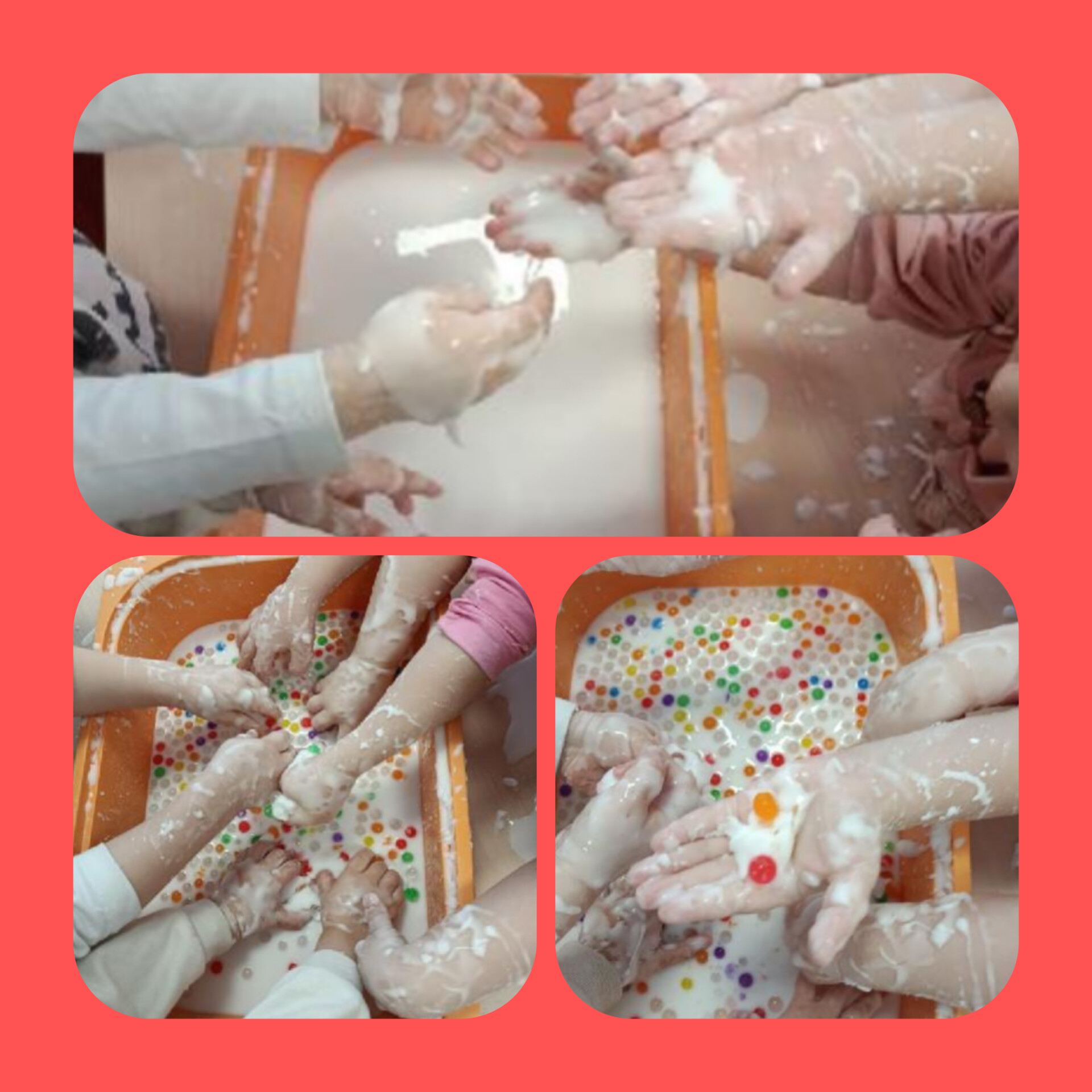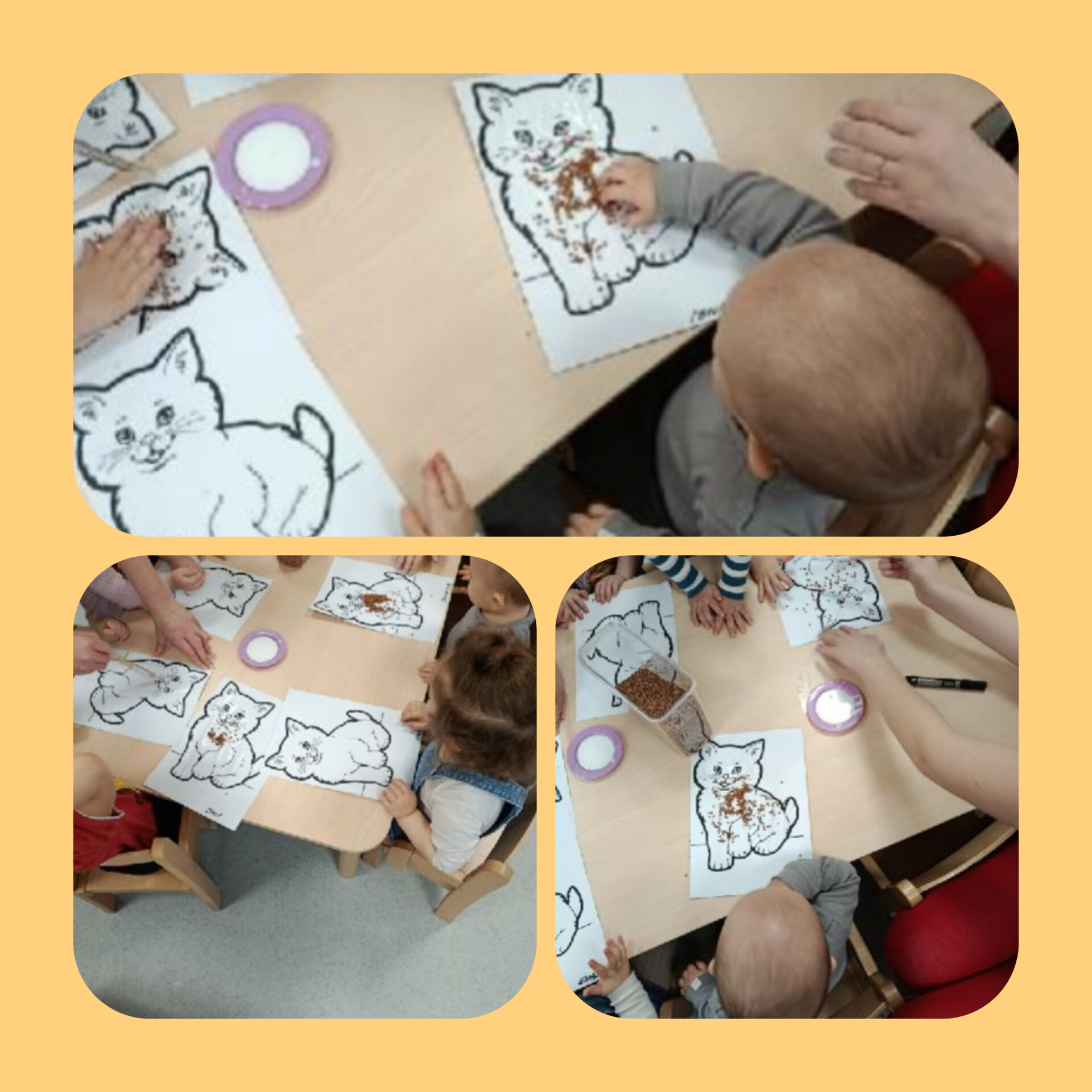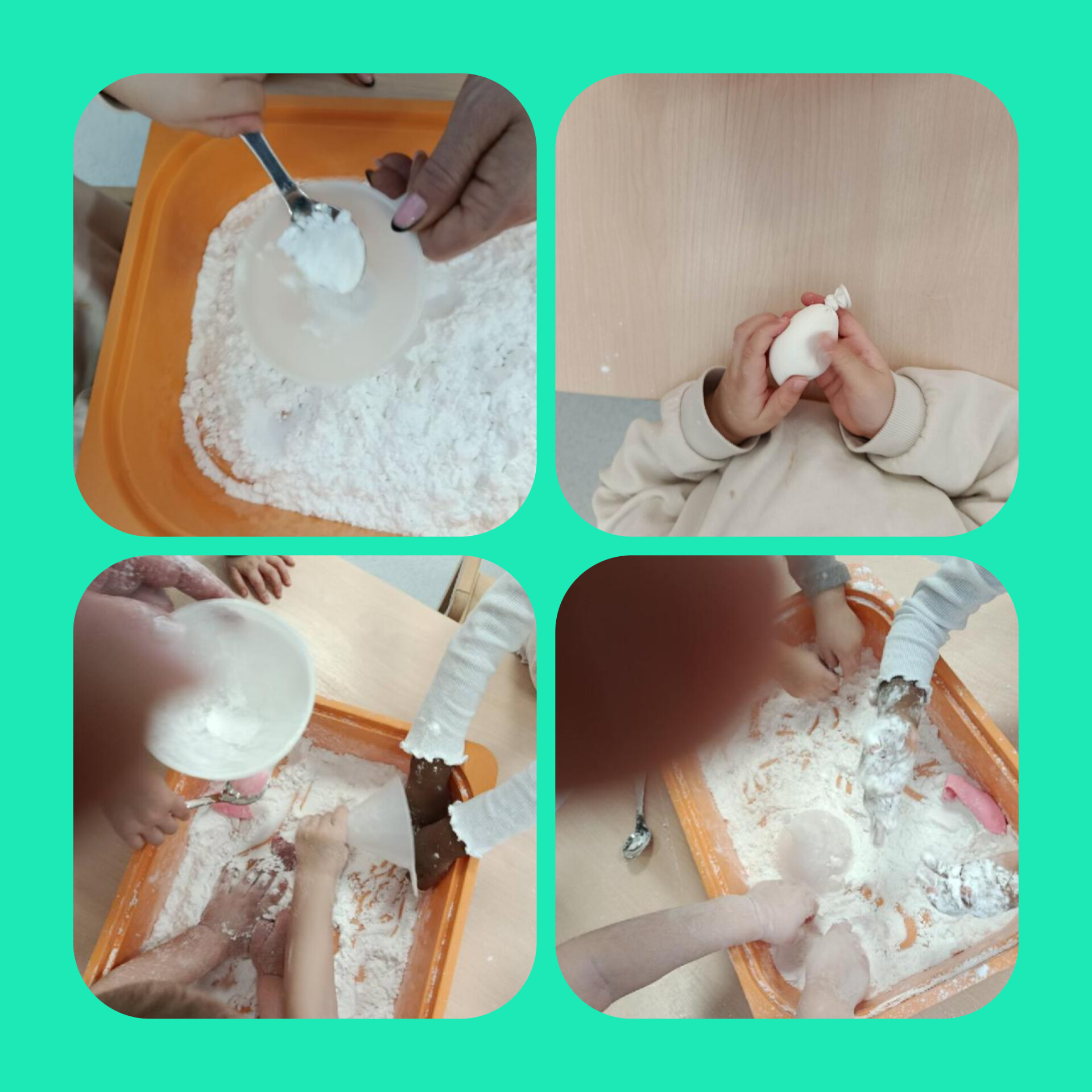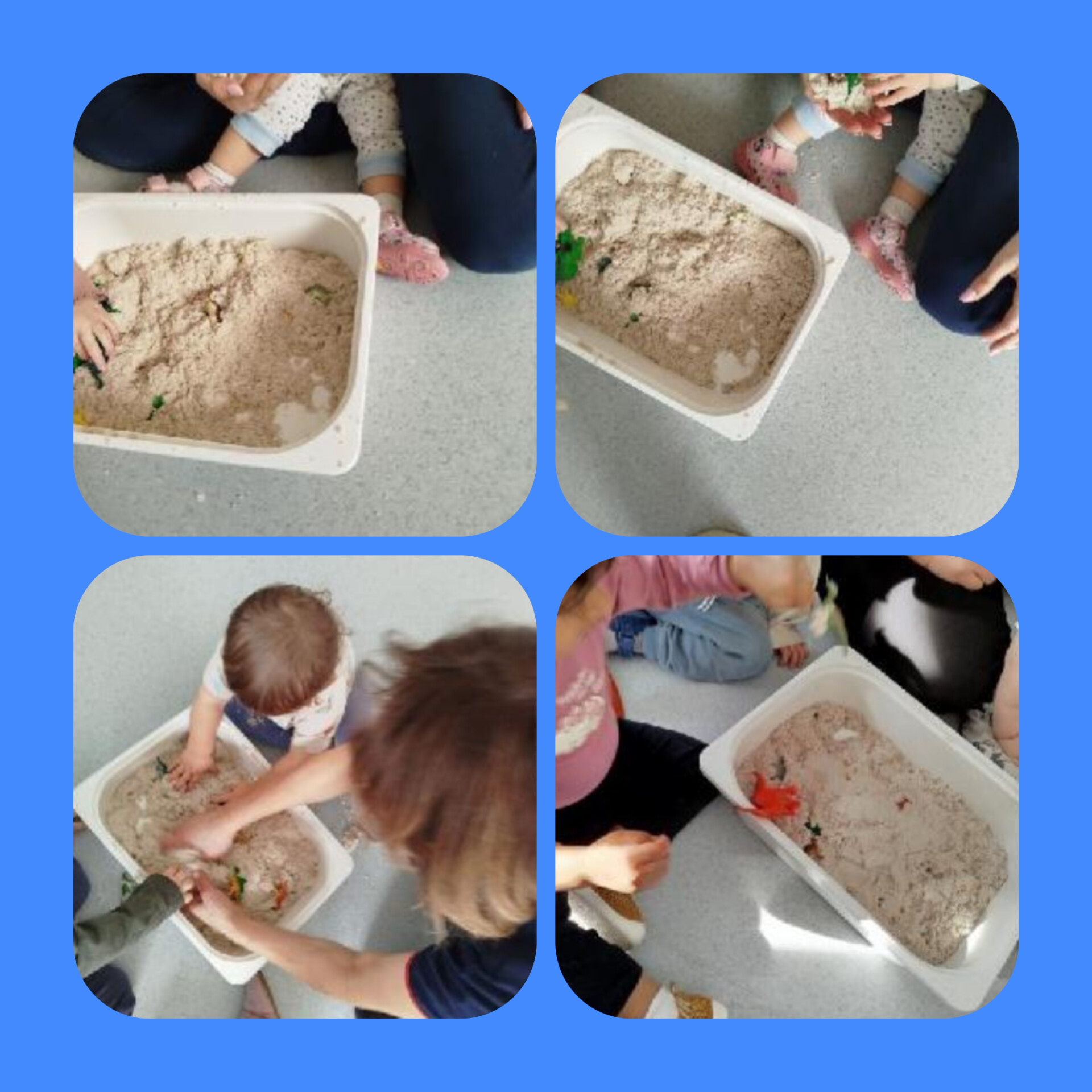 W minionym miesiącu dzieci uczestniczyły w wielu zajęciach sensorycznych, które wspierały ich rozwój poprzez poznawanie świata wszystkimi zmysłami. Maluszki z ogromnym zaangażowaniem bawiły się piaskiem kinetycznym, mąką oraz galaretką. Ugniatanie, przesypywanie, mieszanie i odkrywanie różnych faktur sprawiało im mnóstwo radości, a jednocześnie rozwijało motorykę małą i kreatywność.