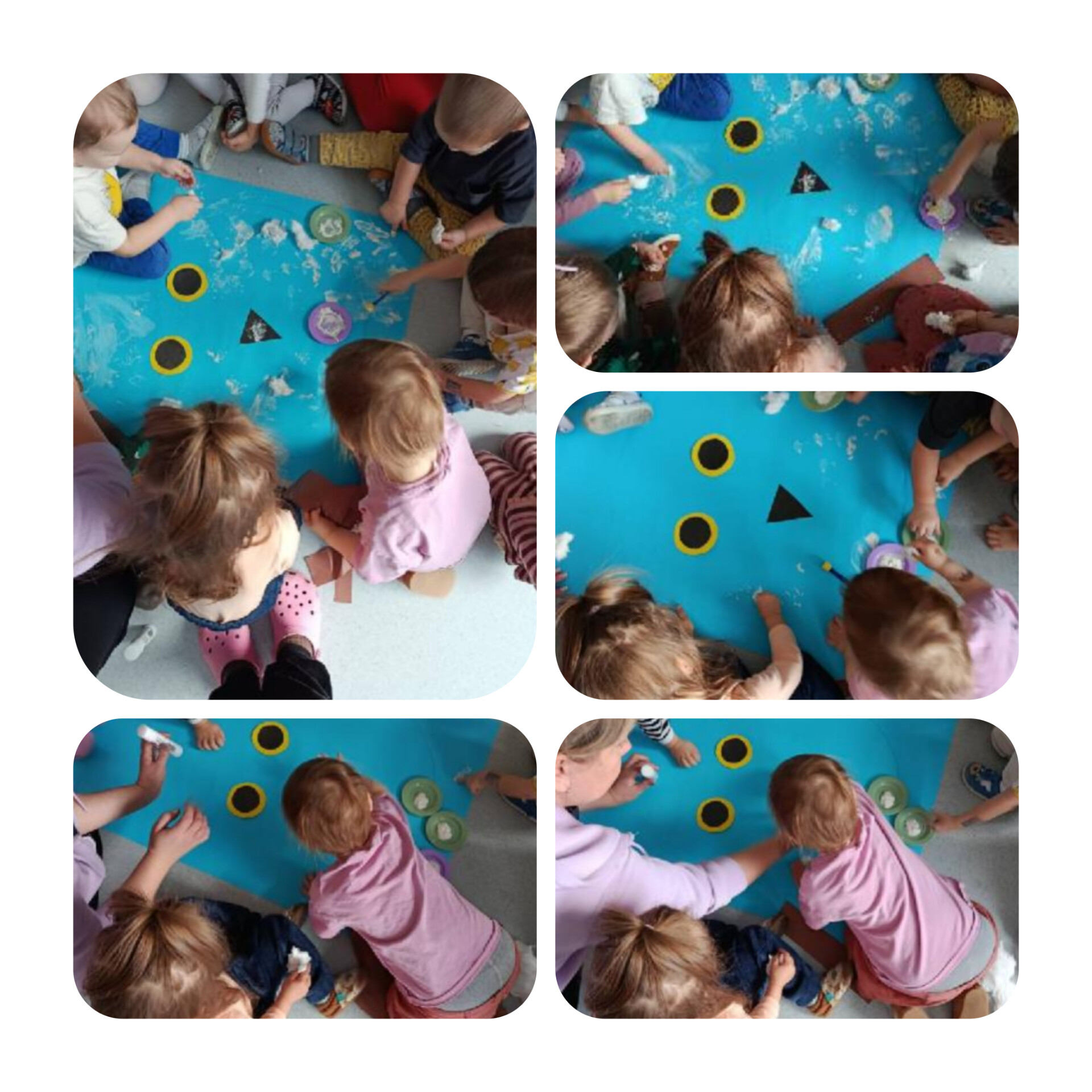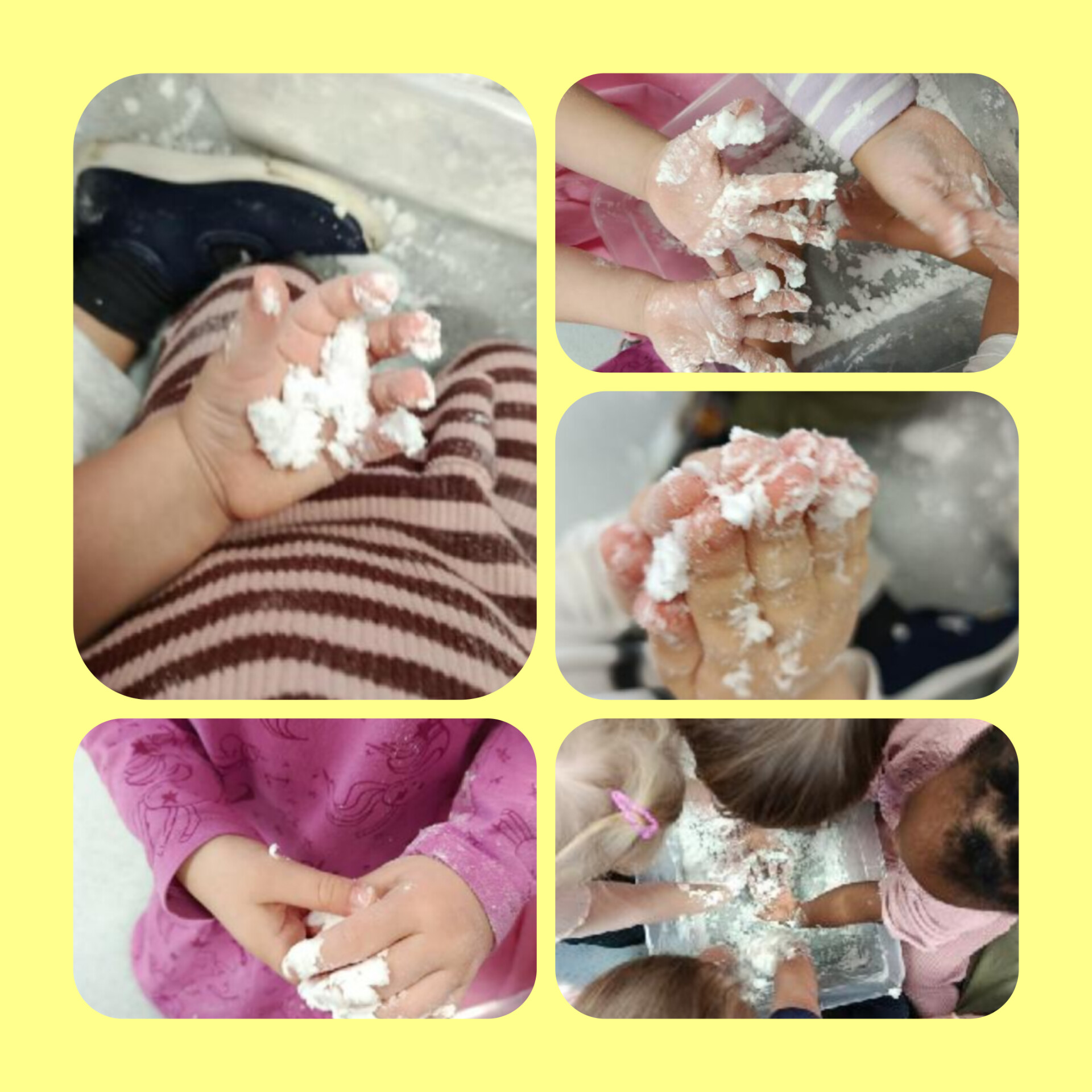 Nie zabrakło również zajęć sensorycznych. Podczas tworzenia „sztucznego śniegu” dzieci mogły doświadczać różnych faktur i temperatur, ćwicząc przy tym motorykę małą oraz pobudzając swoje zmysły.