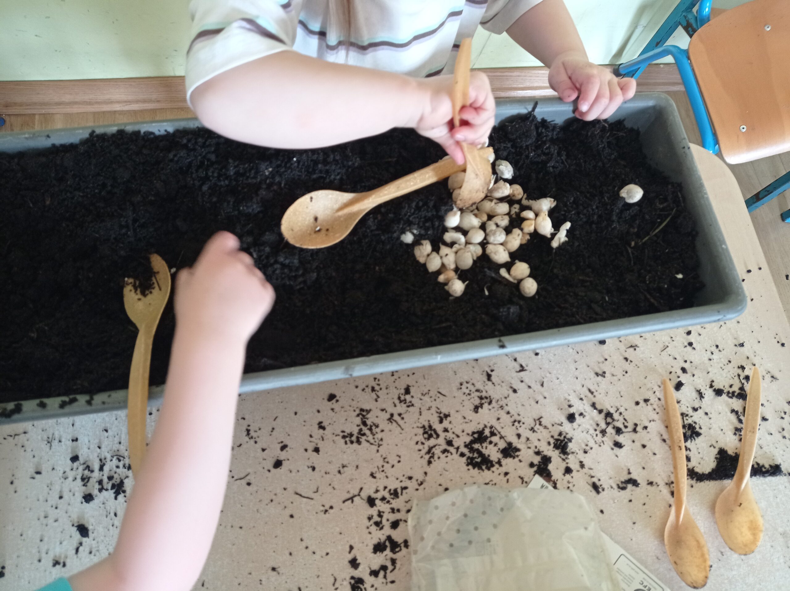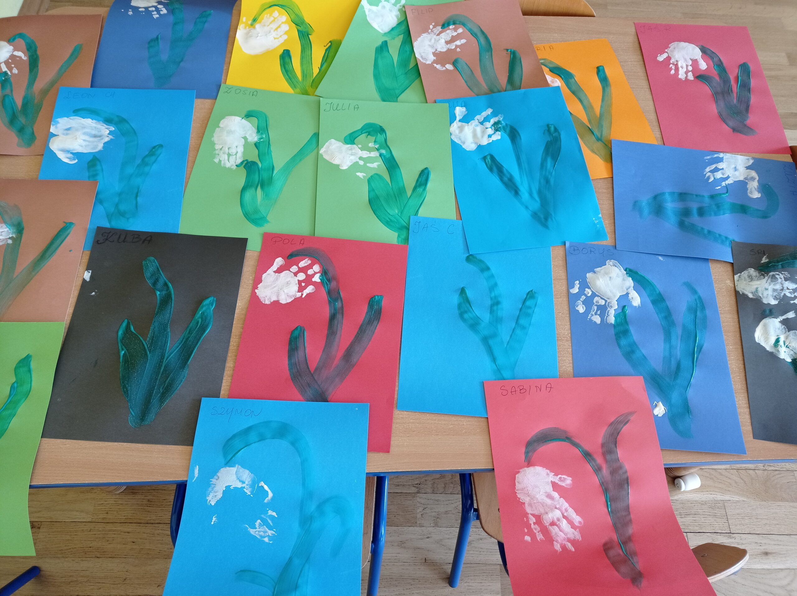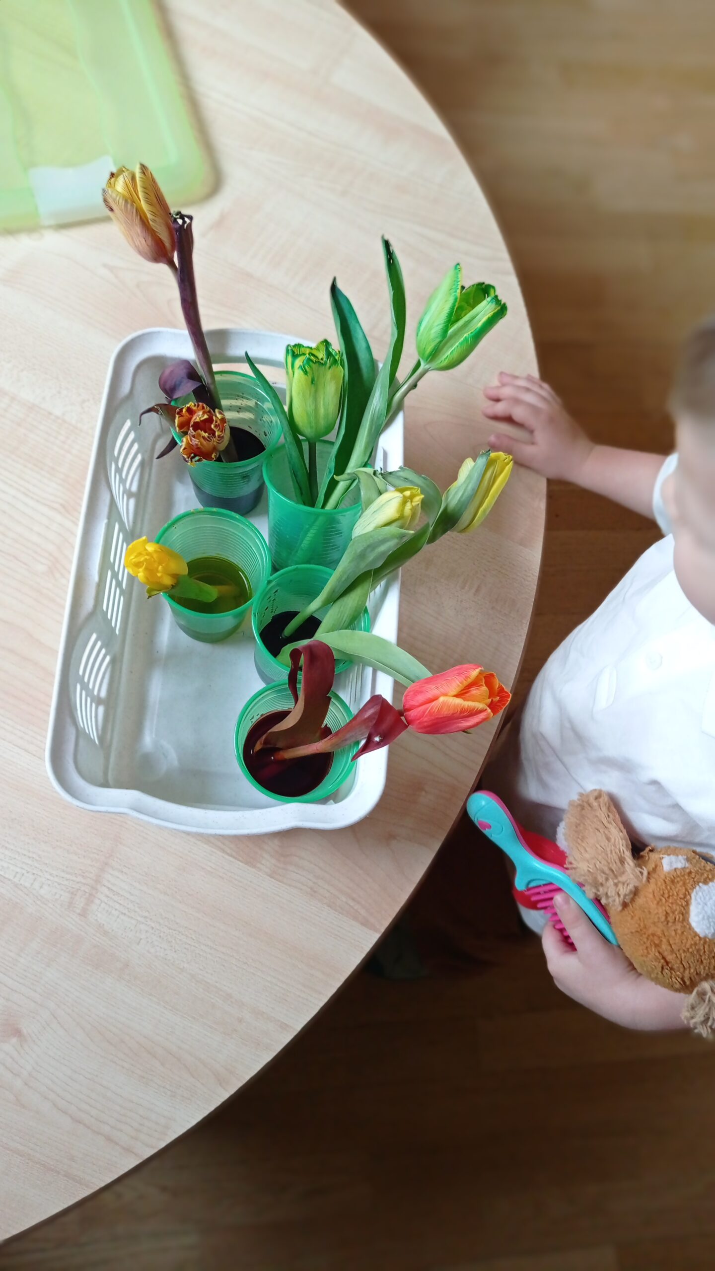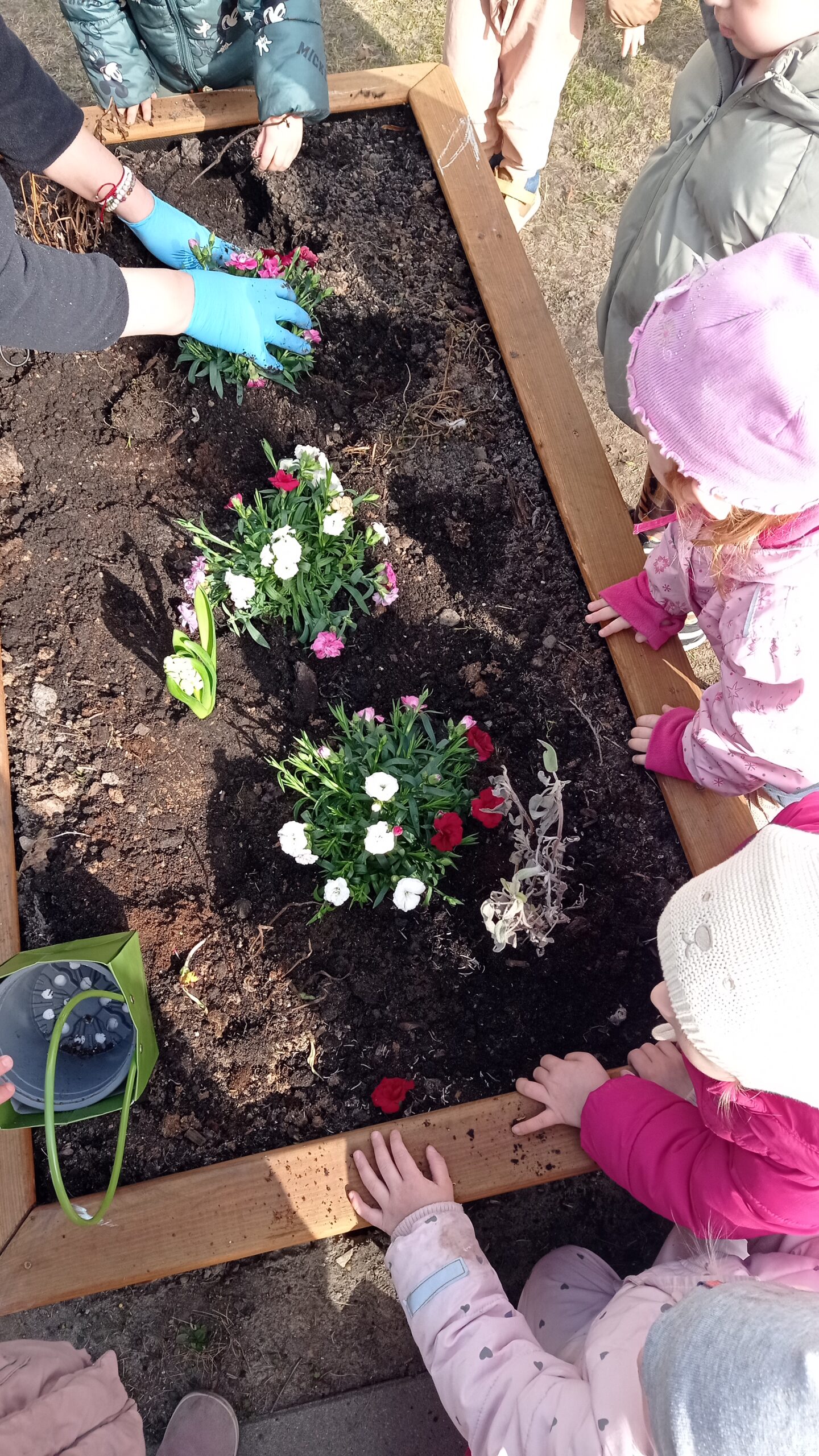 W tym miesiącu maluchy poznawały świat przyrody poprzez barwienie kwiatów na różne kolory za pomocą barwników dodawanych do wody oraz sadzenie kwiatów na klombach w ogródku.