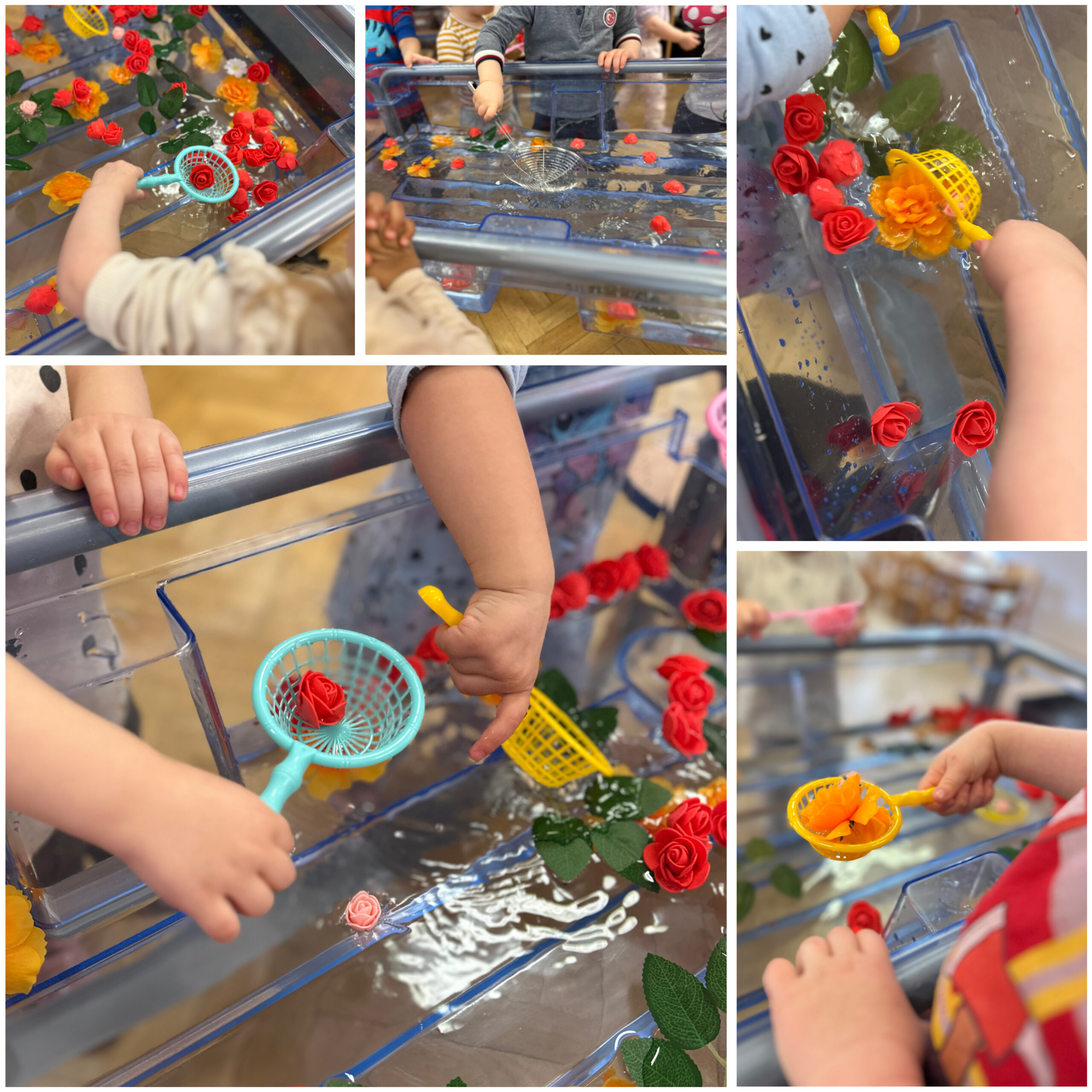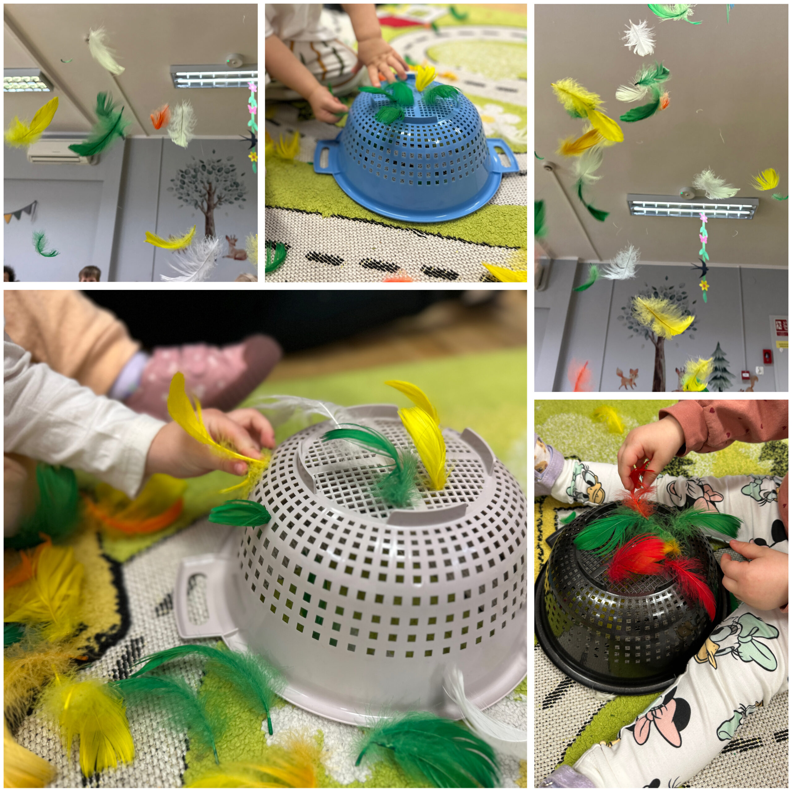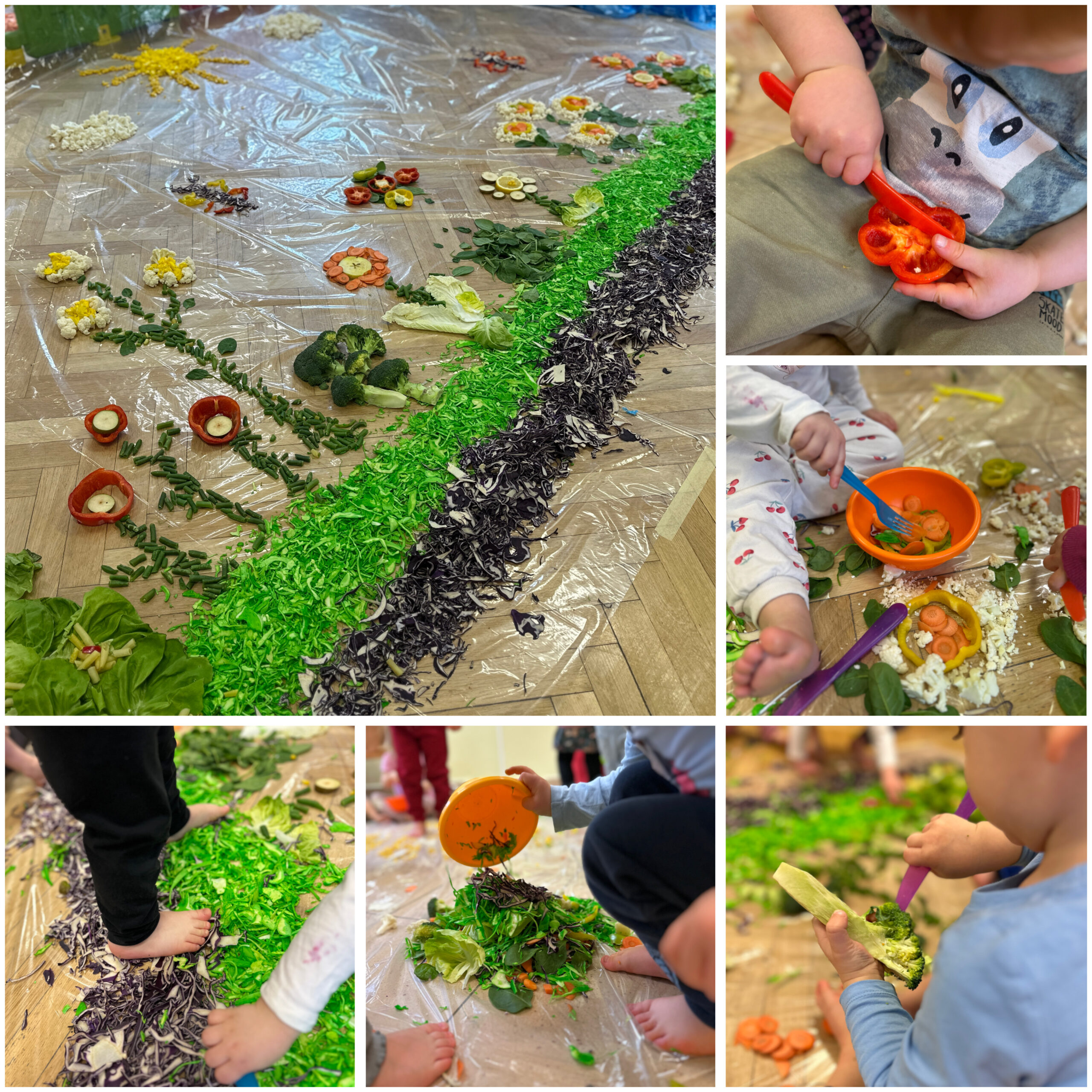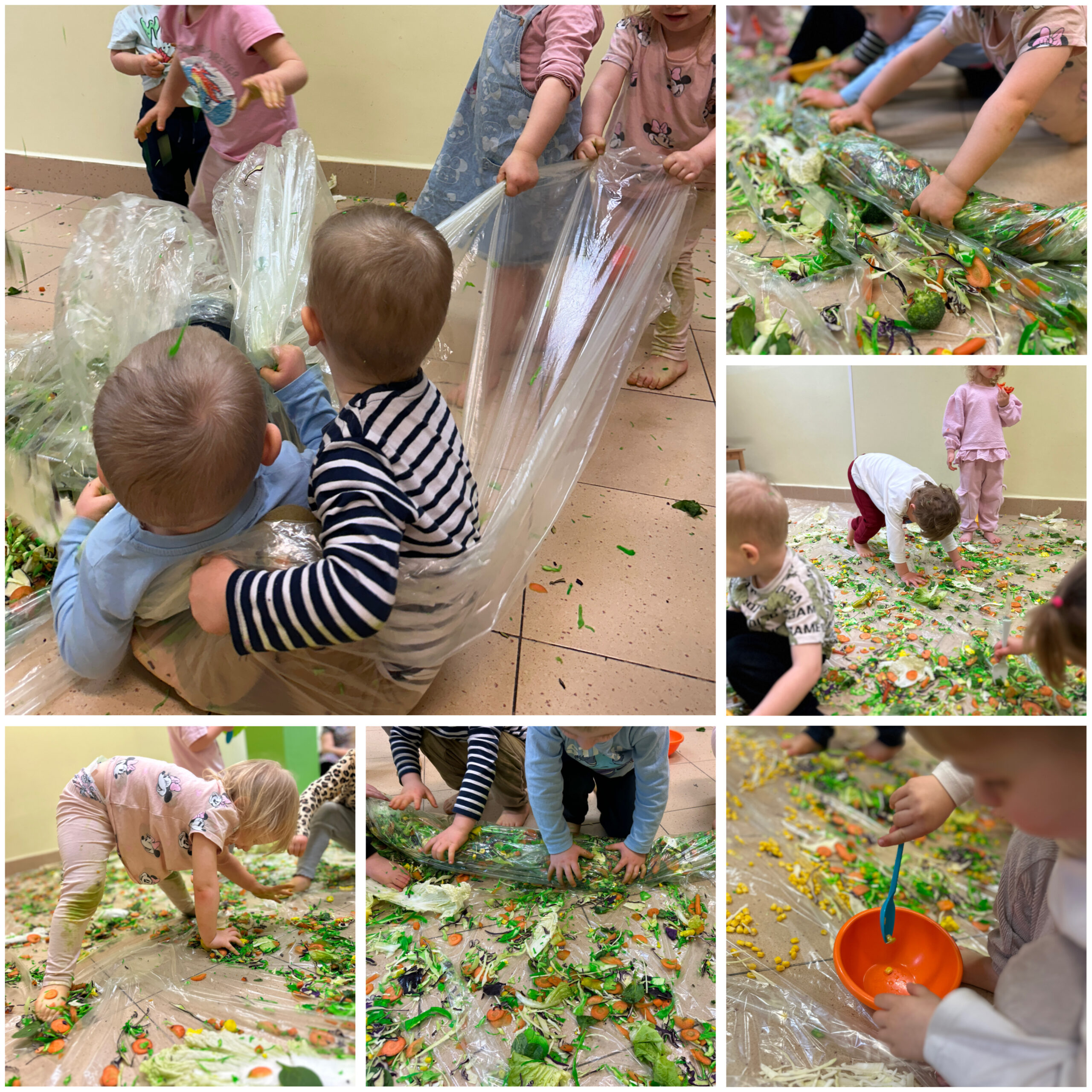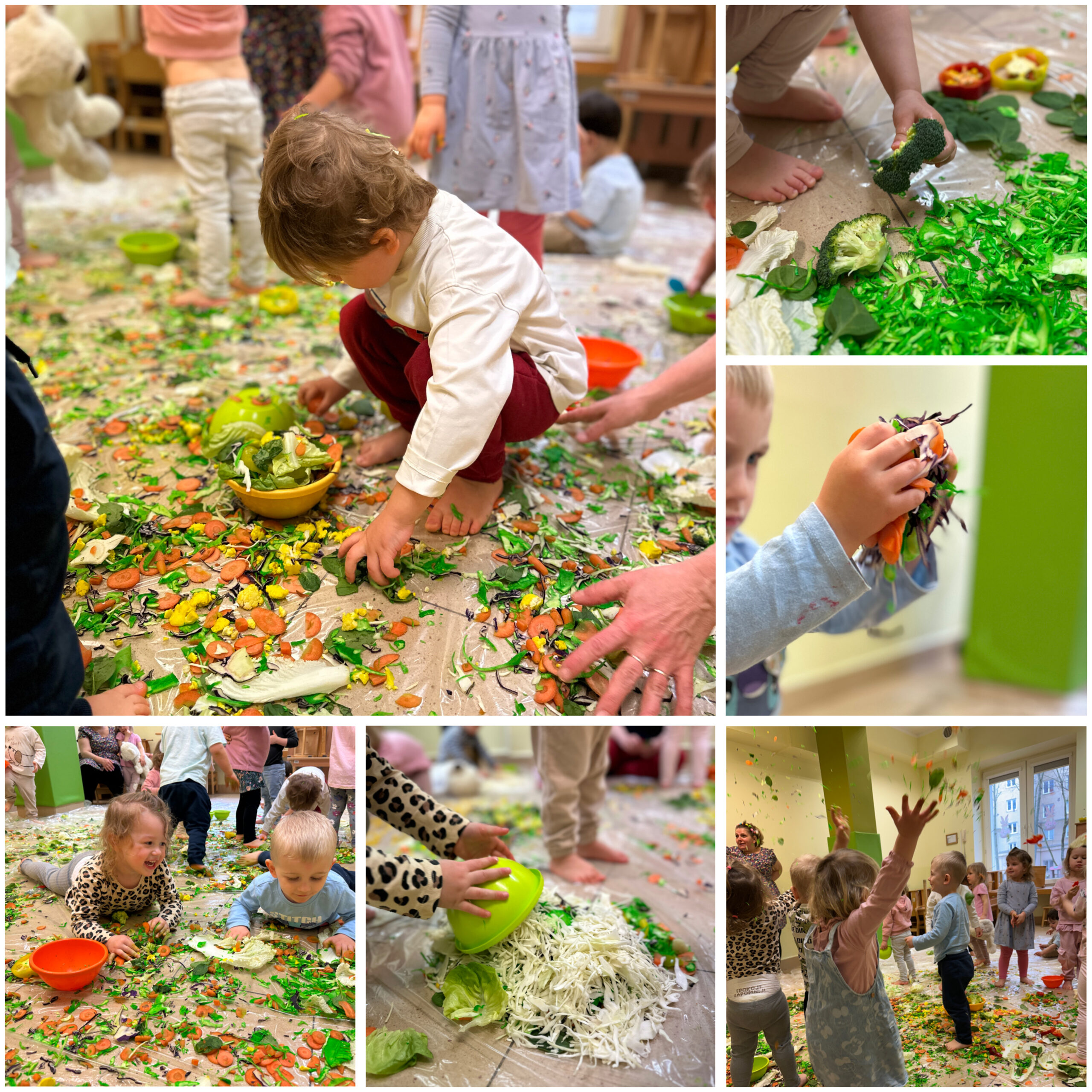 Podczas zajęć sensorycznych „Wiosenna łąka” dzieci poznawały świat wszystkimi zmysłami, dotykając różnorodnych warzyw o różnych strukturach, obserwując ich kolory i ucząc się rozróżniać kształty oraz faktury. To doświadczenie rozwijało wrażliwość sensoryczną oraz wyobraźnię dzieci.