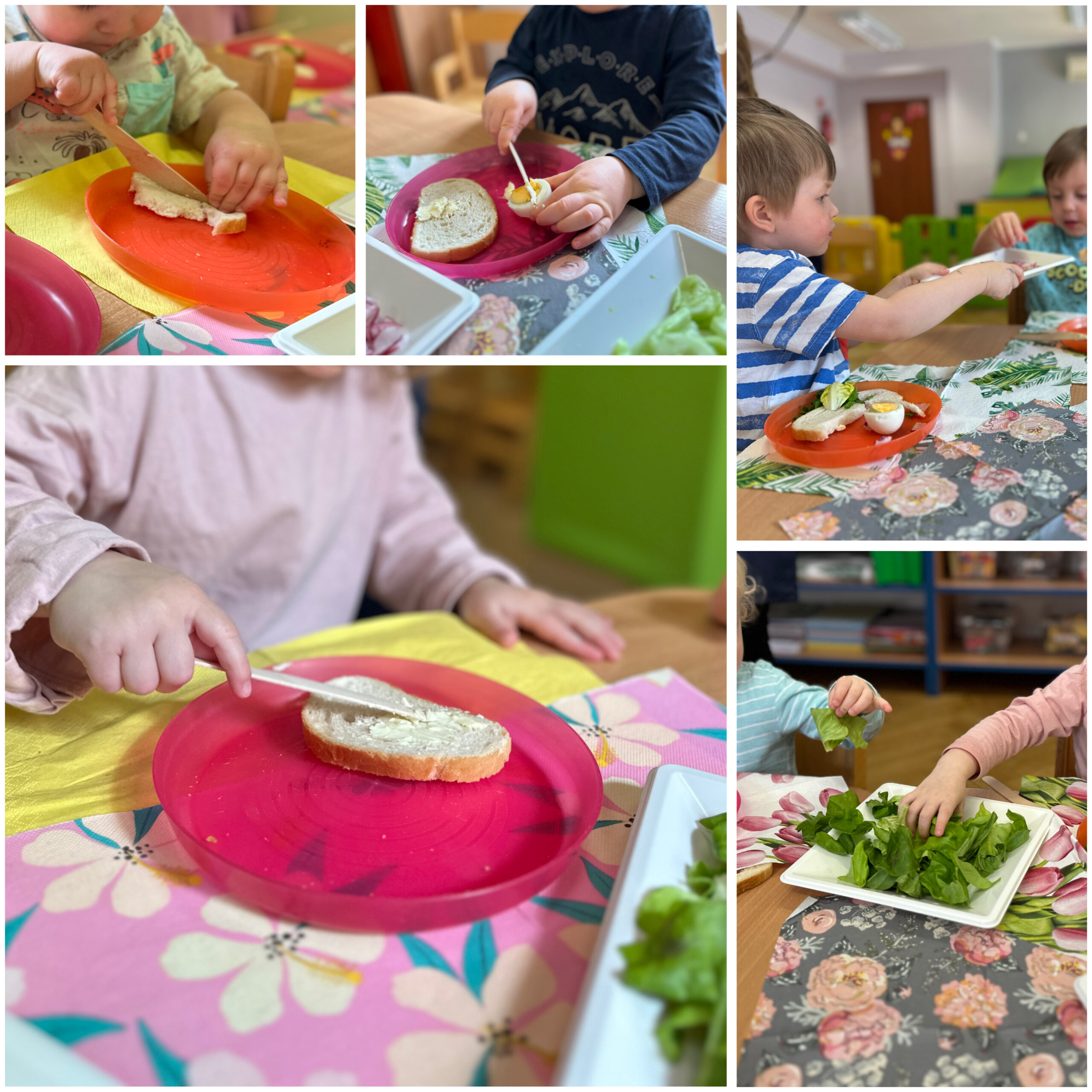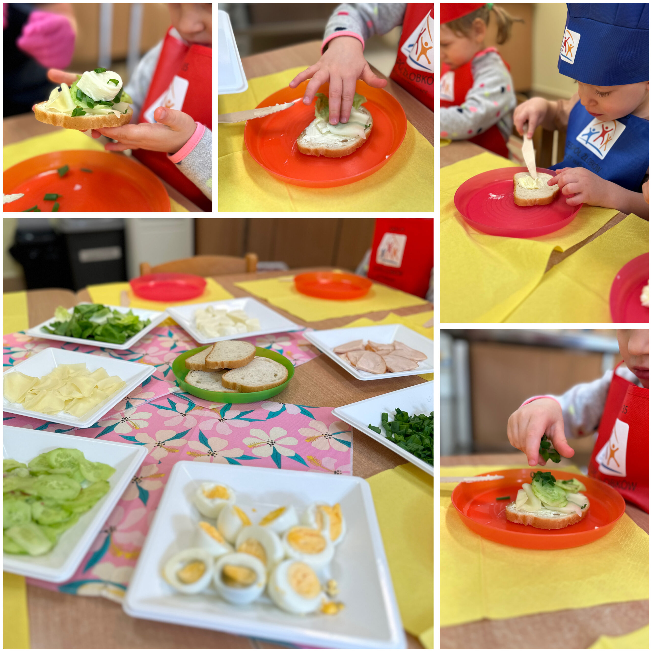 Również na koniec miesiąca w naszym żłobkowym „Kuchcikowie” dzieci przygotowały wiosenne kanapki. Samodzielnie komponowały kolorowe kompozycje z warzyw, serów i innych dodatków. Degustacja była pełna śmiechu i dumy z własnych umiejętności, a maluszki uczyły się zdrowego odżywiania oraz współpracy przy wspólnym przygotowywaniu posiłków.