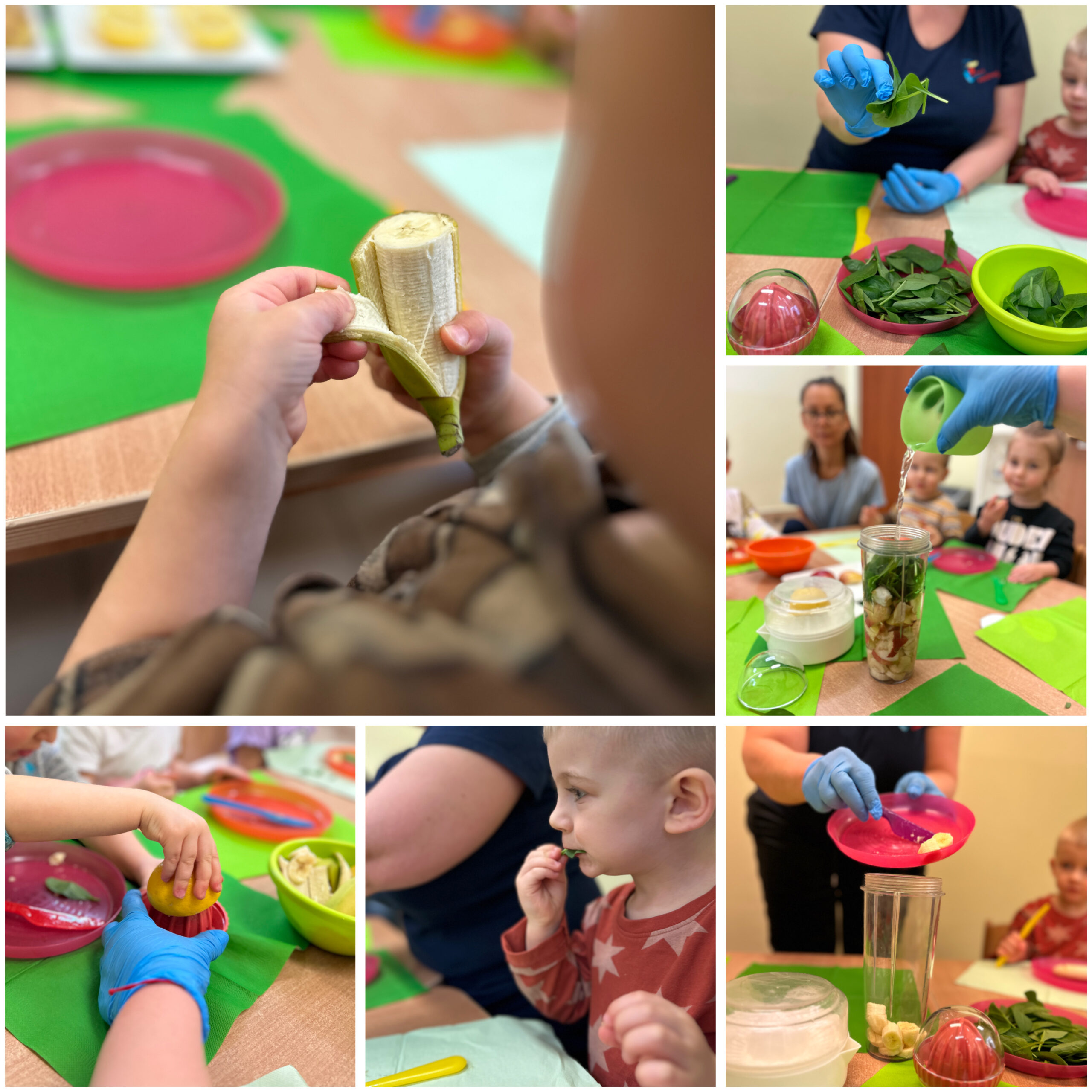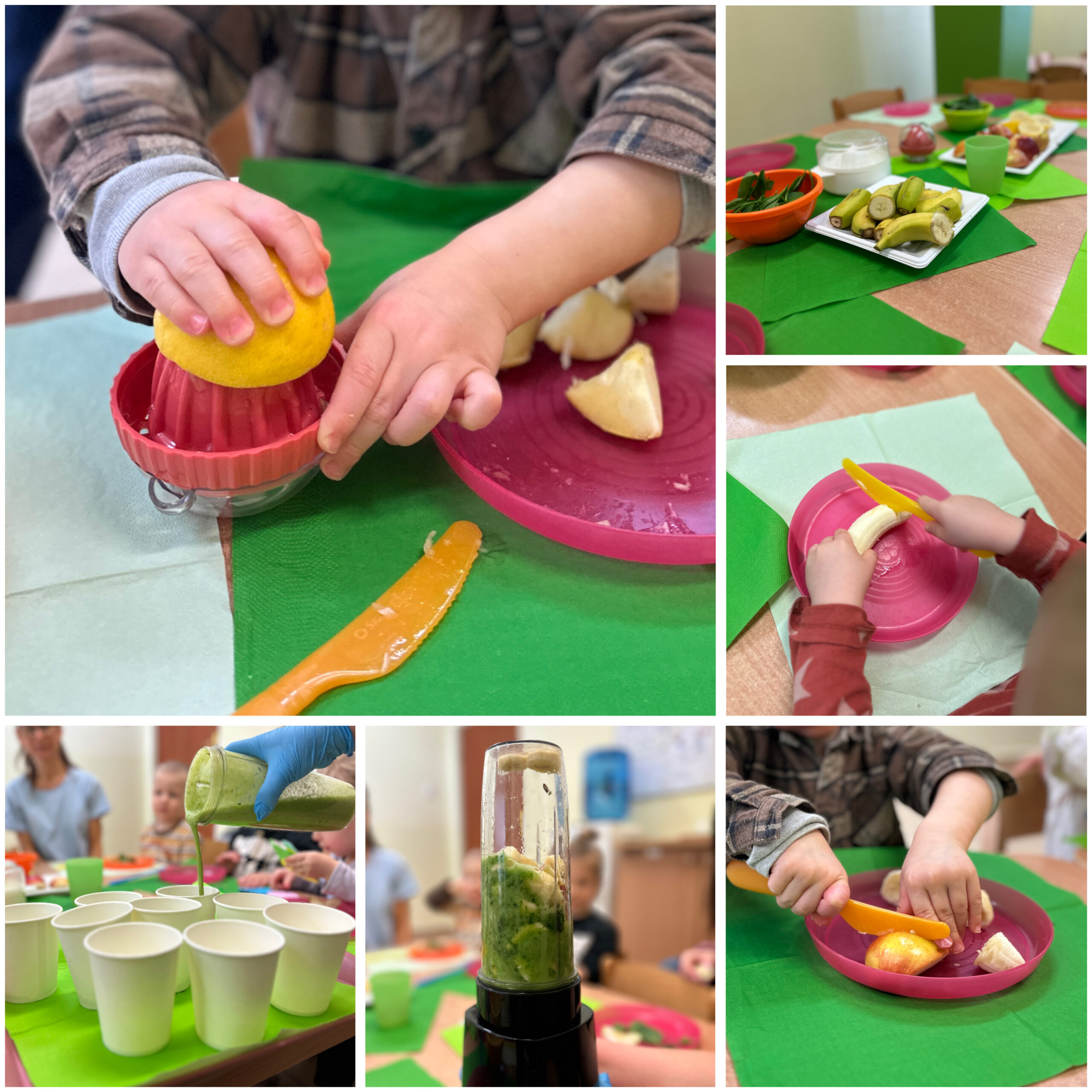 W ramach zajęć kulinarnych dzieci przygotowały zielony koktajl – bombę witaminową. Samodzielnie myły, kroiły i mieszały owoce oraz warzywa, obserwując zmiany kolorów i konsystencji. Degustacja przyniosła wiele radości, a dzieci uczyły się, że zdrowe jedzenie może być smaczne, kolorowe i przyjemne.